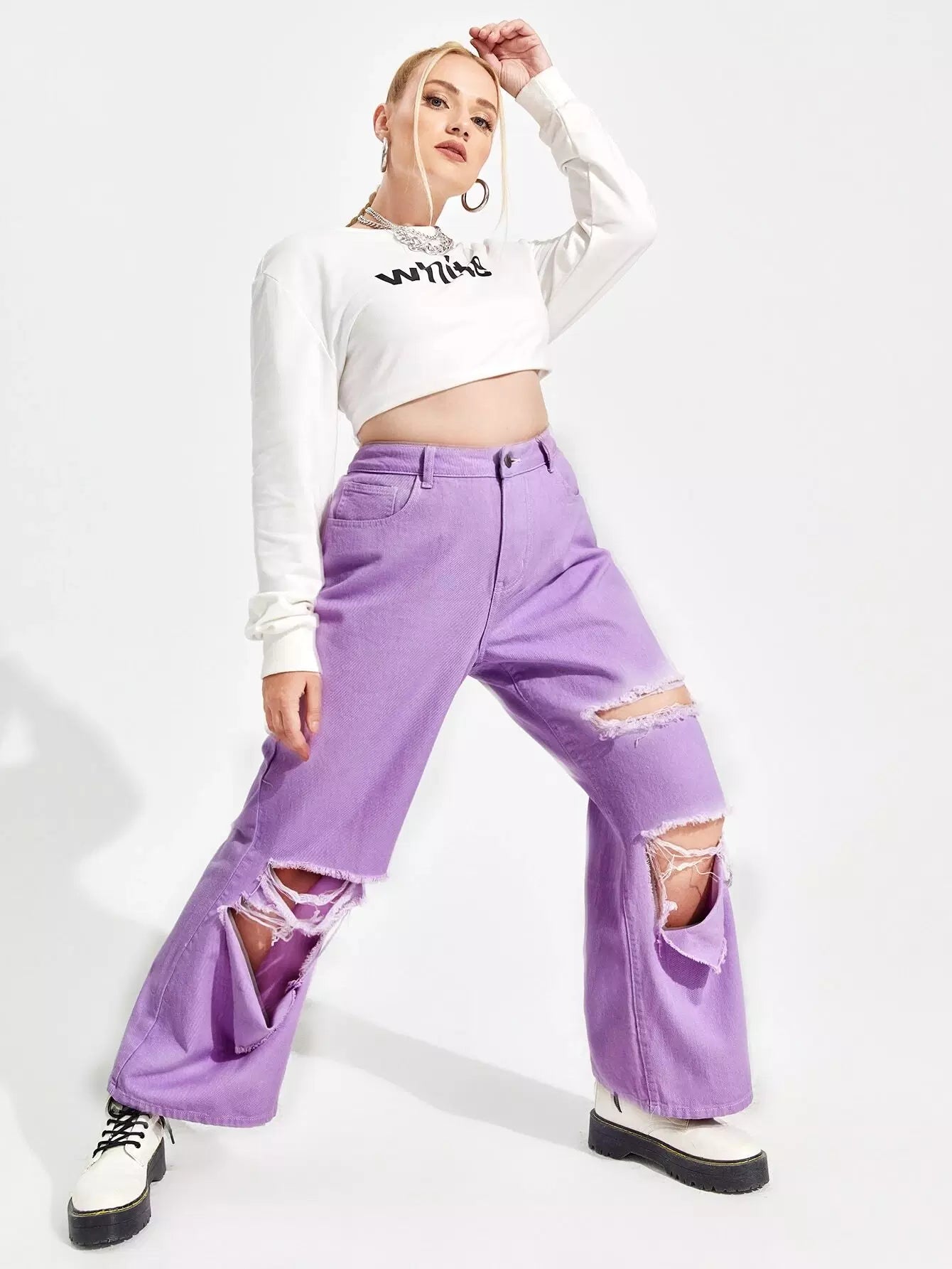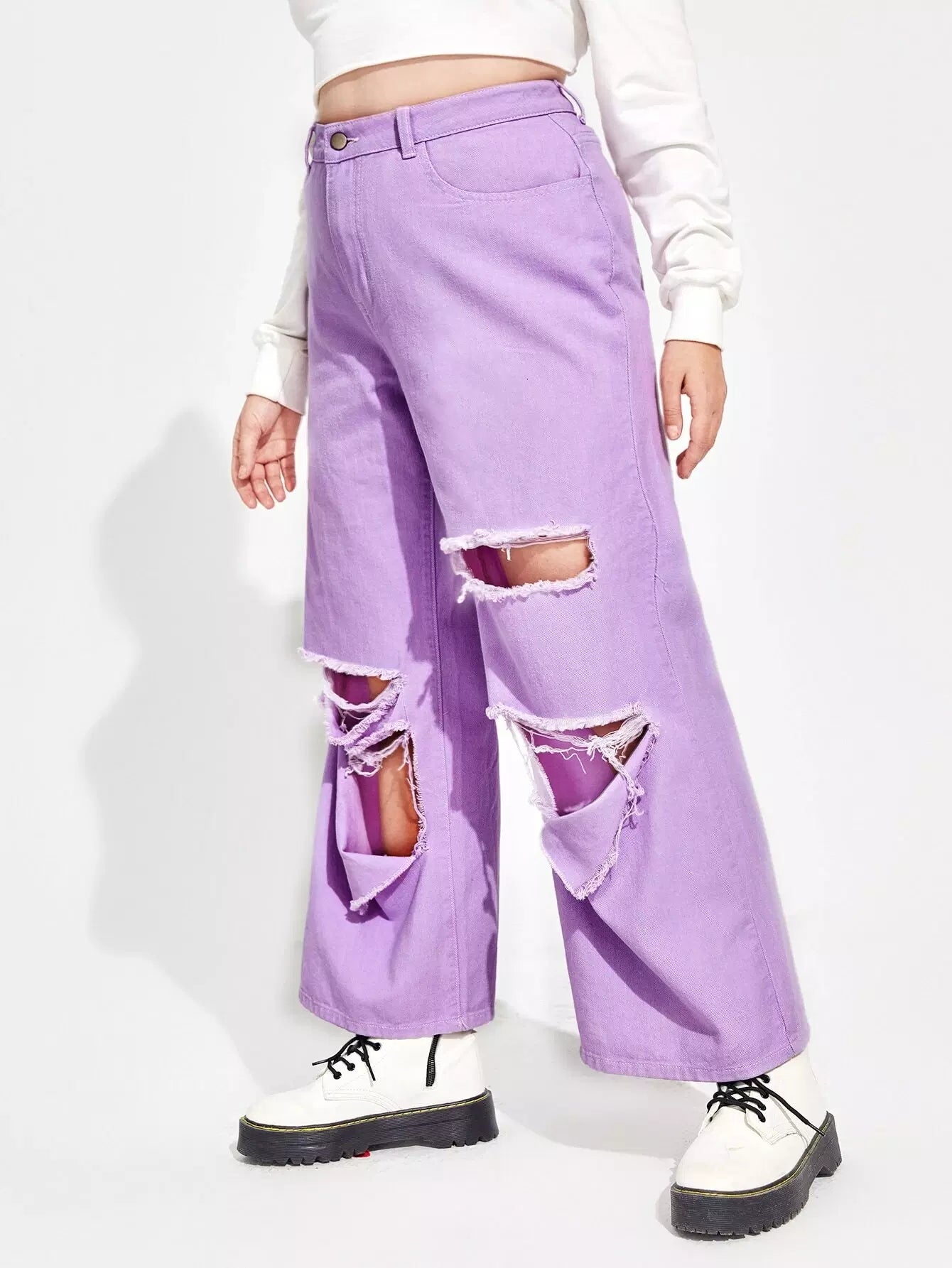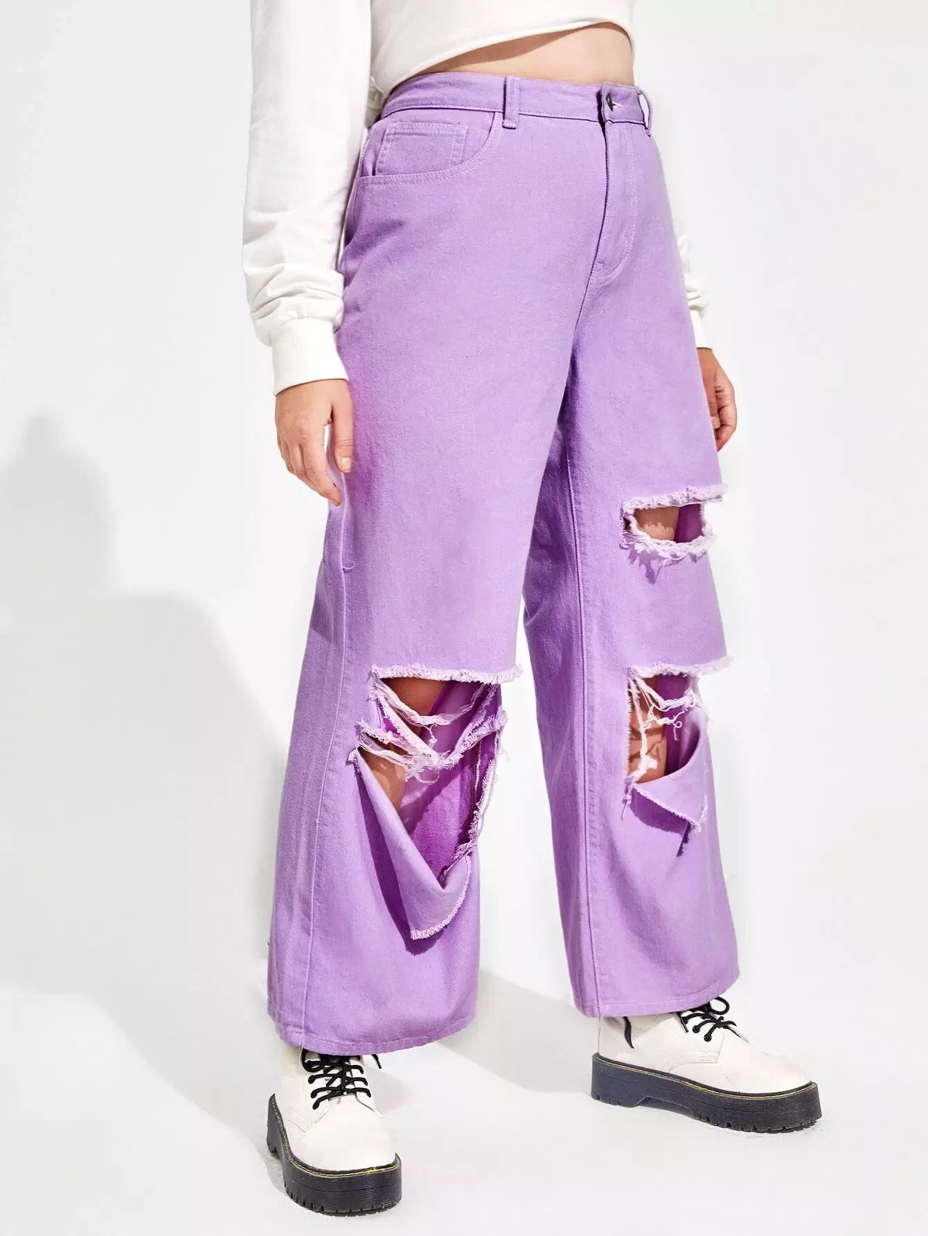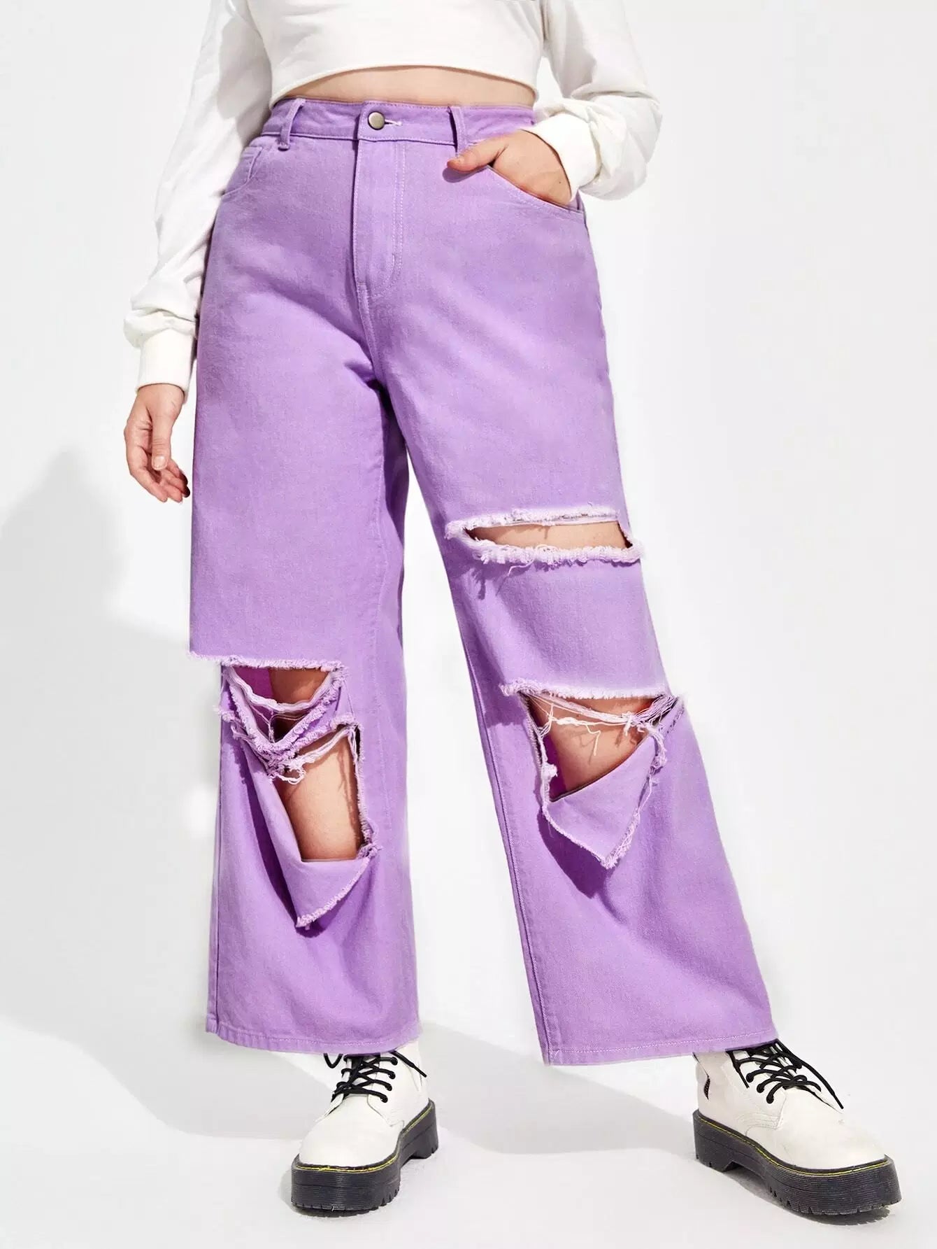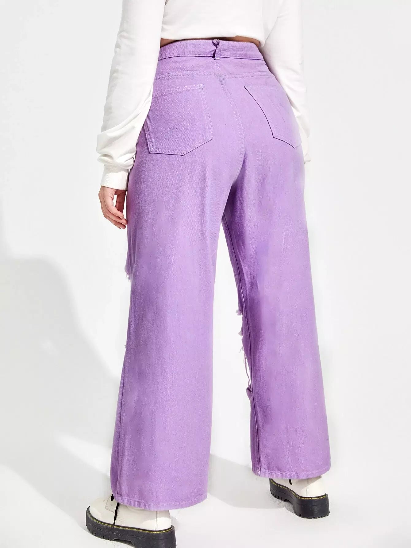 بنطلون جينز ممزق عالي الخصر وعريض الساقين زائد