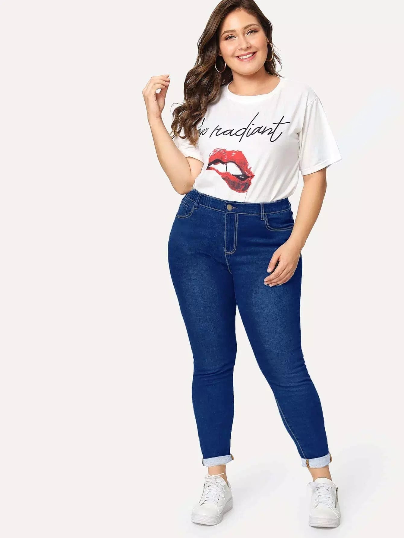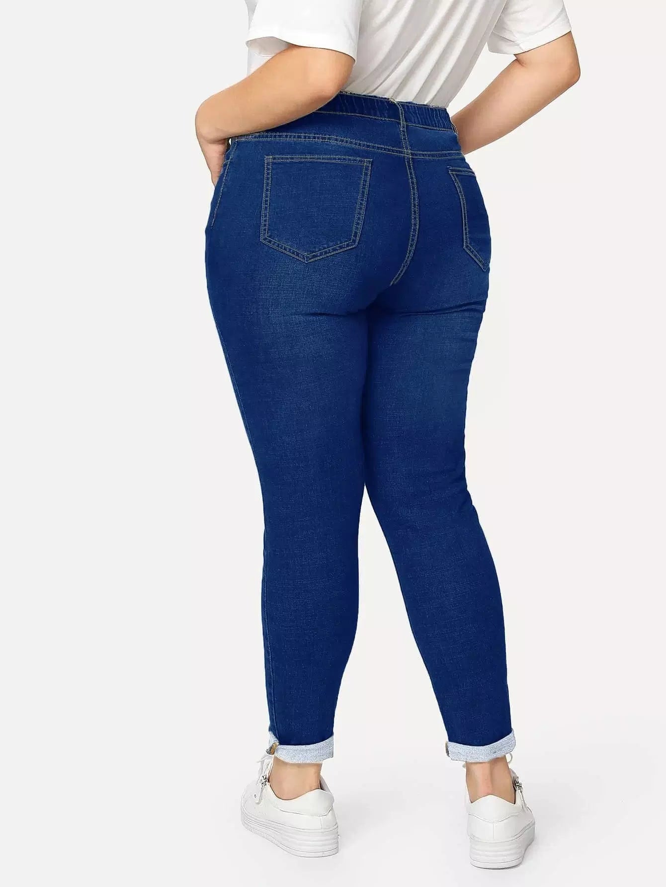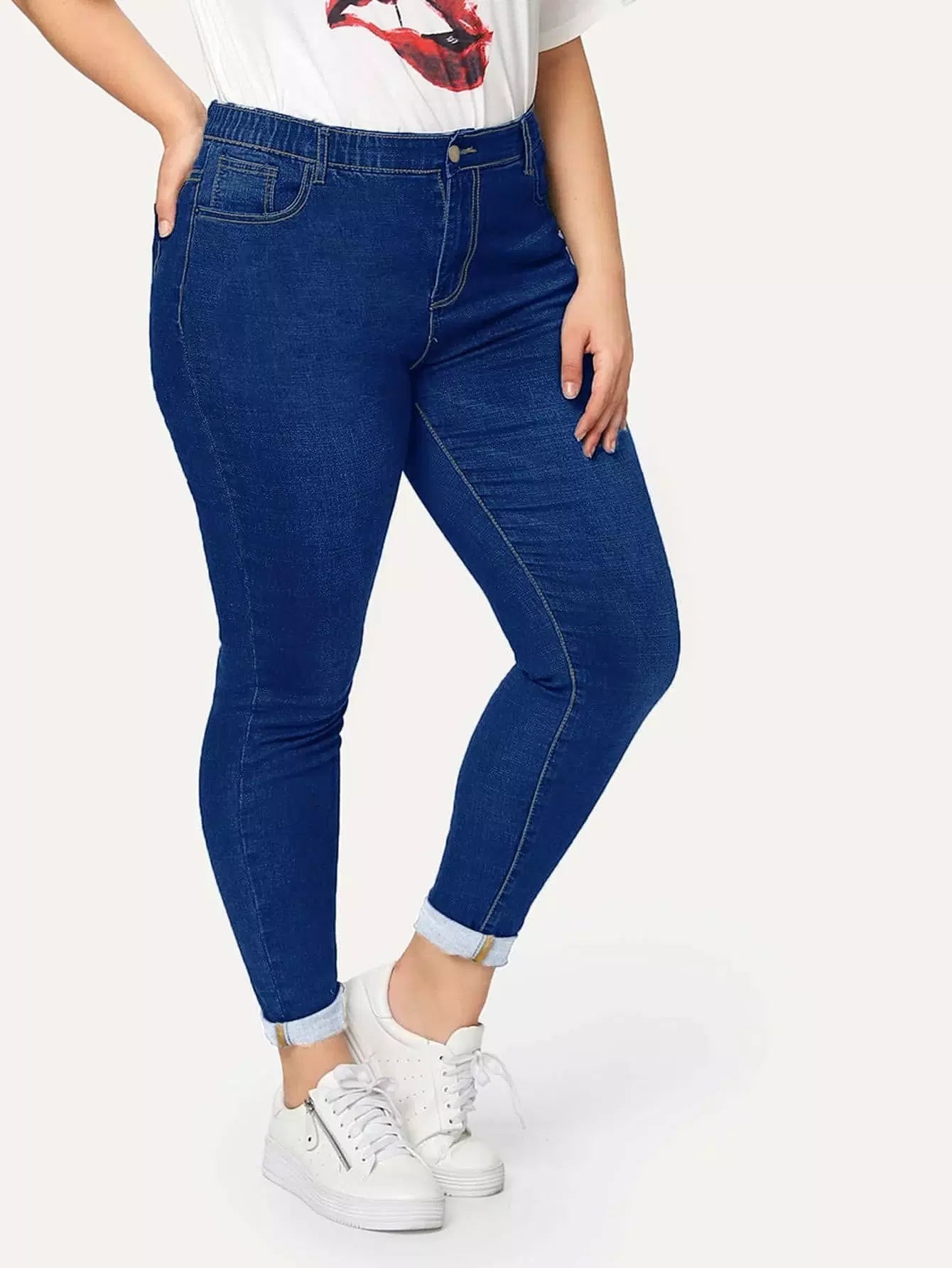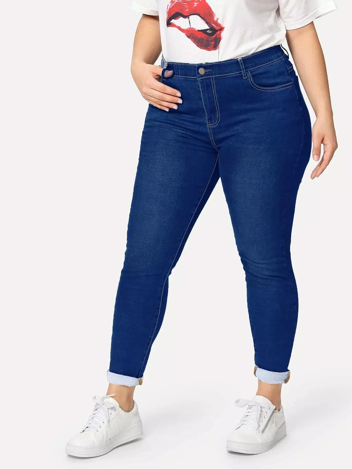بنطلون جينز سكيني بحاشية رول سكيني عالي الخصر بلس