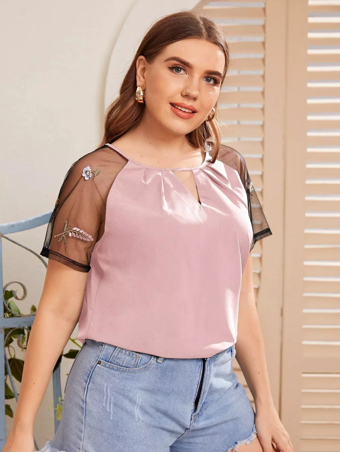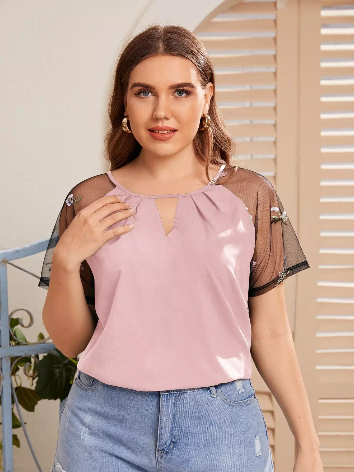 بلوزة برقبة بفتحة عنق زائد وتطريز شبكي بفتحة عنق زائد