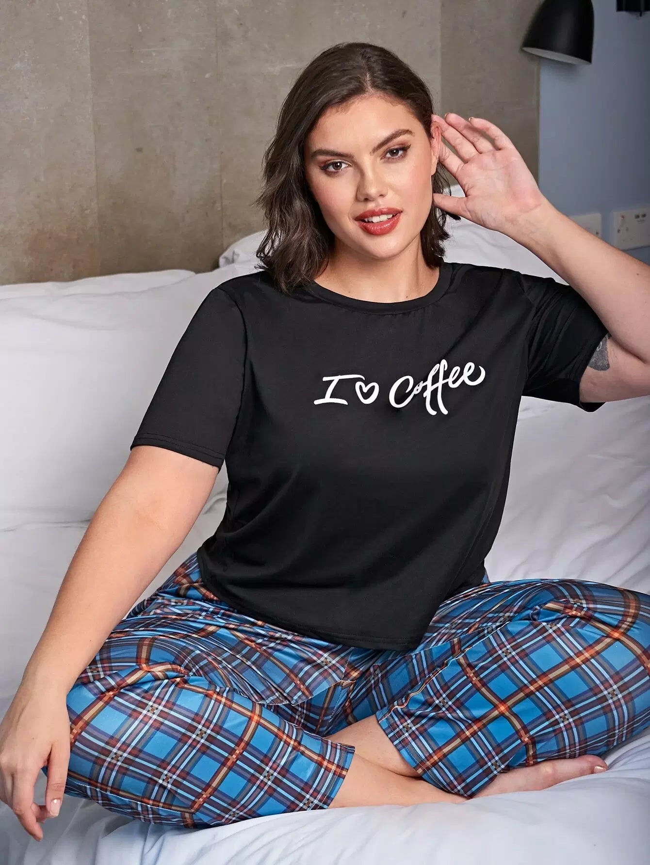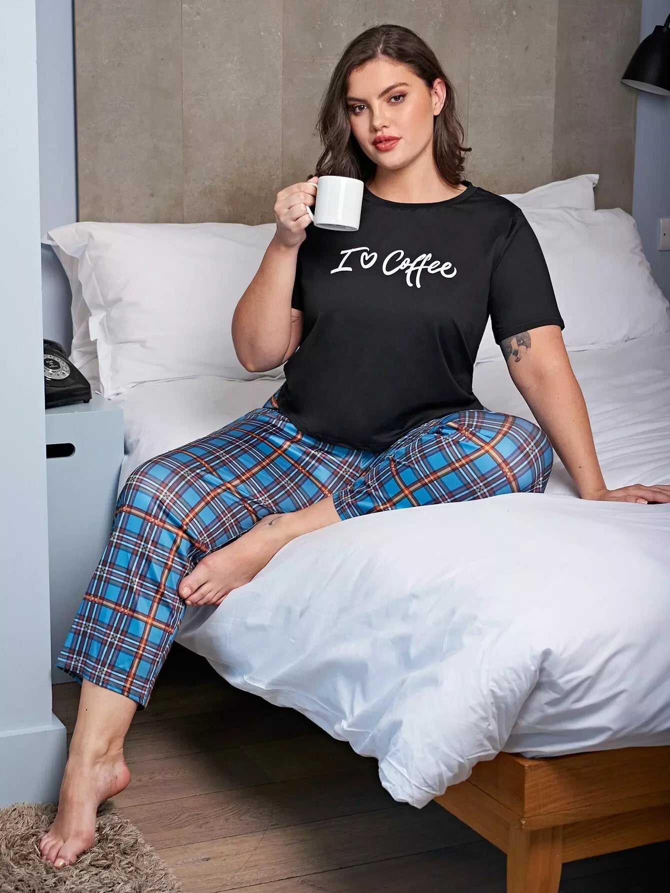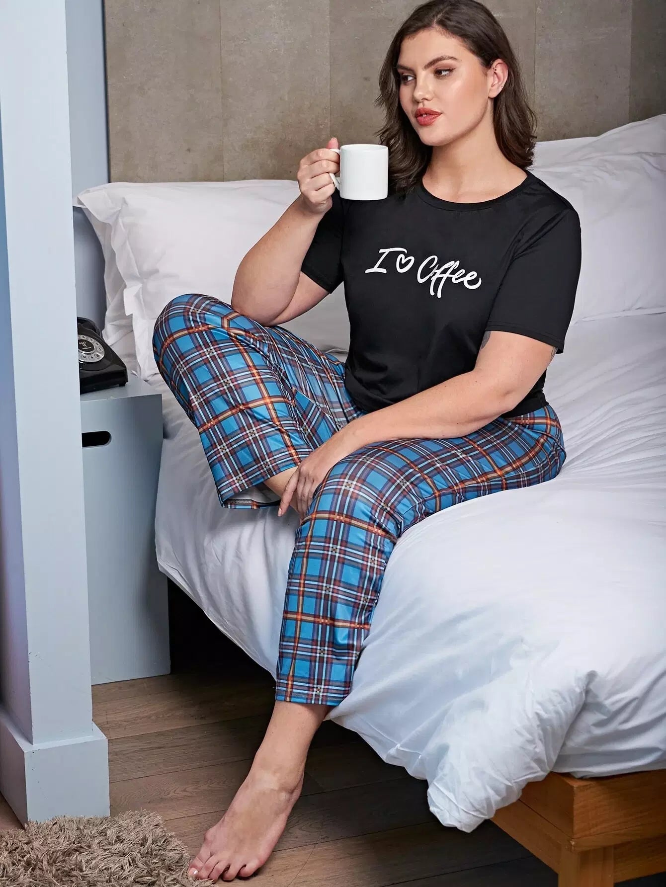 طقم تي شيرت برسومات حروف زائد وبنطال بيجامة منقوش