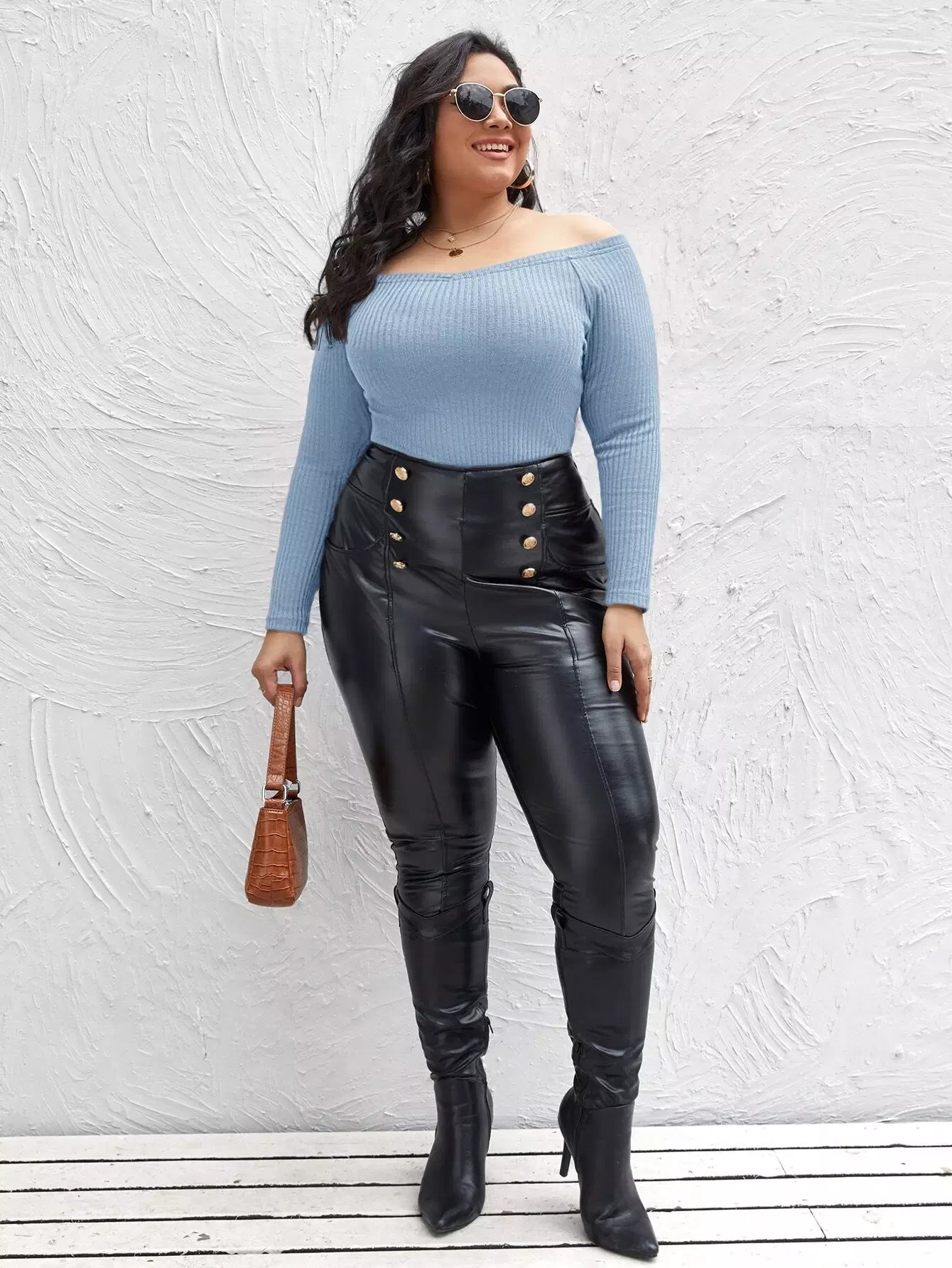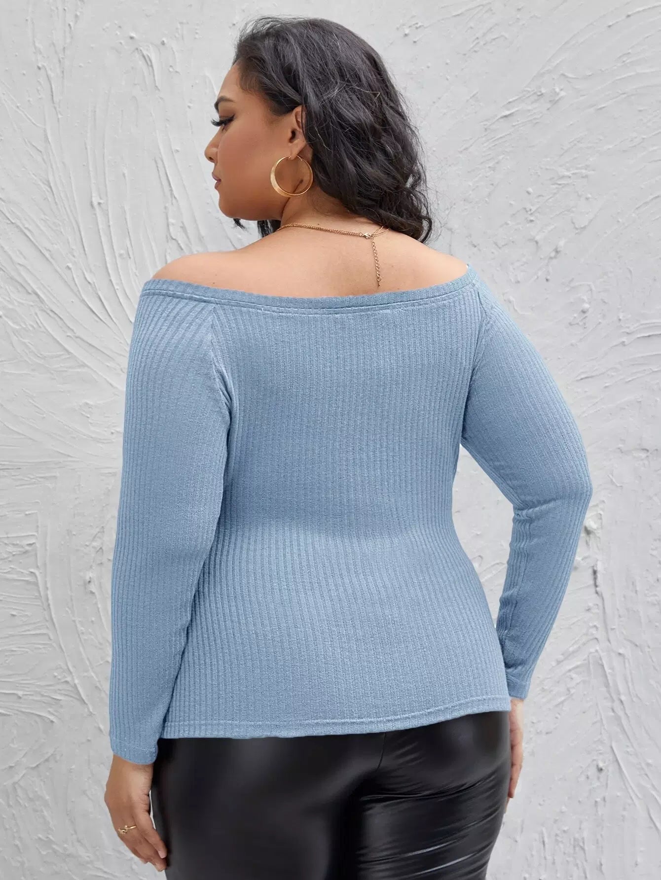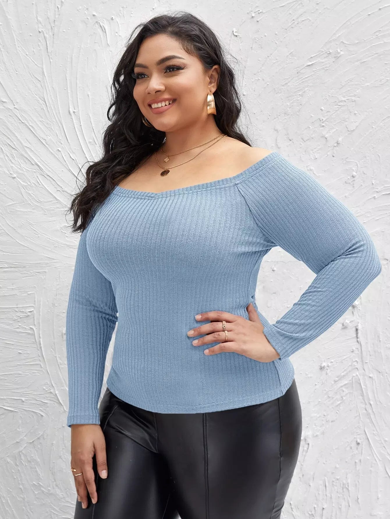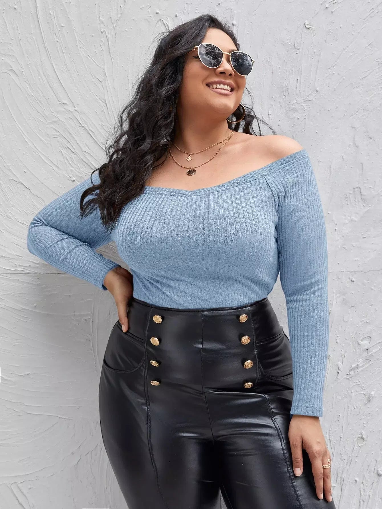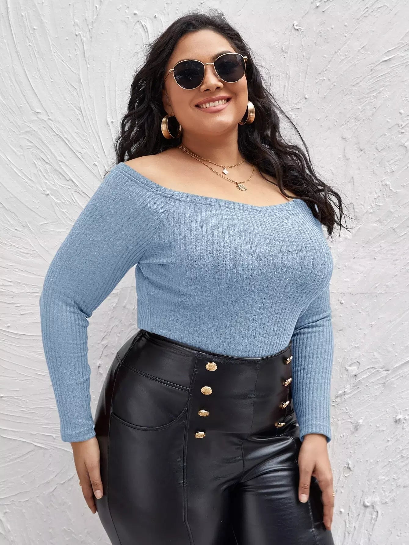 تي شيرت بدون أكتاف محبوك على شكل ضلع محبوك بلاس