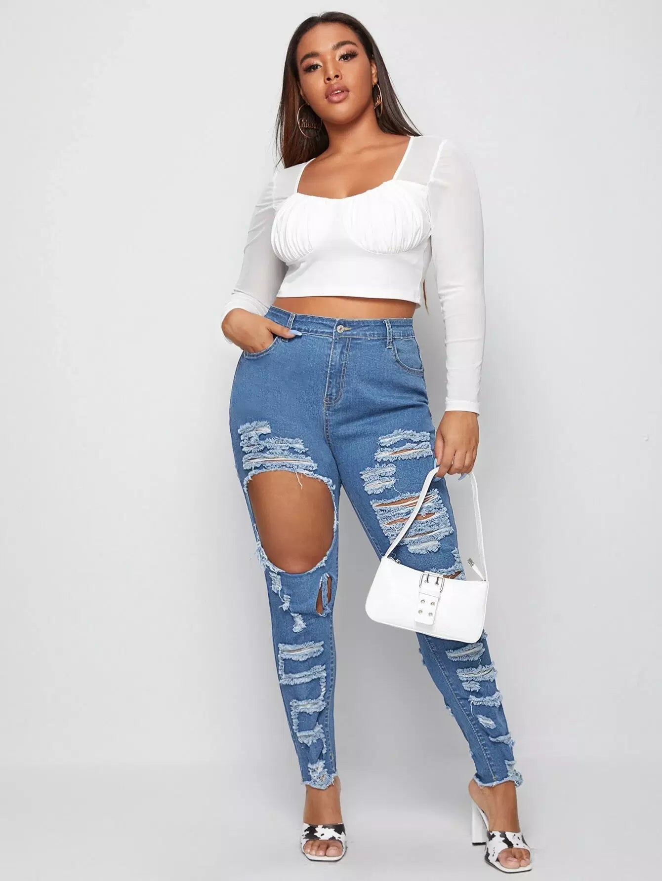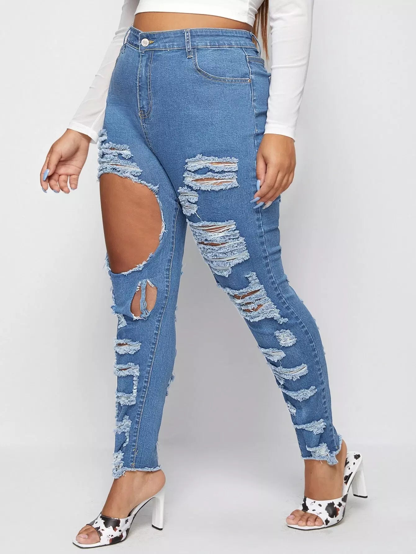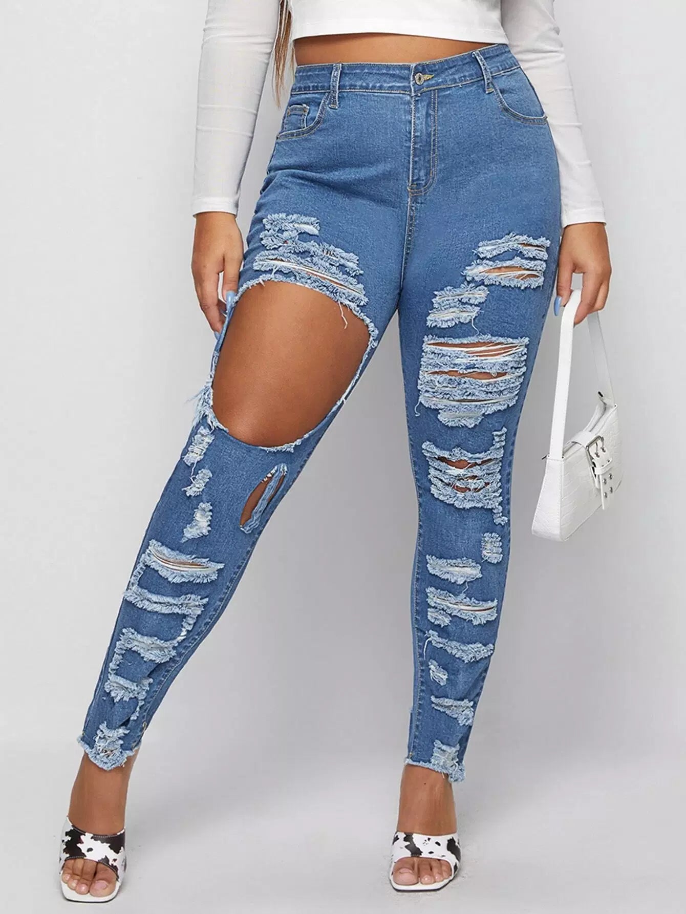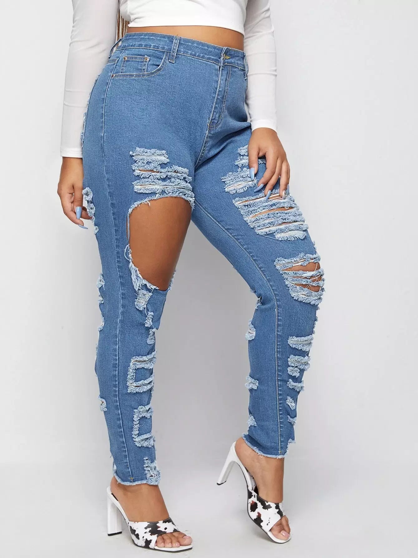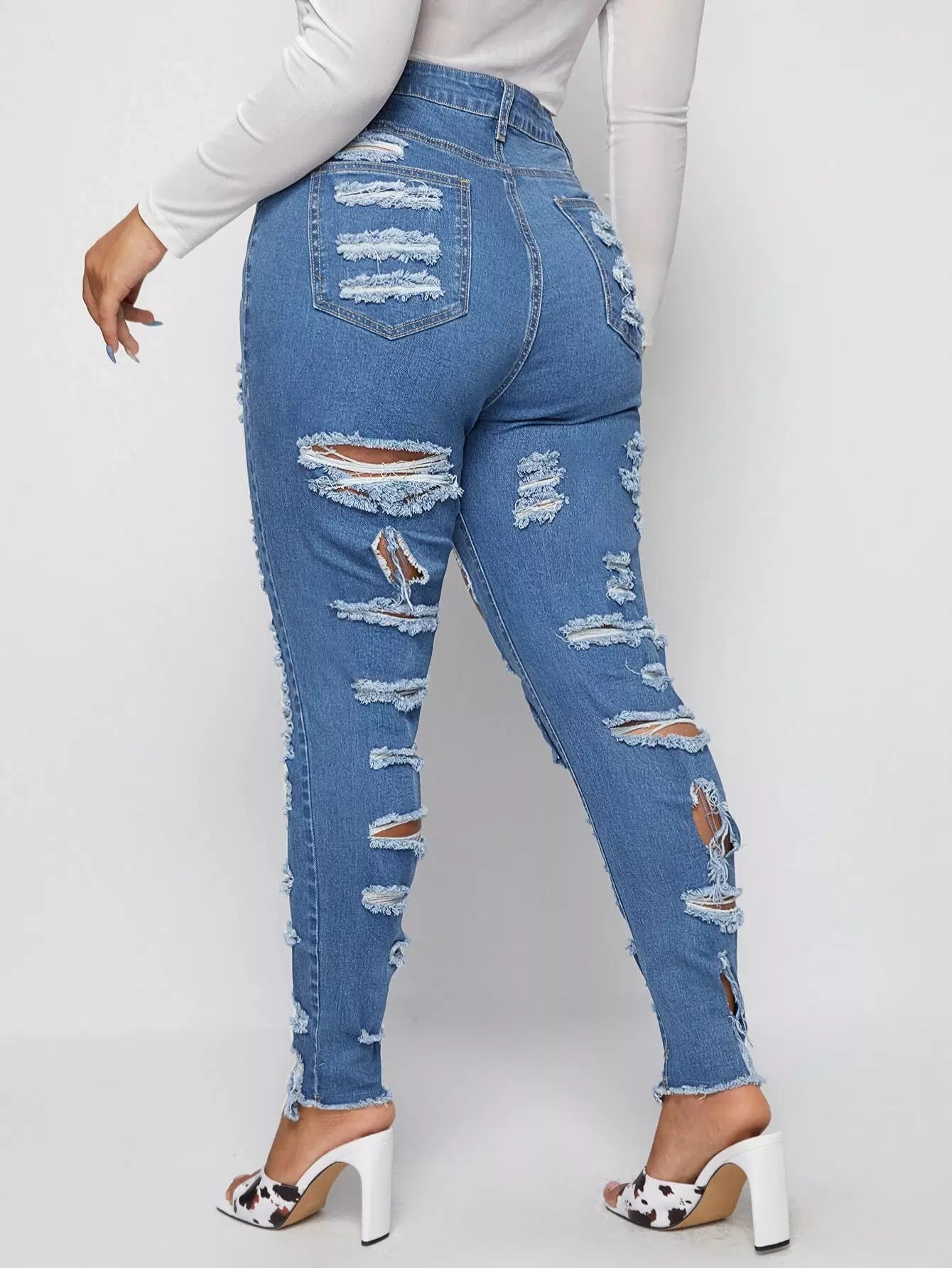 بنطلون جينز ممزق بحاشية ممزقة زائد خام