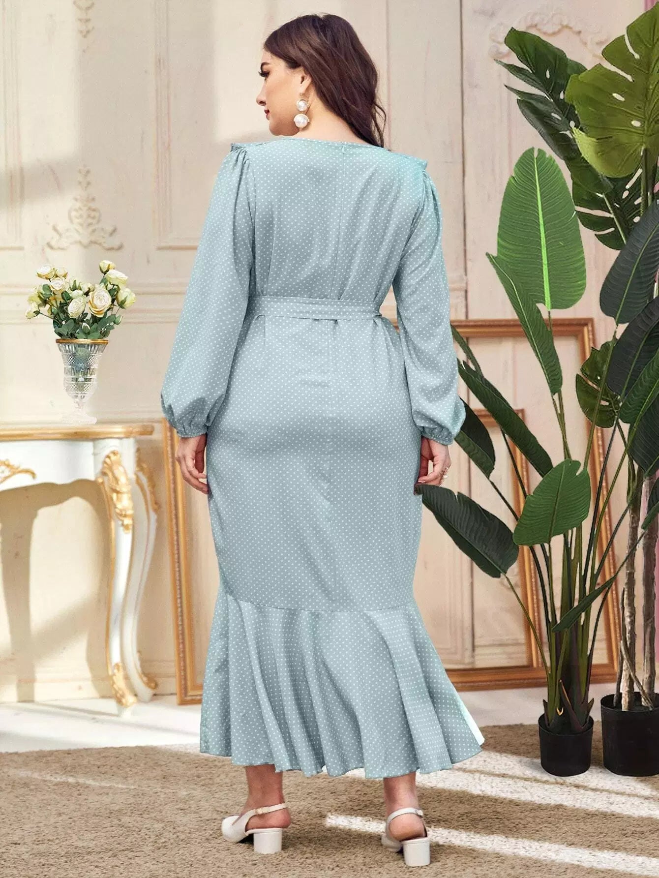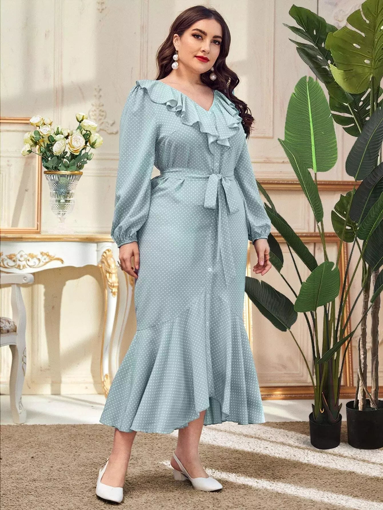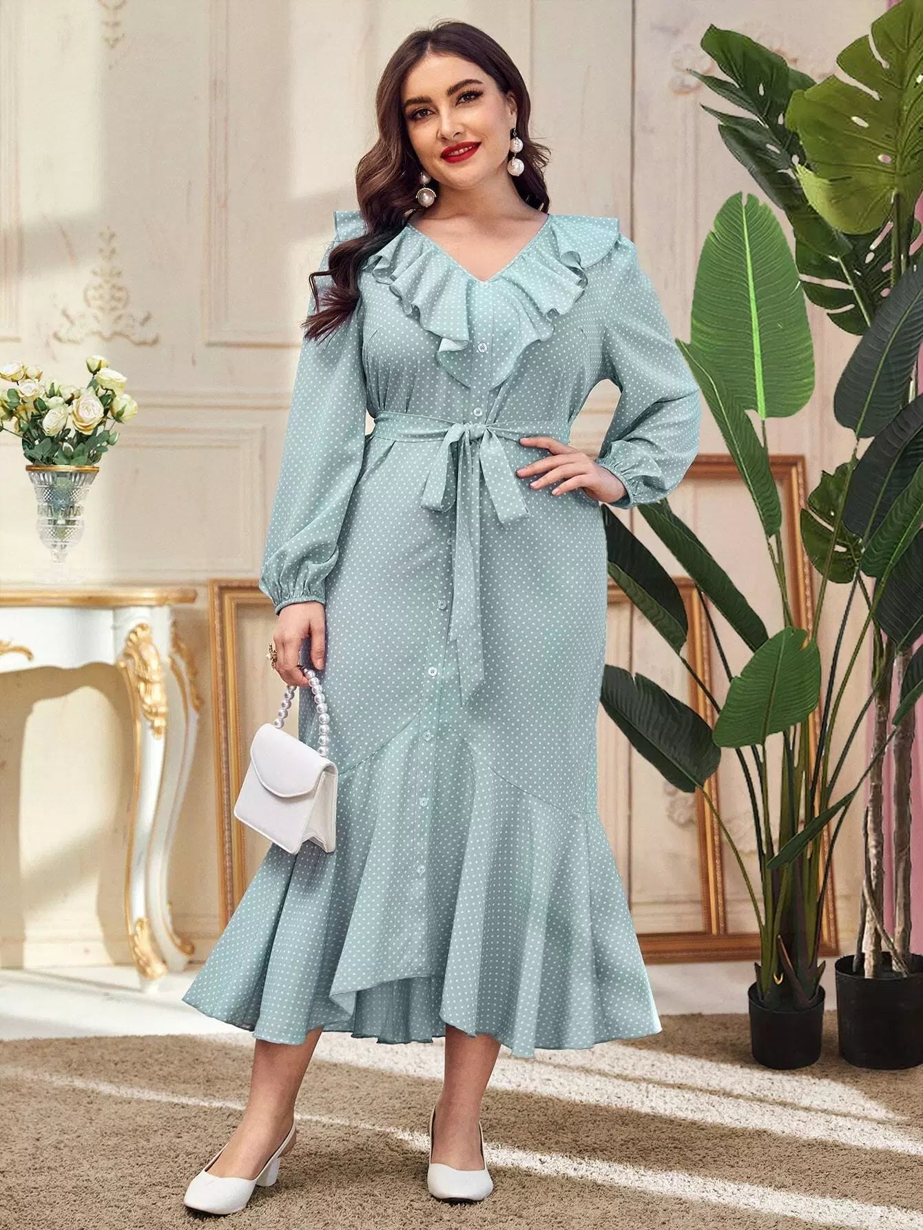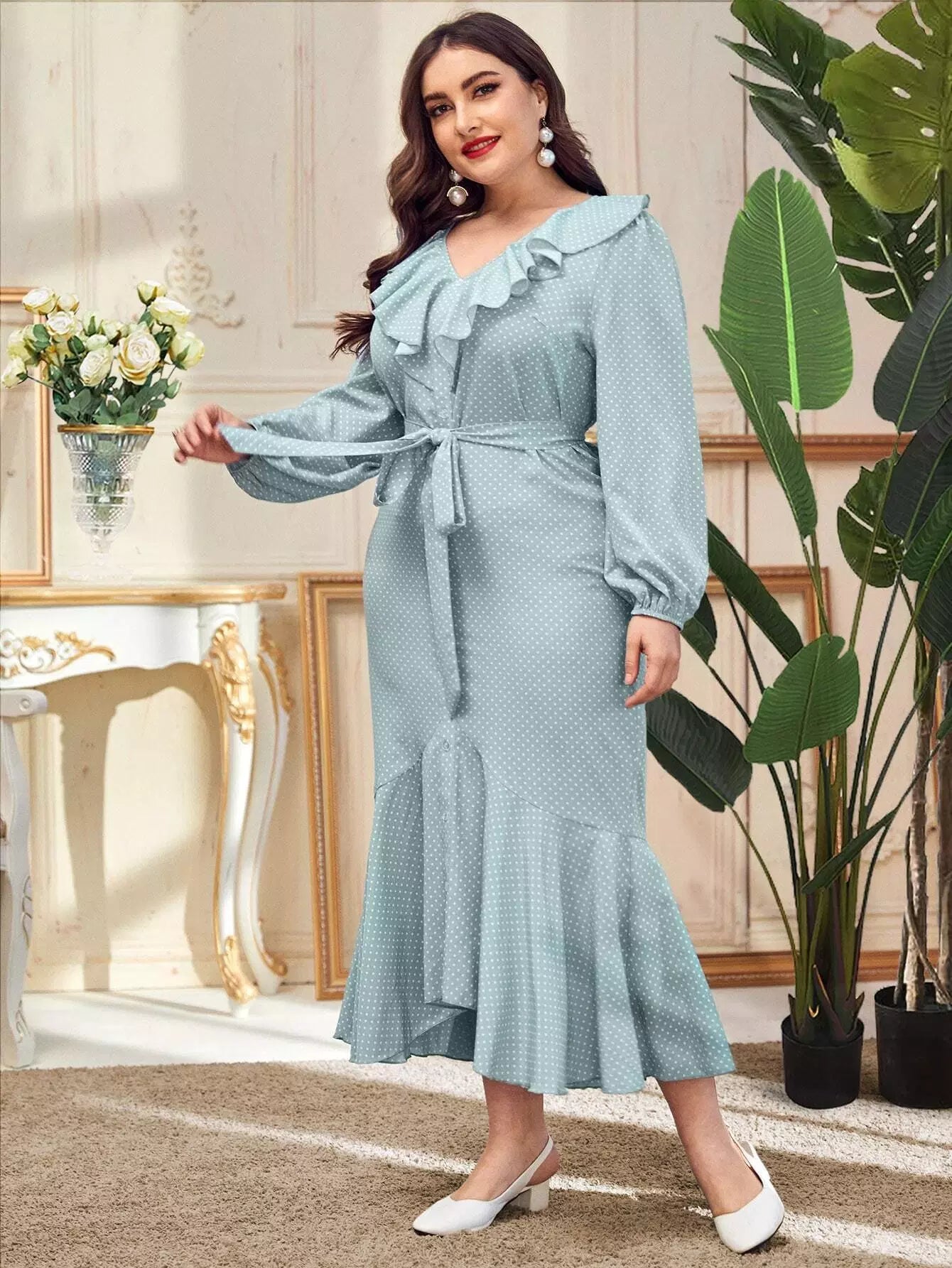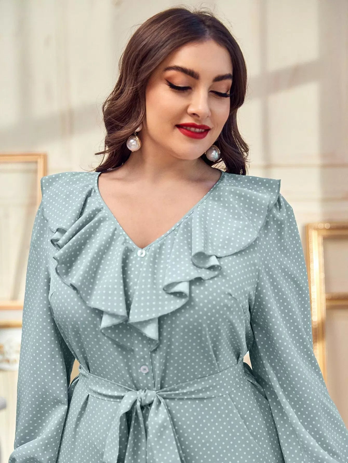 نحيف - مقاس كبير فستان دلماسي بحزام ذاتي وكشكش