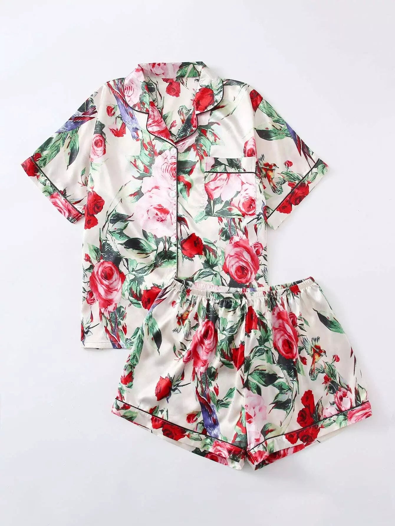 طقم بيجامة ساتان بلون زهري متباين زهور بلون زائد