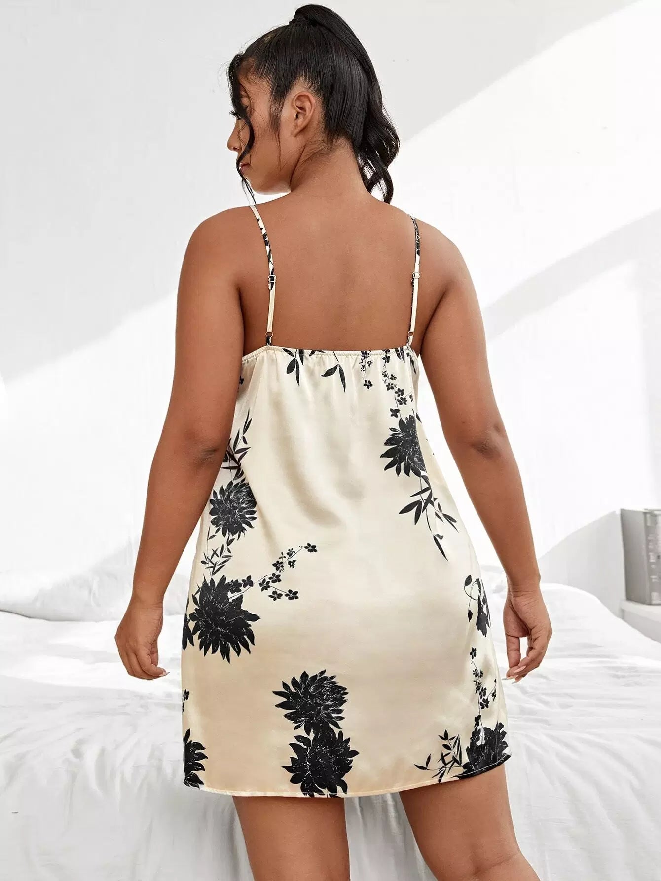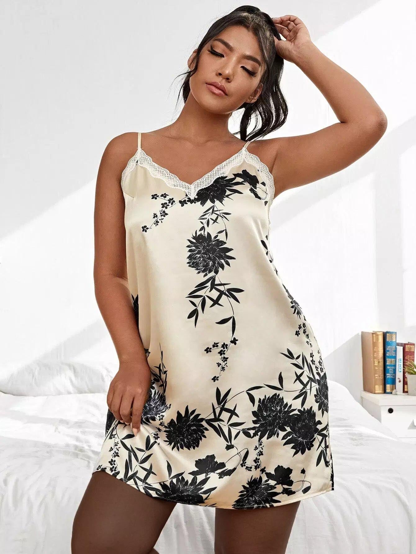 فستان ساتان ساتان بطبعة زهور بلون متباين من الدانتيل