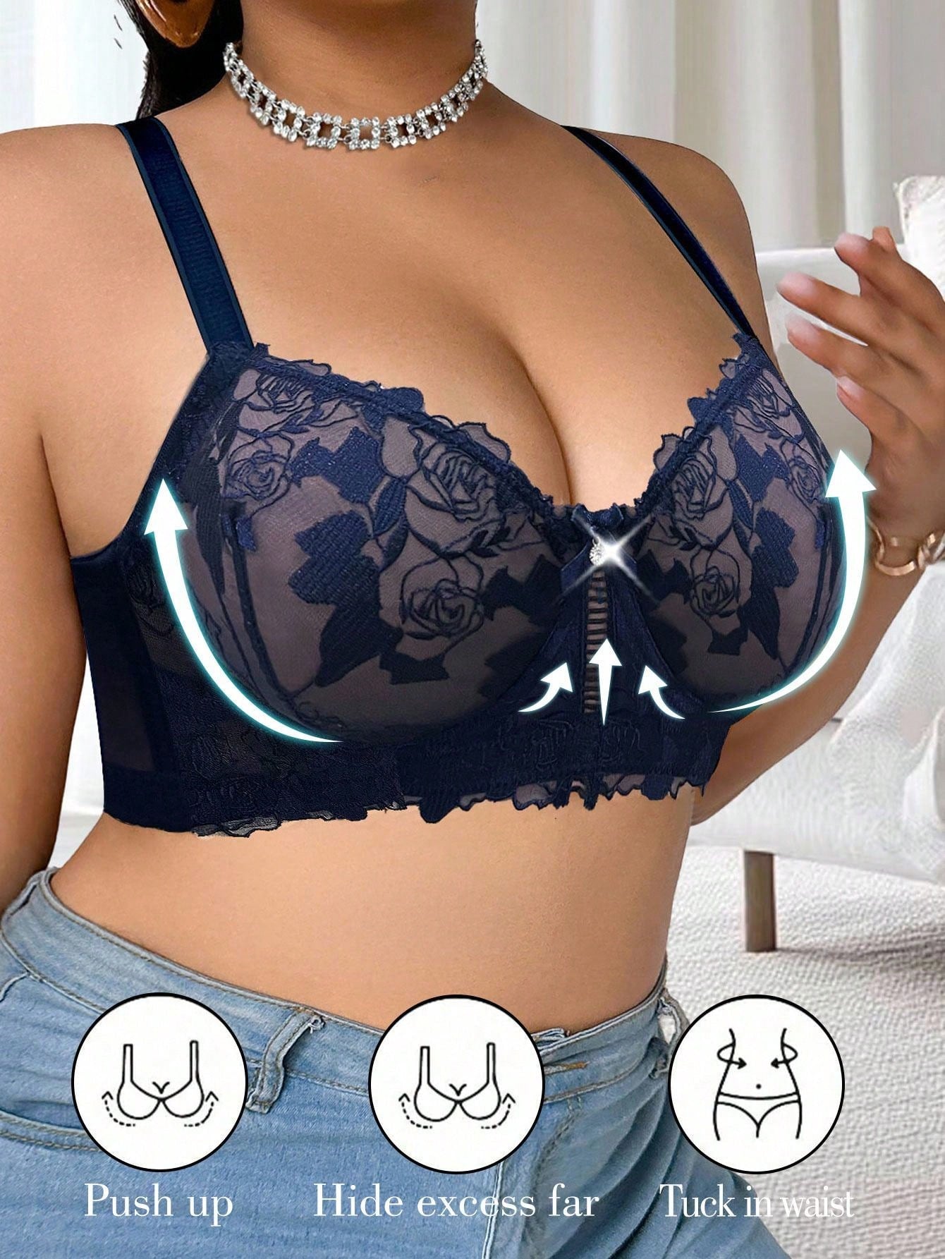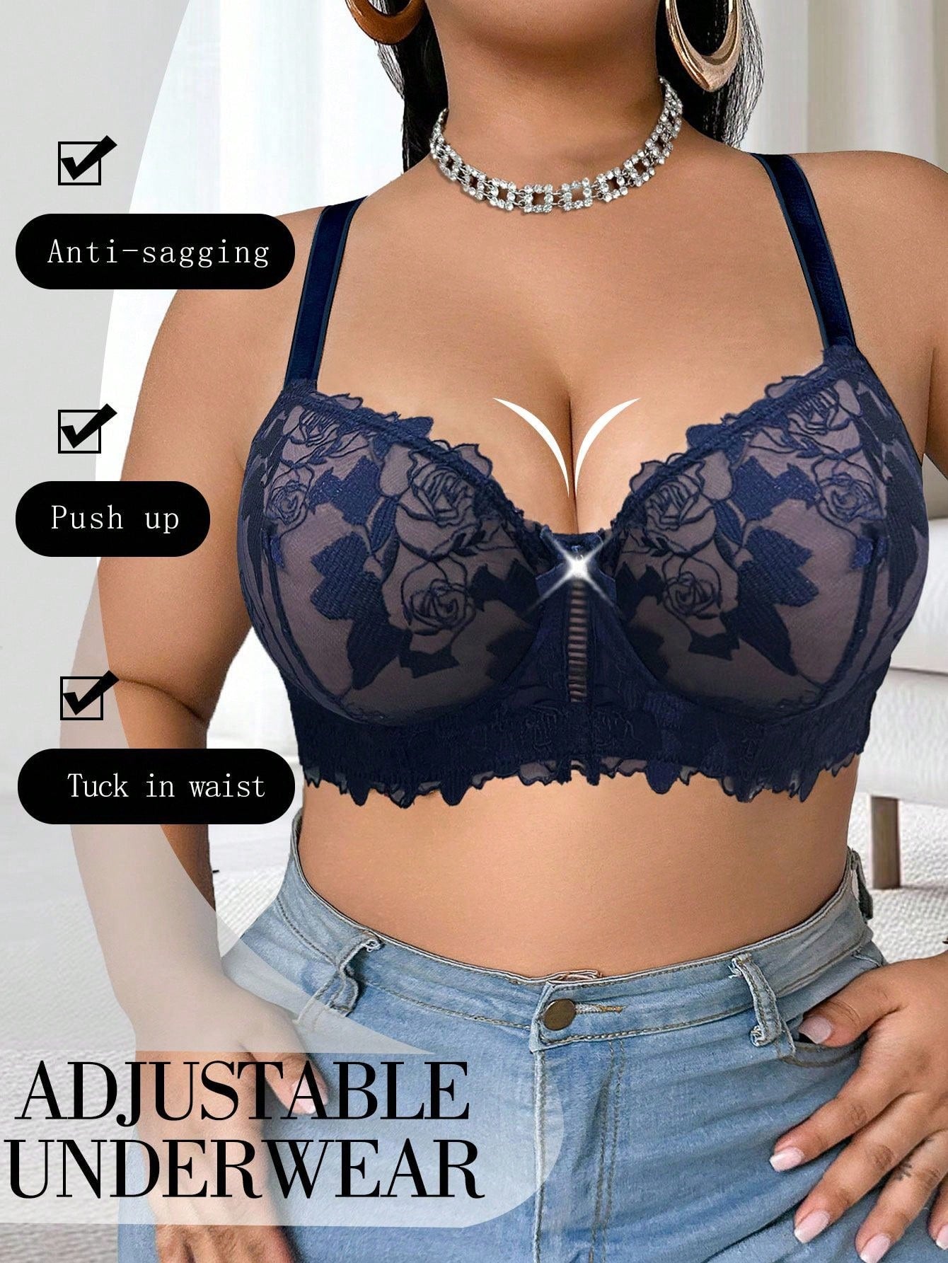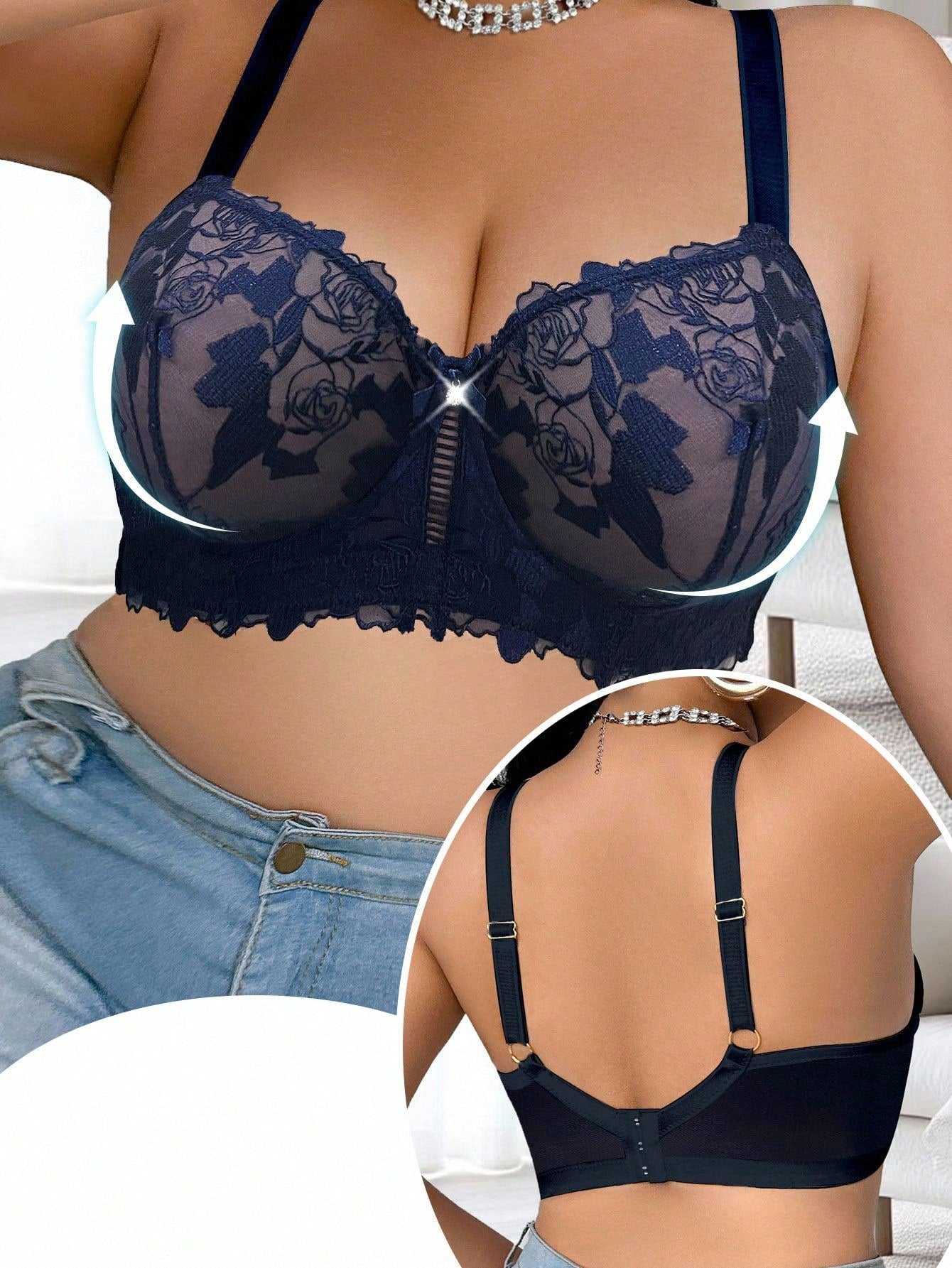 حمالة صدر أنيقة بدون حمالات، مصنوعة من قماش شبكي أزرق شفاف بمقاسات كبيرة، مزينة بدانتيل متباين اللون، بتصميم يرفع الصدر.
