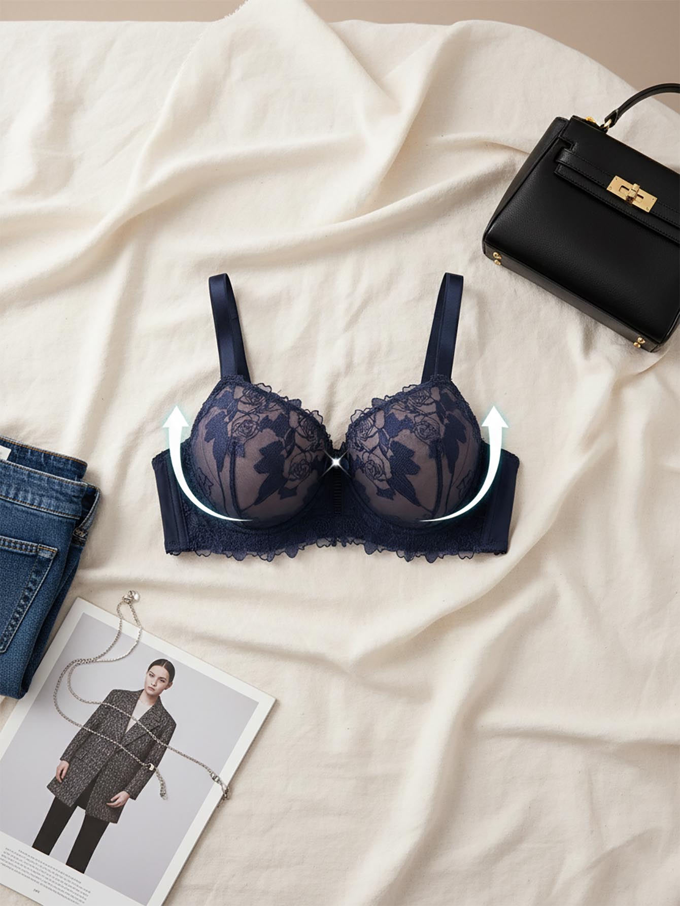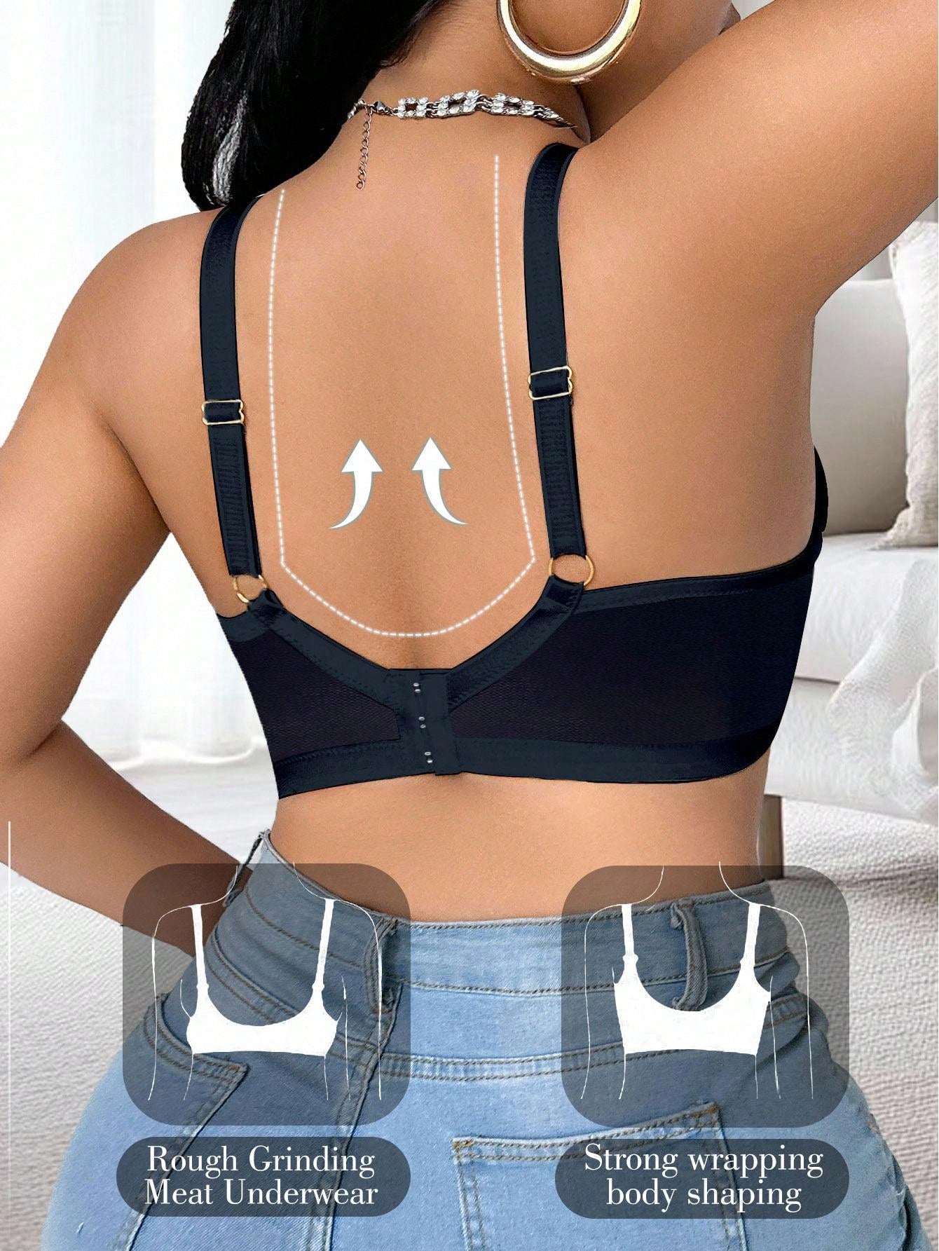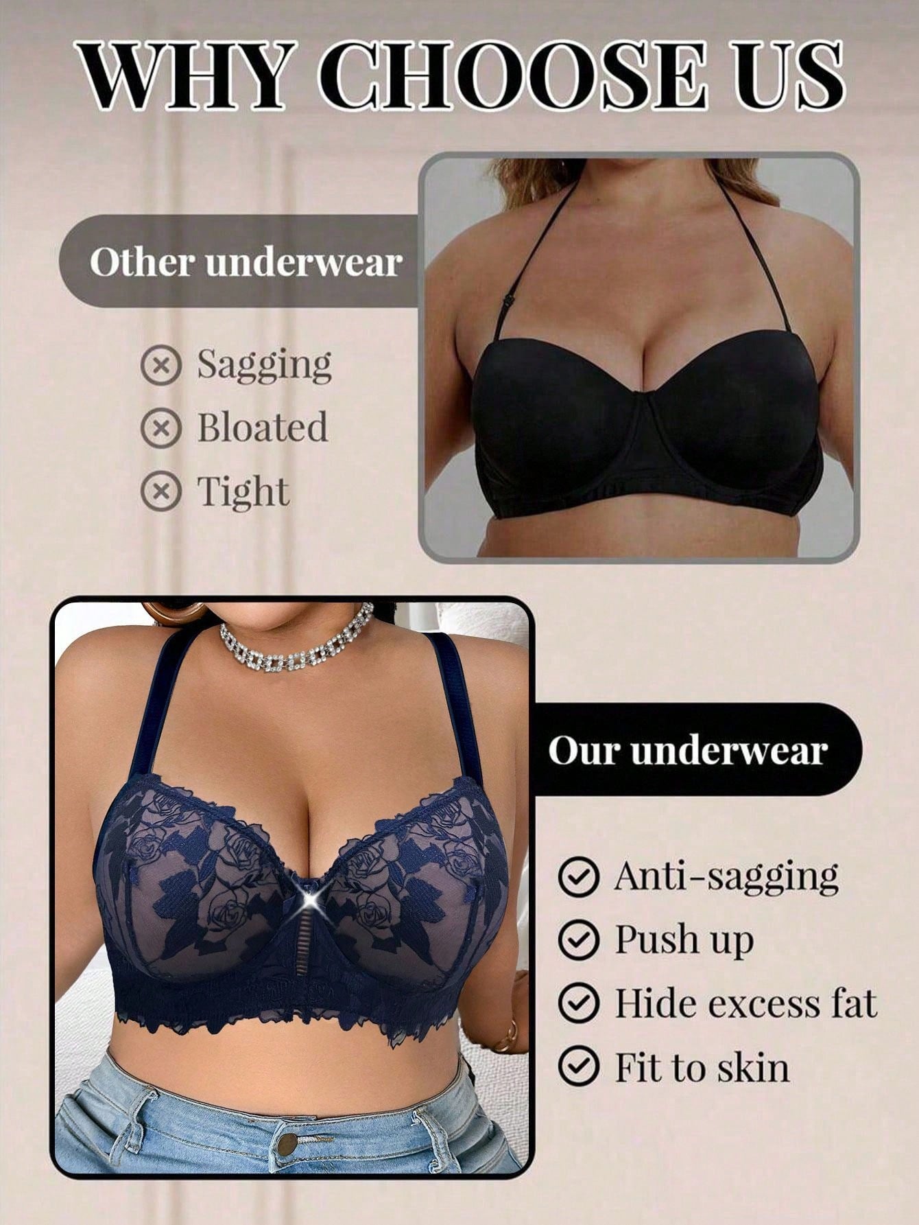 حمالة صدر أنيقة بدون حمالات، مصنوعة من قماش شبكي أزرق شفاف بمقاسات كبيرة، مزينة بدانتيل متباين اللون، بتصميم يرفع الصدر.