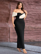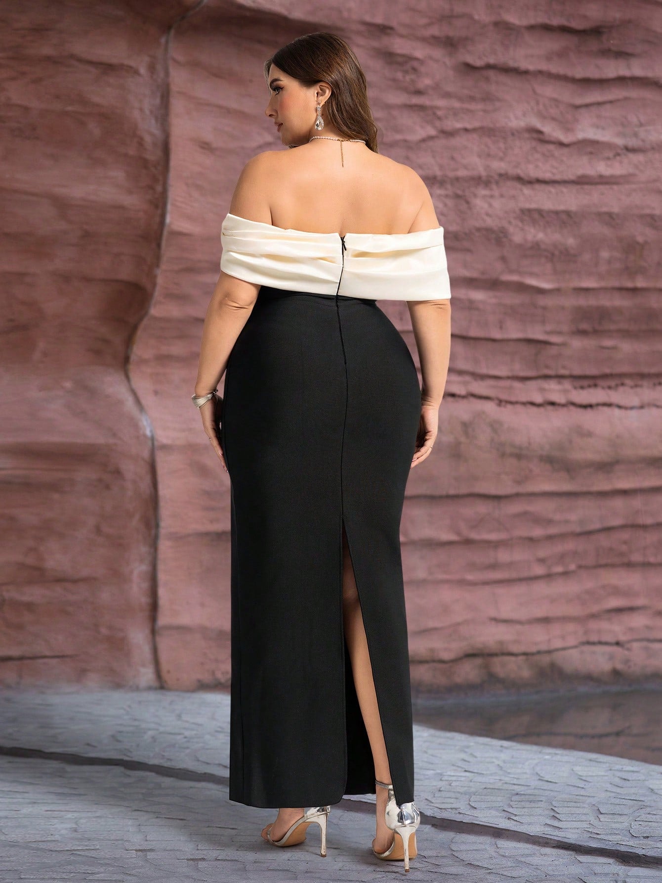 فستان سهرة ضيق بكتفين مكشوفين بتصميم ملتف، متوفر بمقاسات كبيرة، بلون متباين.