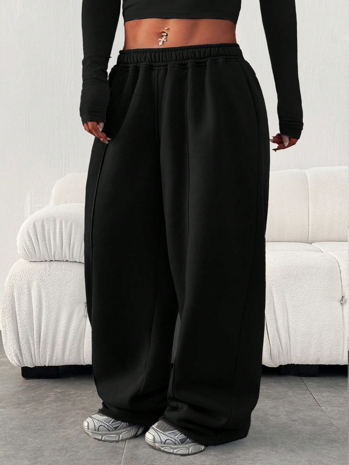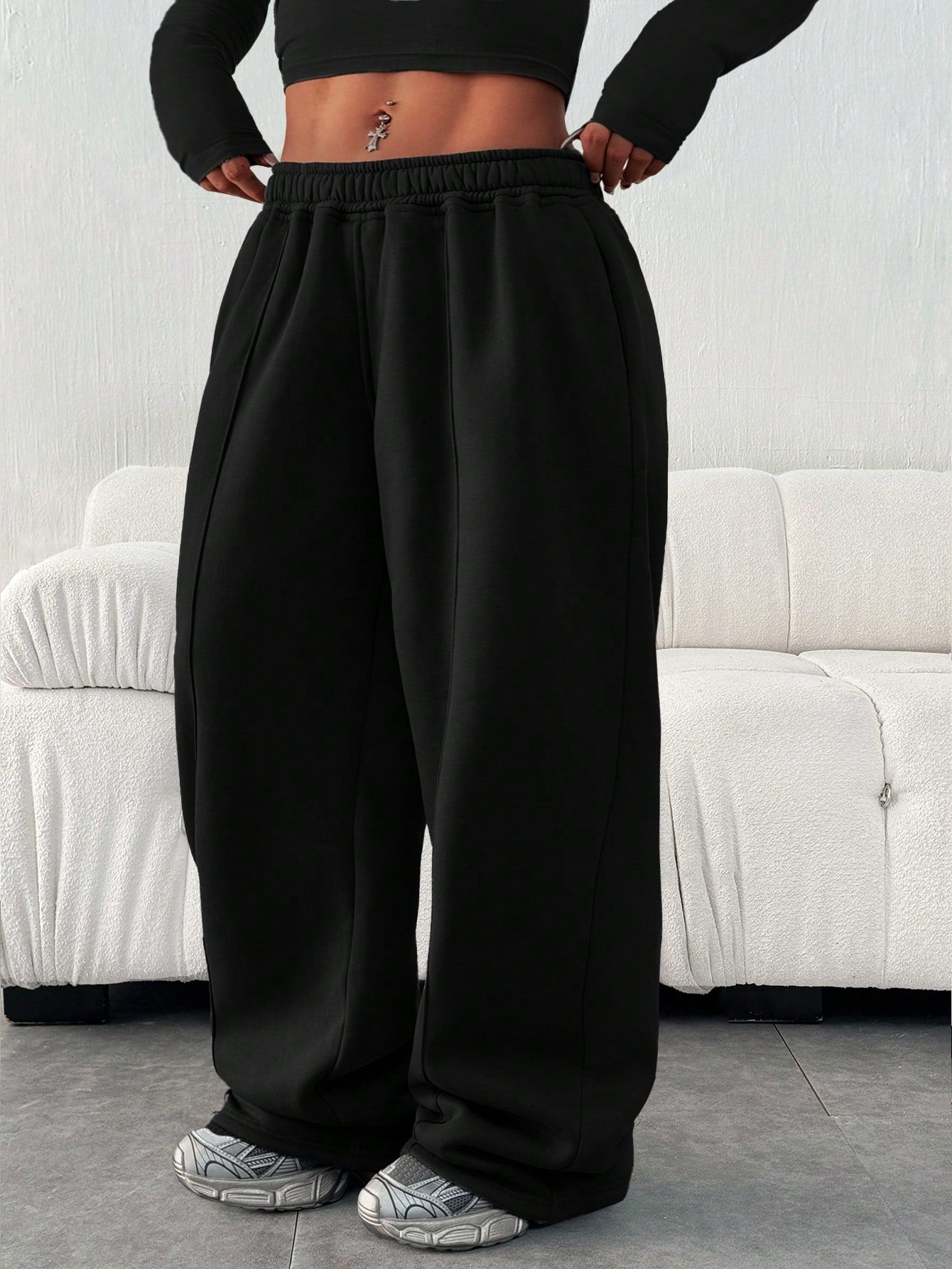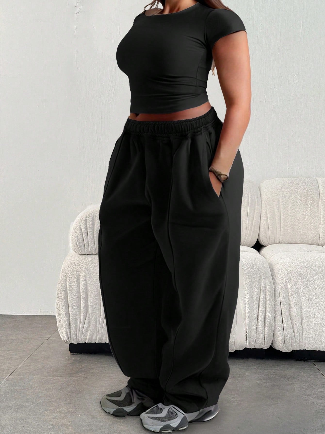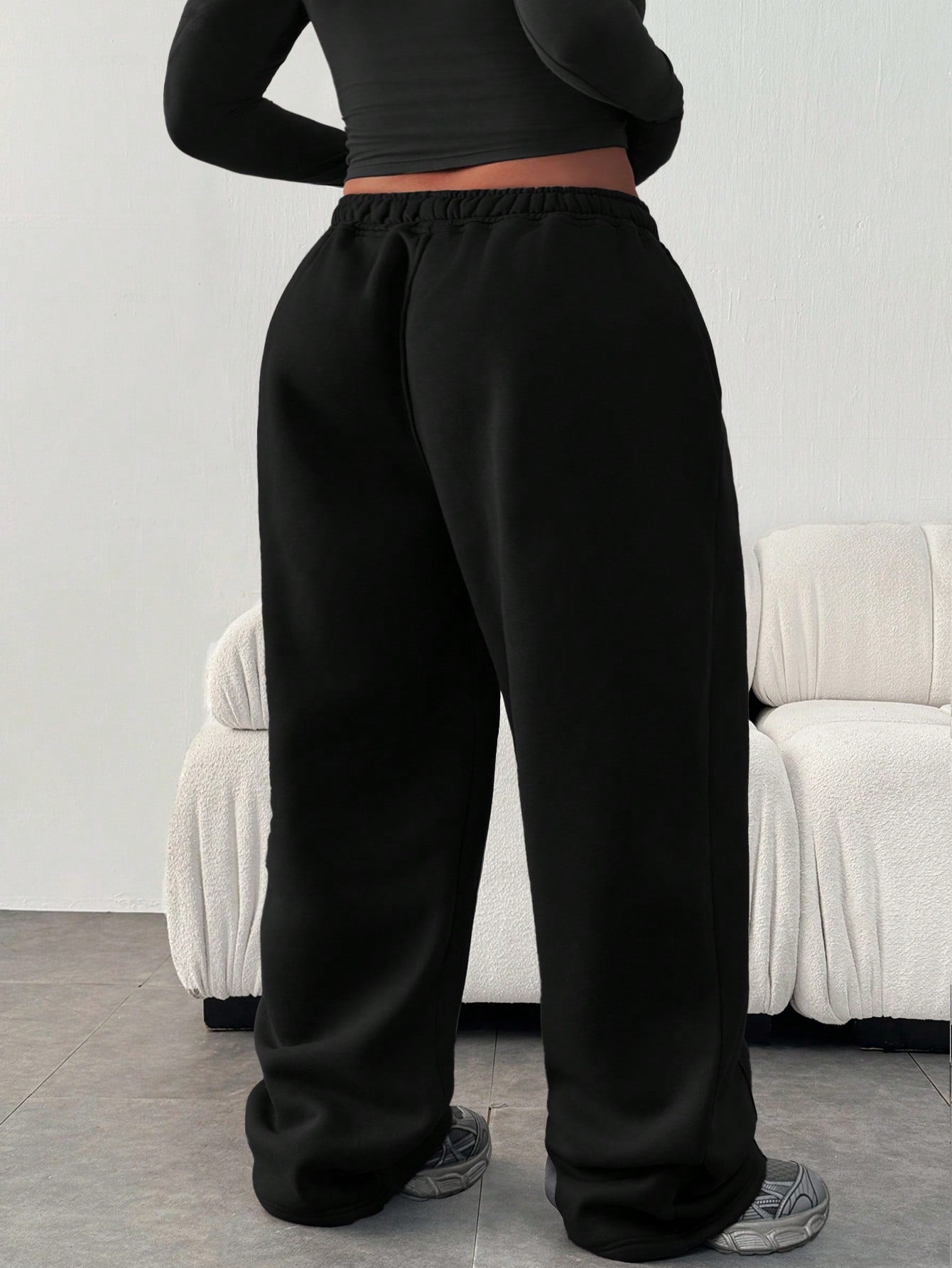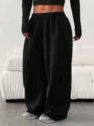 بنطال رياضي نسائي فضفاض بمقاسات كبيرة، بلون موحد، بخصر مطاطي وجيوب