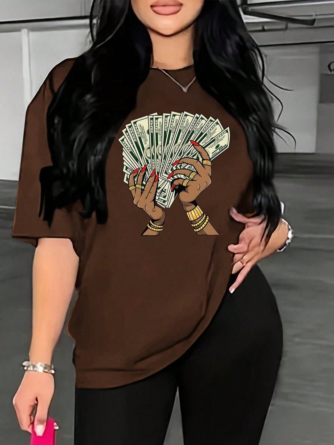 Plus Size Women's Fashion Banknote Printed Short Sleeve T-Shirt, Graphic Tee, Women Summer Top