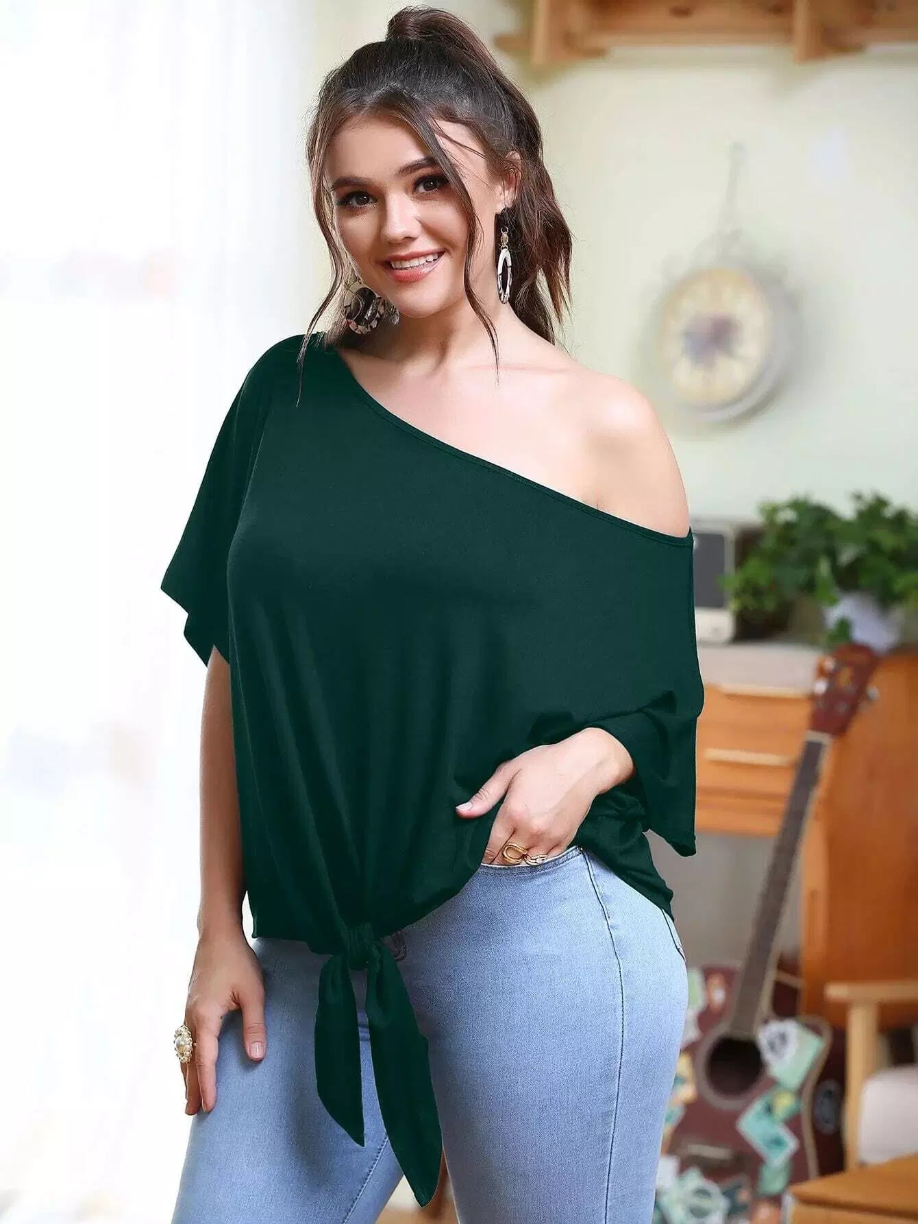 تي شيرت بعقدة كتف مائلة سادة بلس