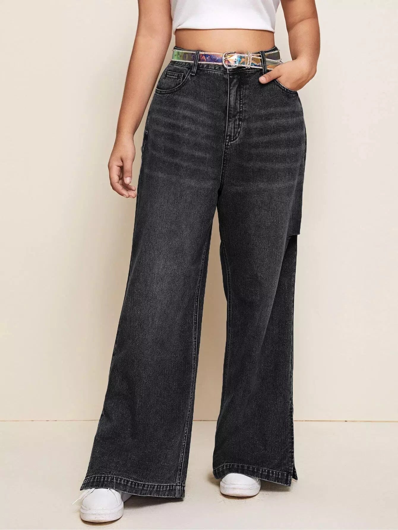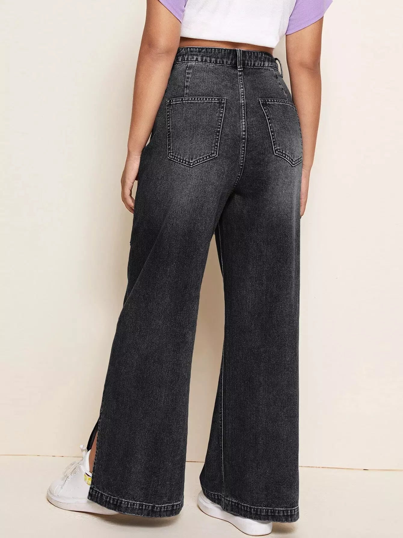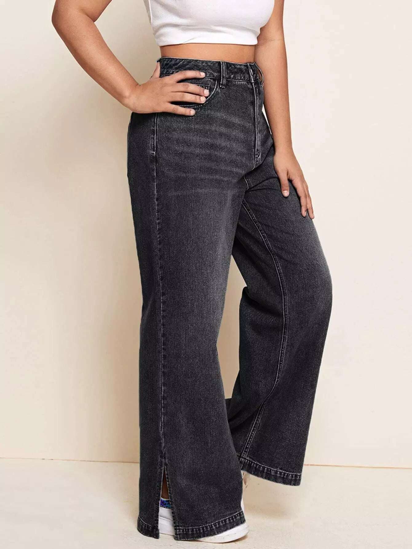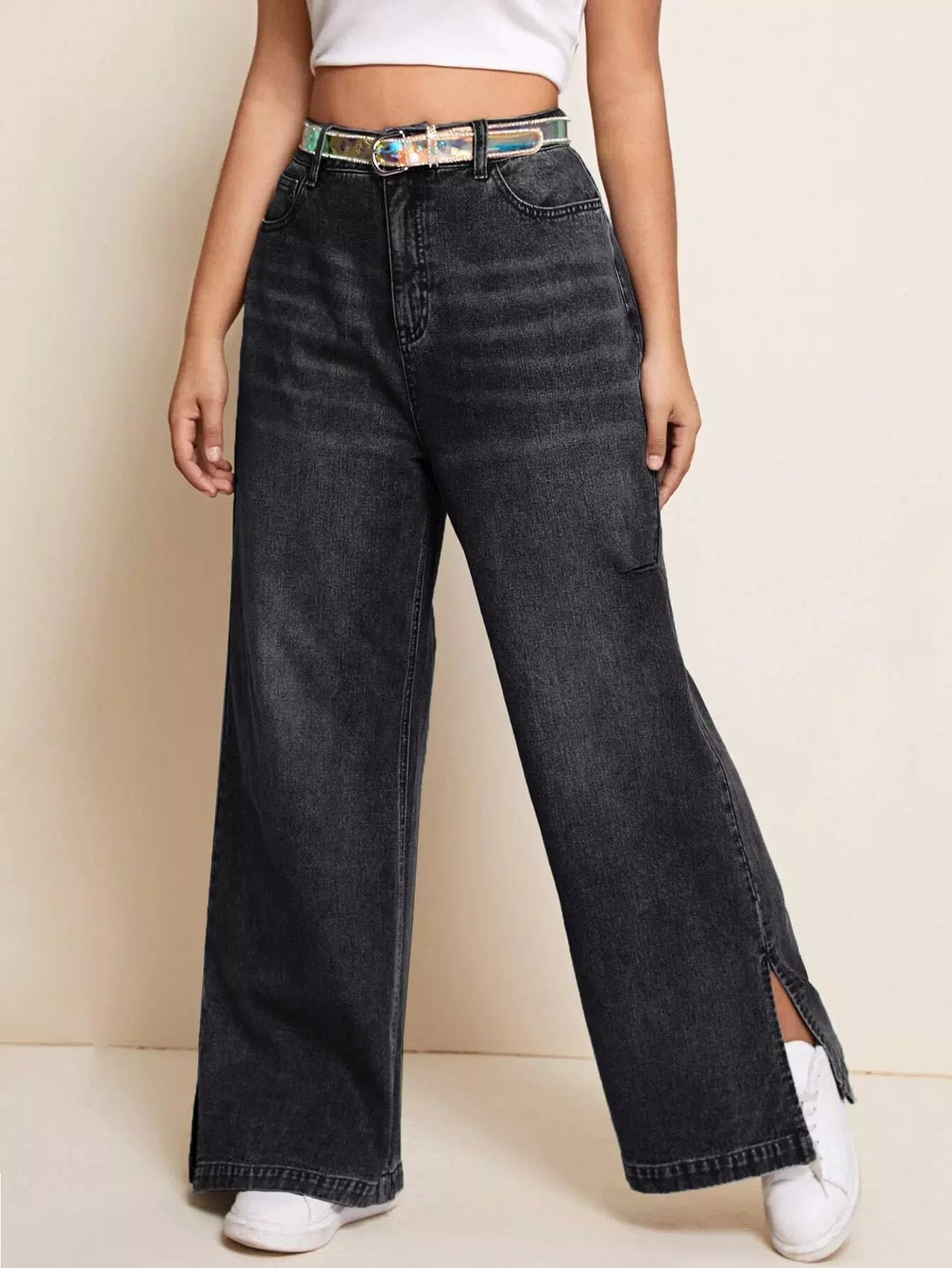جينز جينز واسع الساقين بحواف منقسمة بلاس بلا حزام