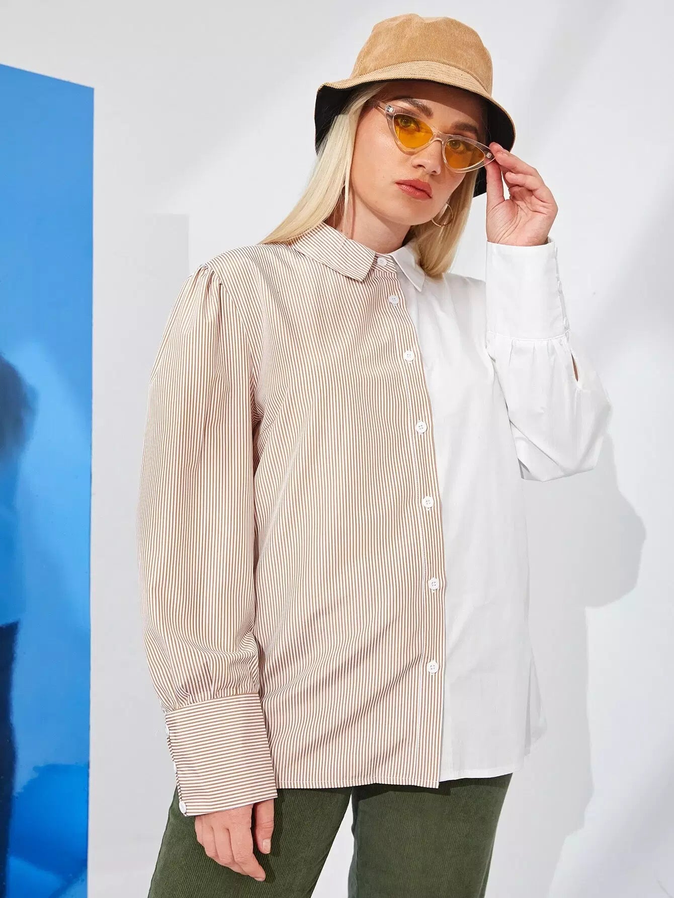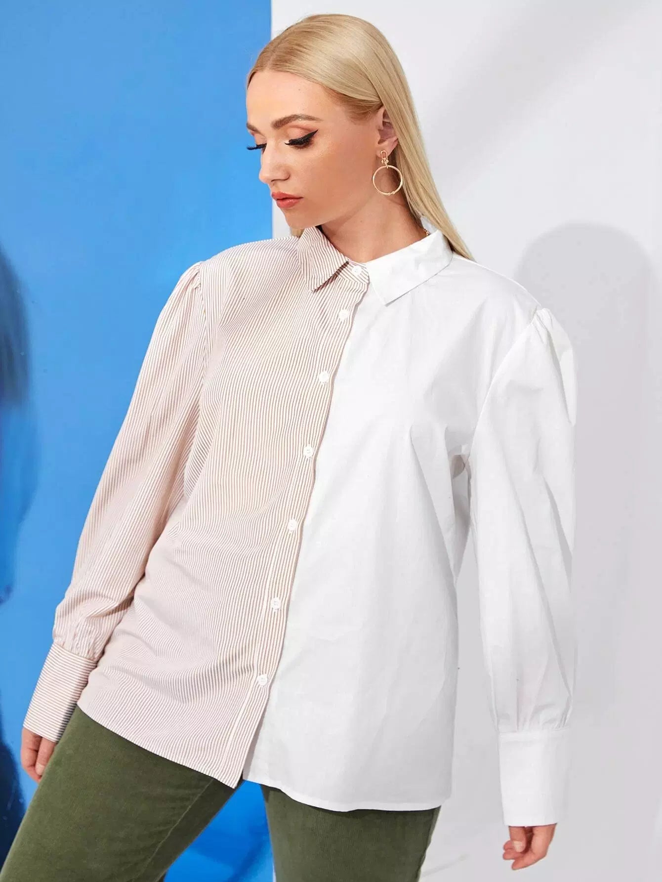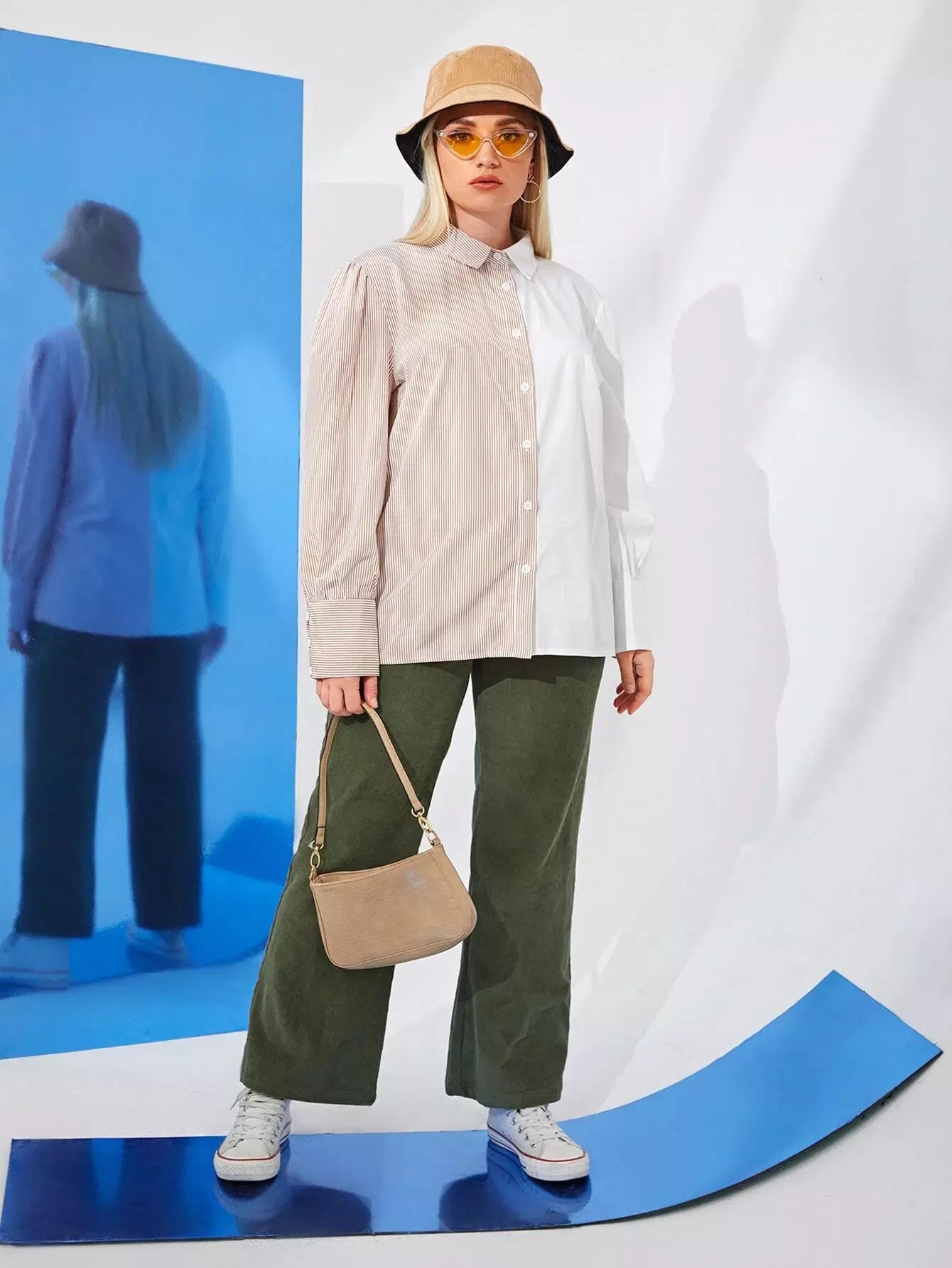 قميص بأزرار بأزرار مخططة بالألوان بلون زائد