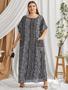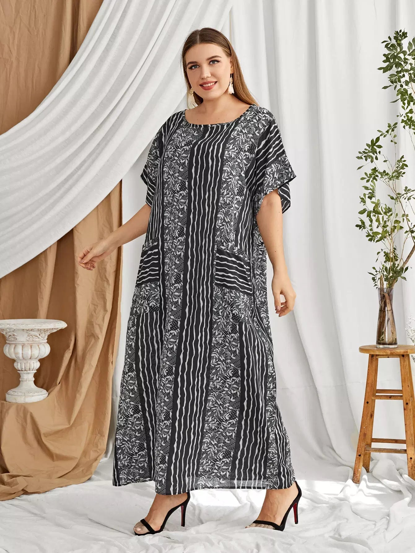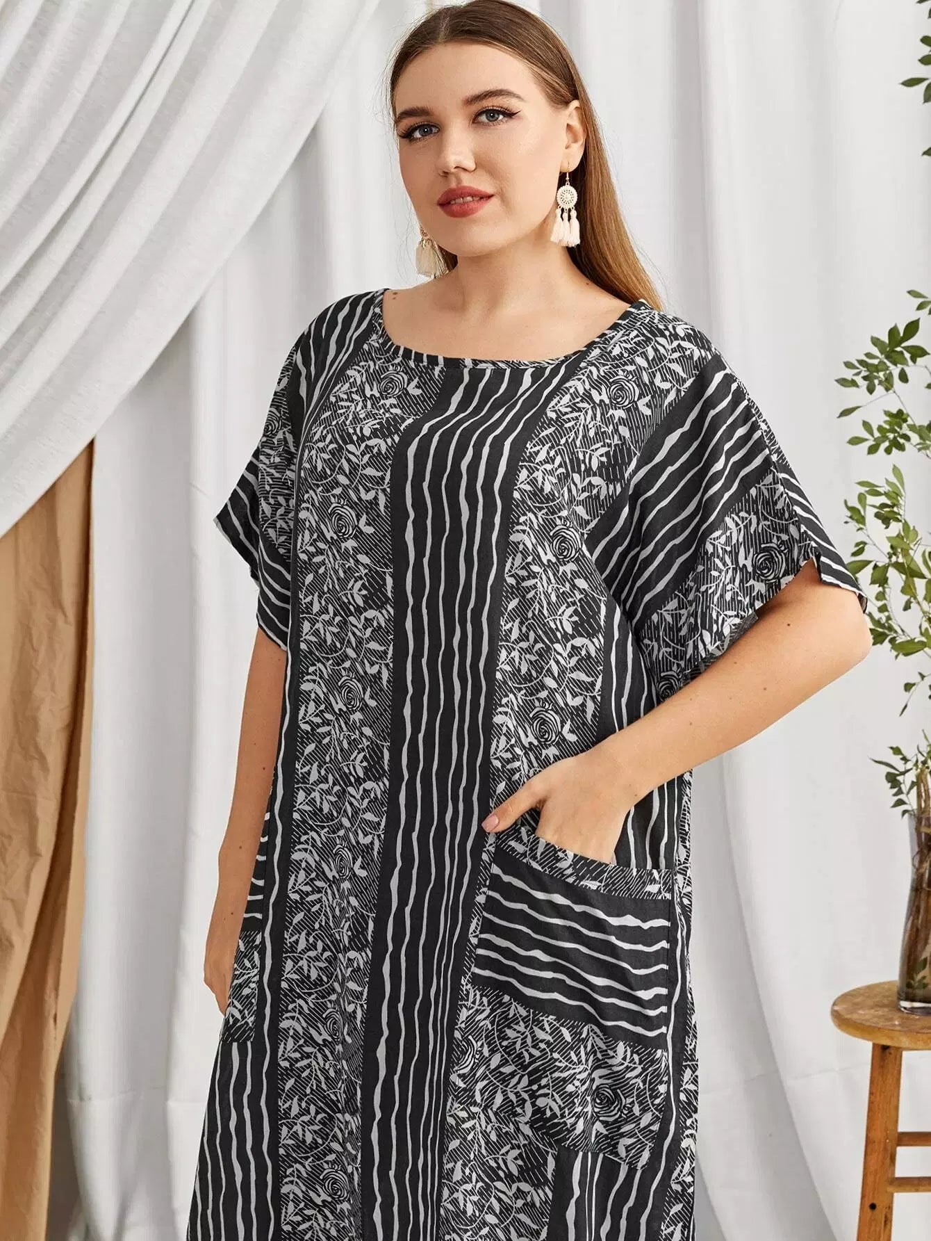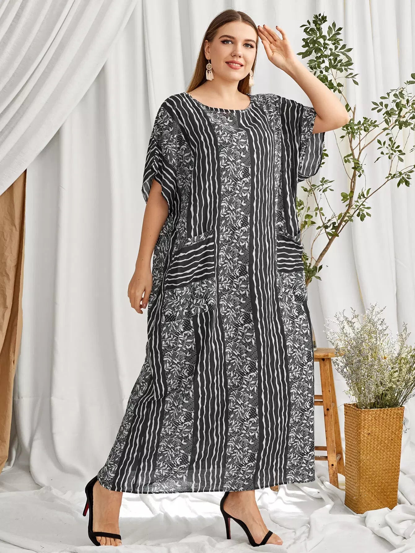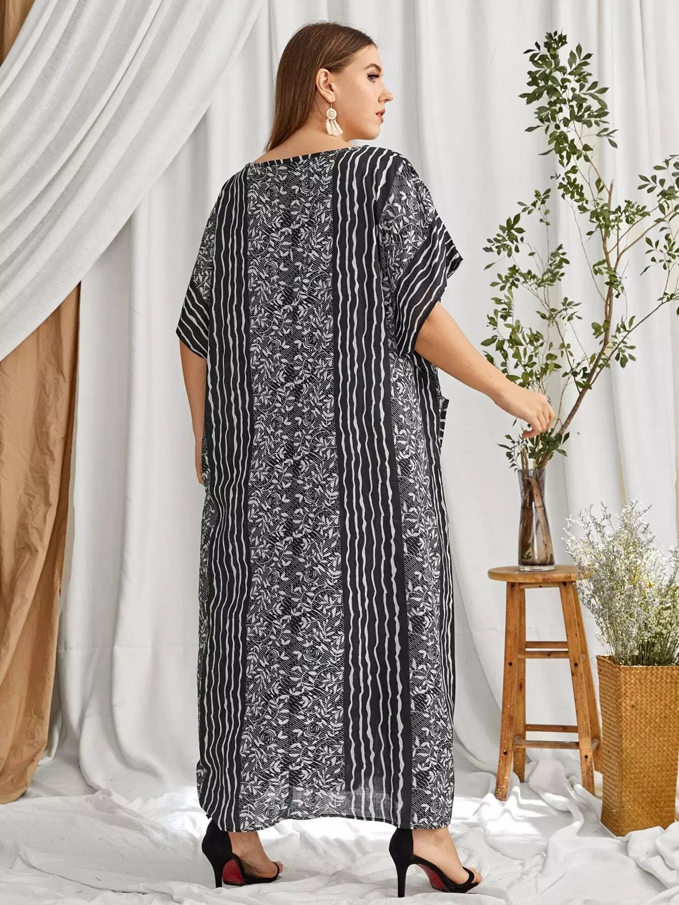 فستان بطبعة زهور ونباتات مخططة ونباتات زائد