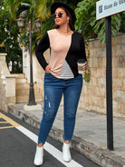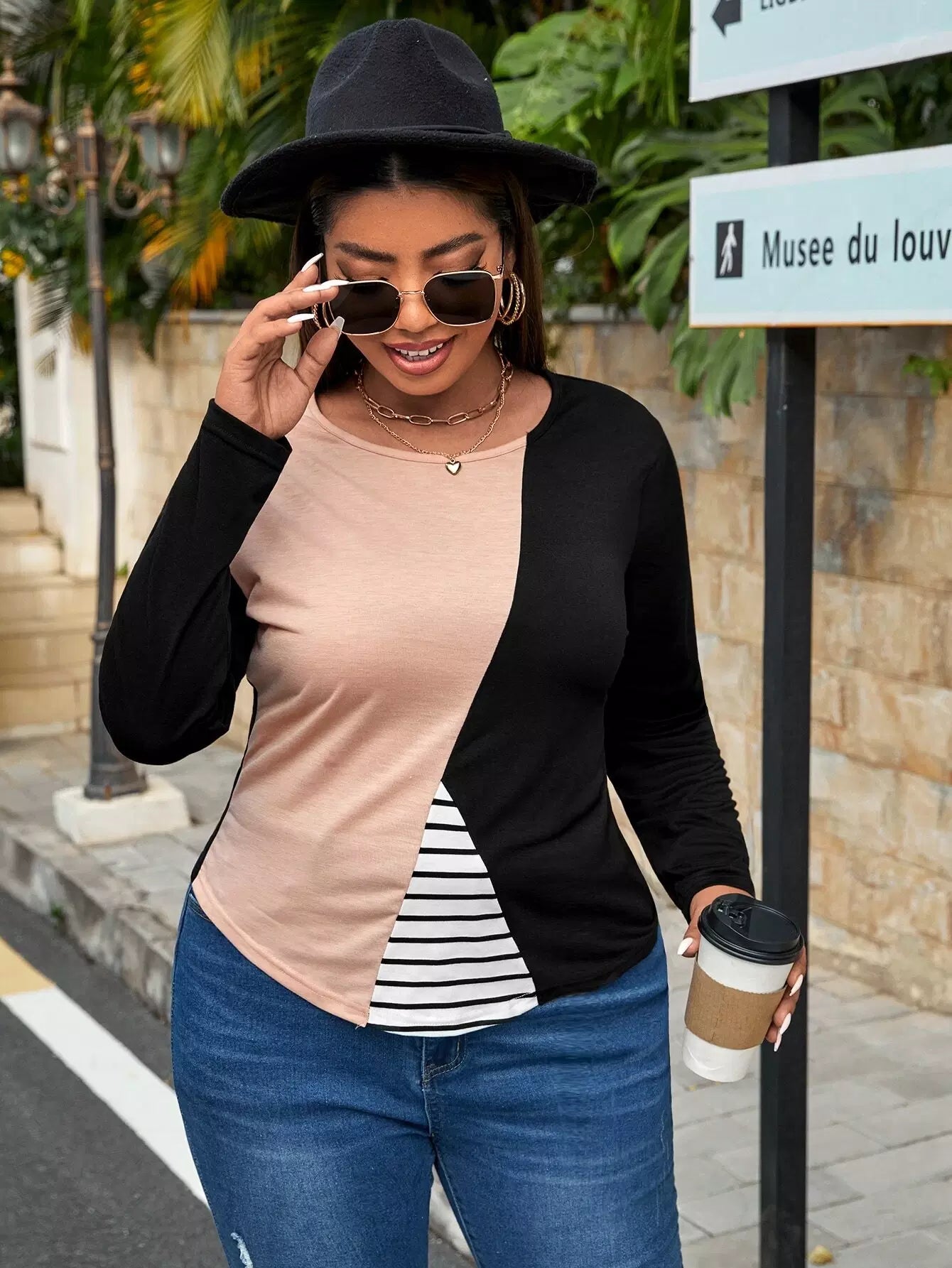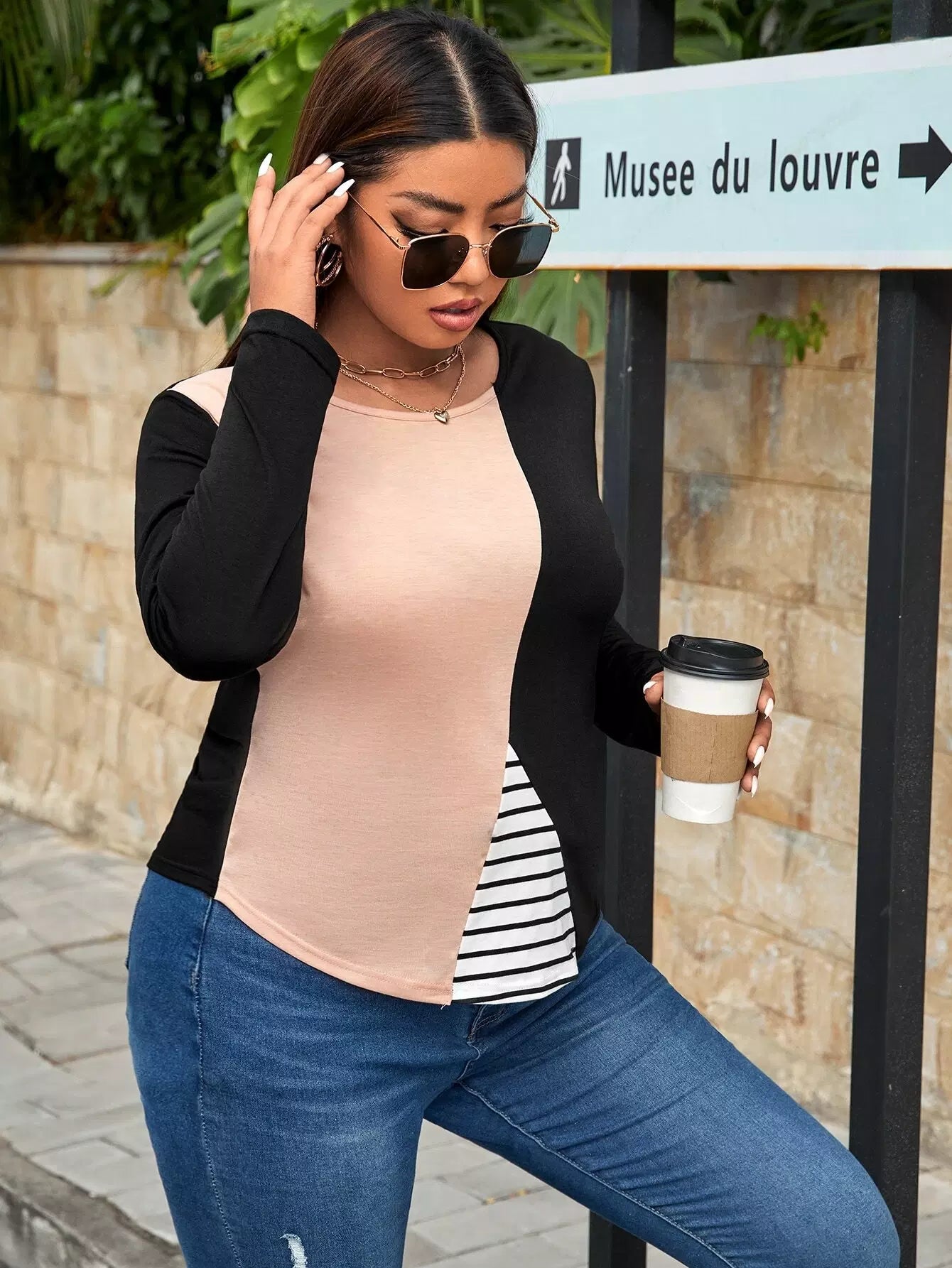 تي شيرت بلوزة مخططة ملونة بلون واحد زائد