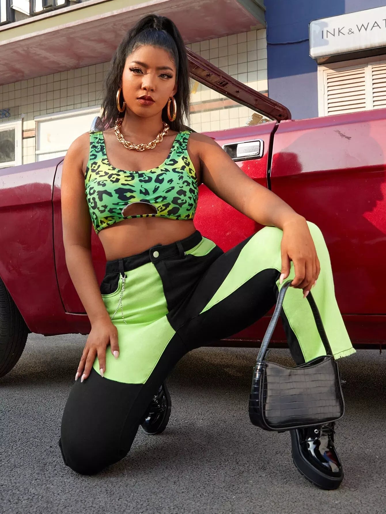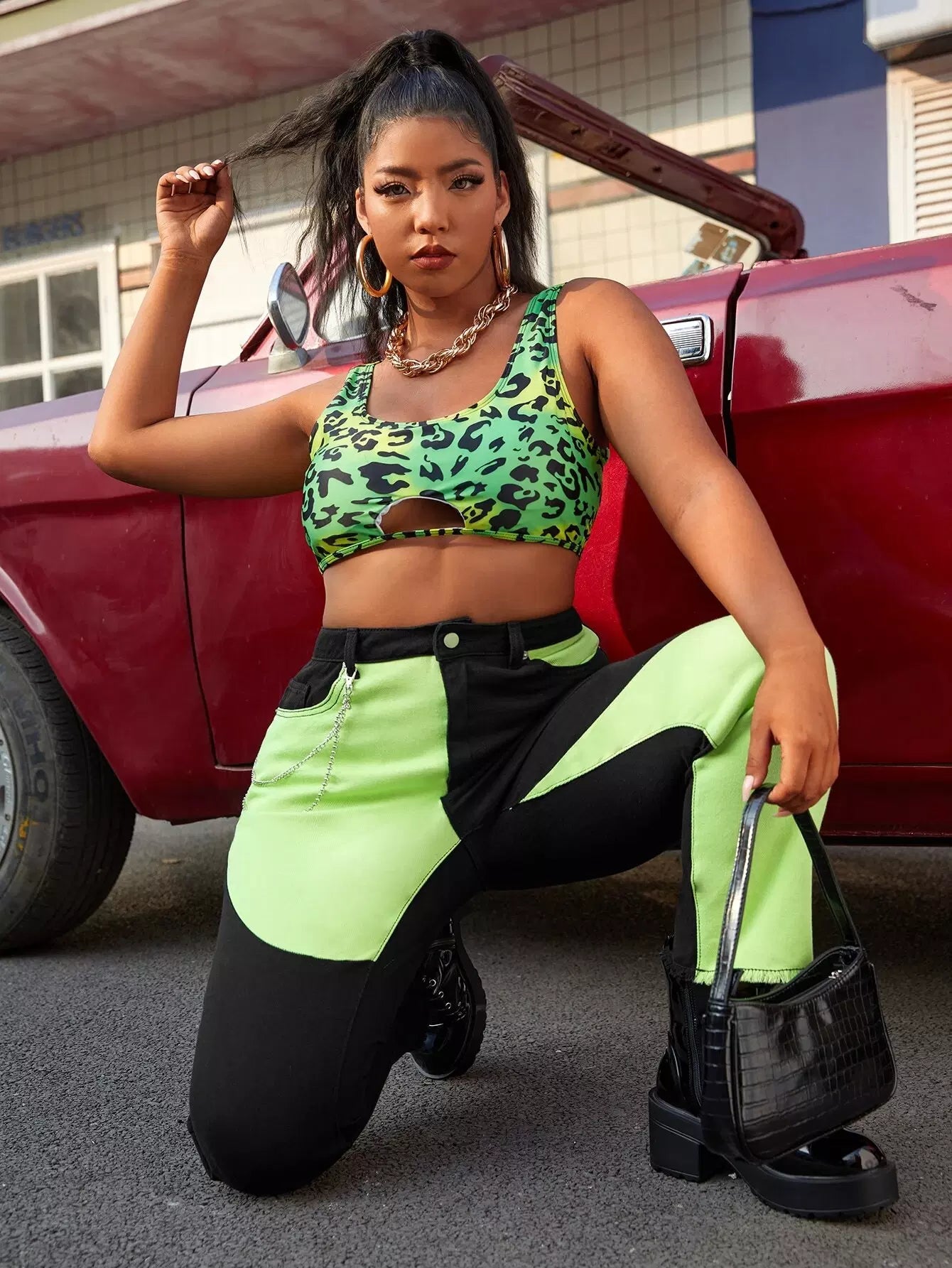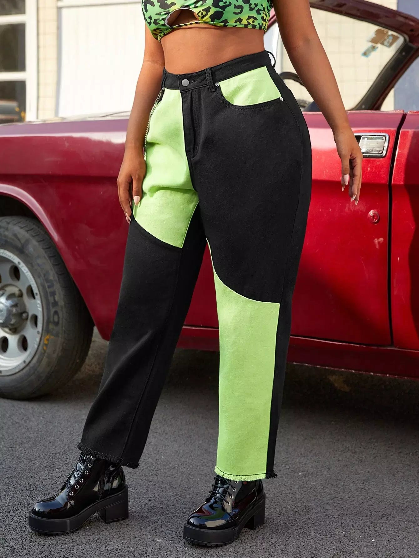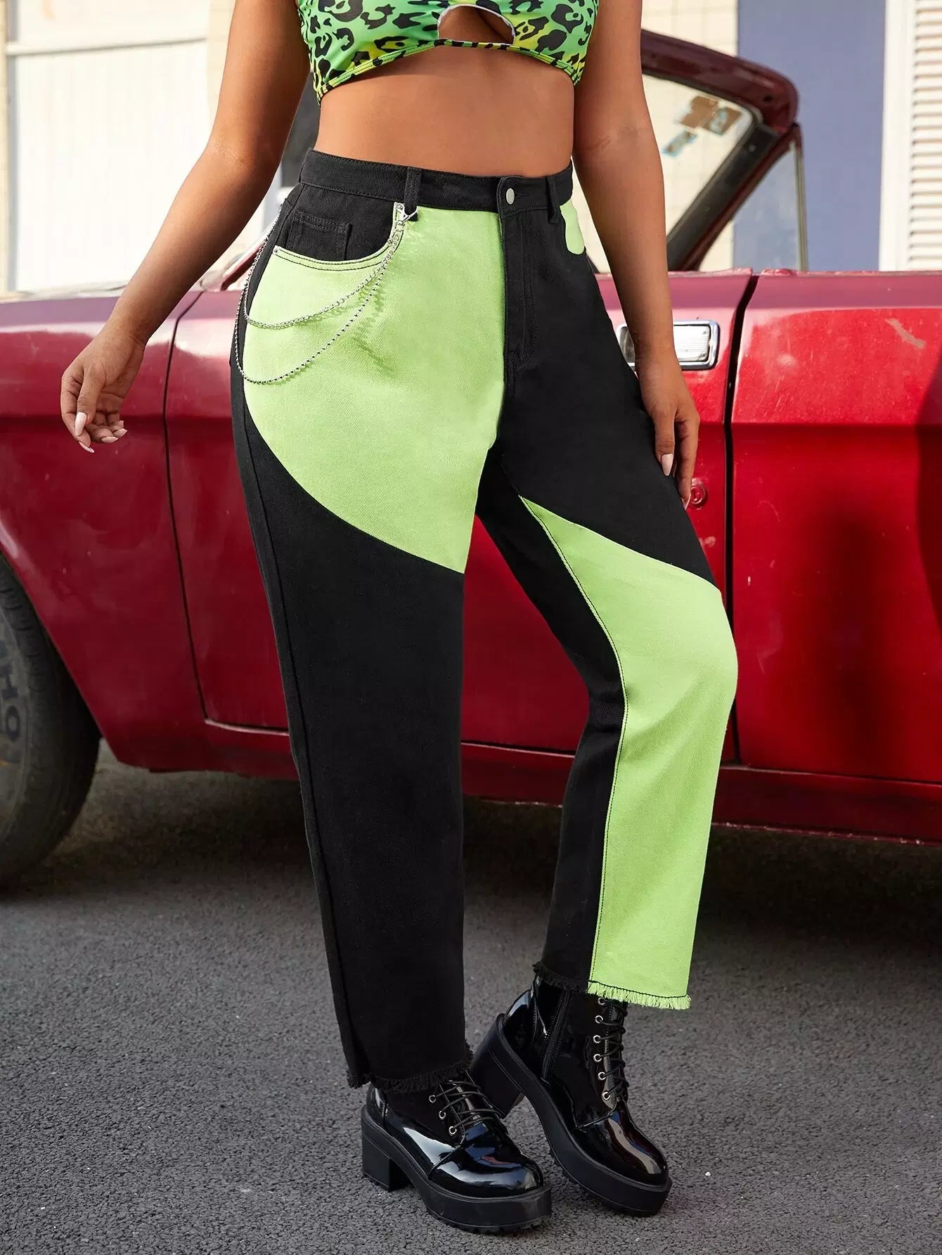 بنطلون جينز جينز مزين بلونين مزين بسلسلة خفيف الحاشية