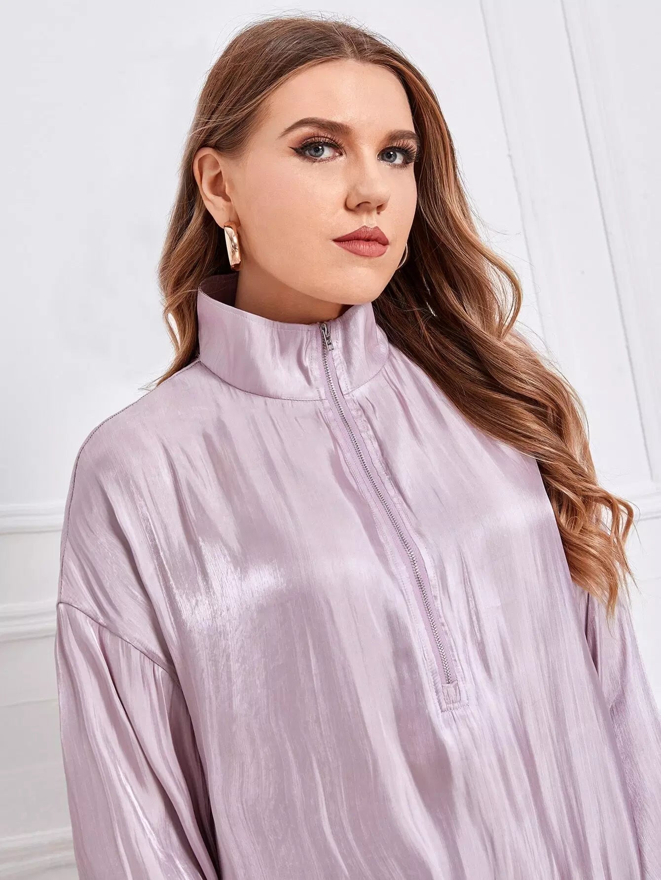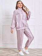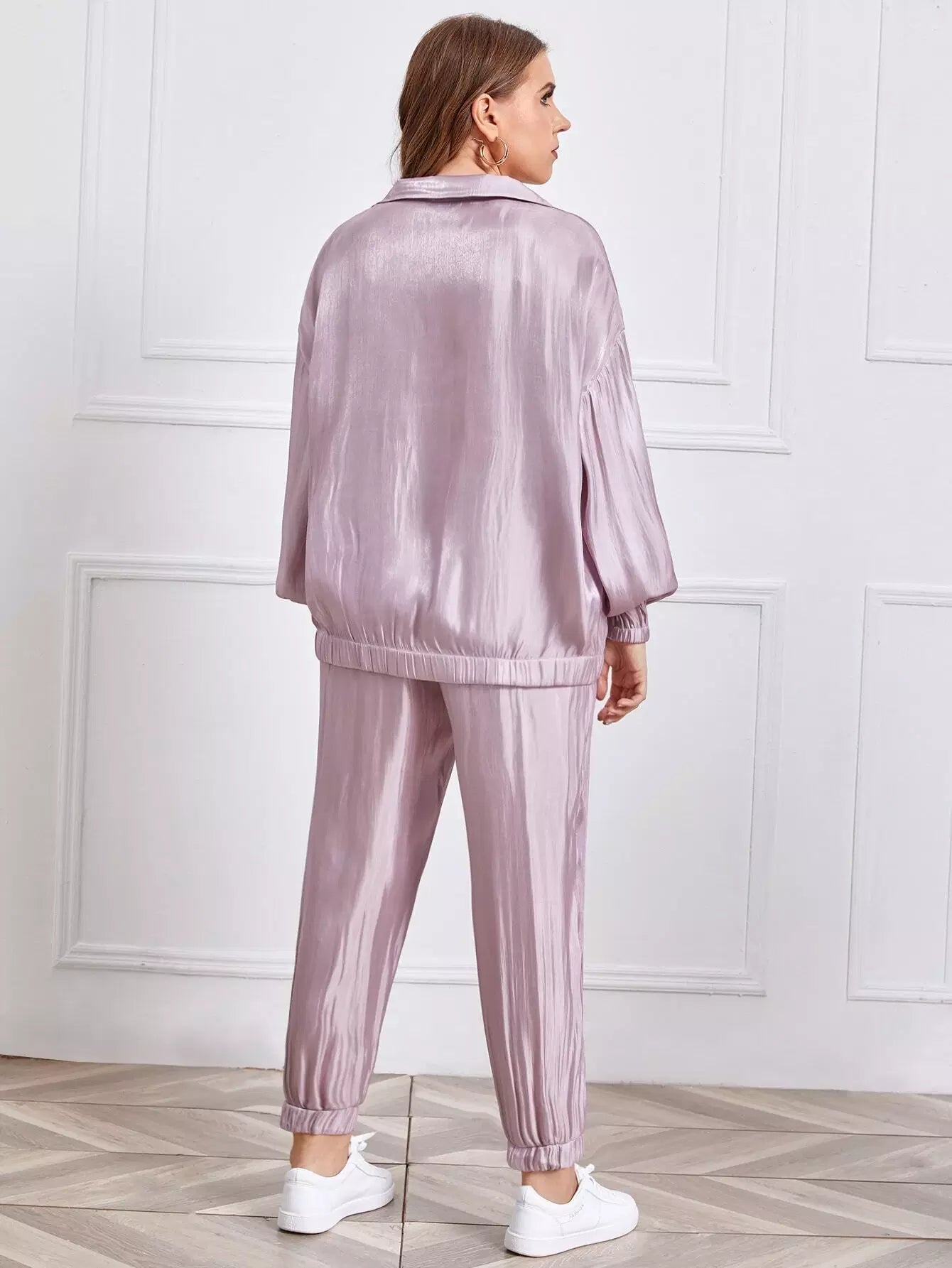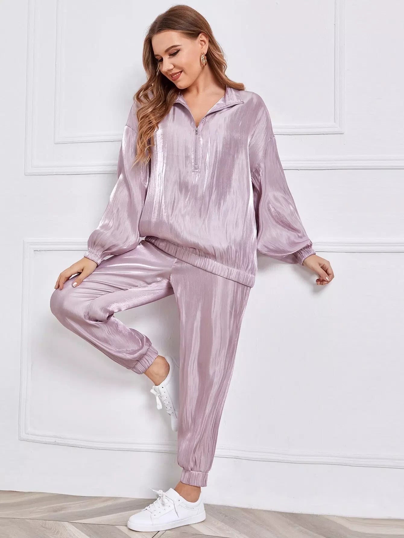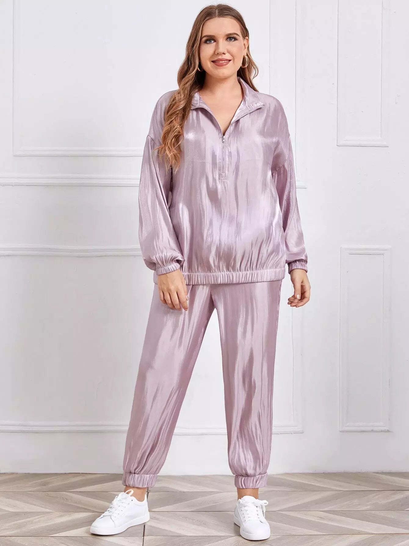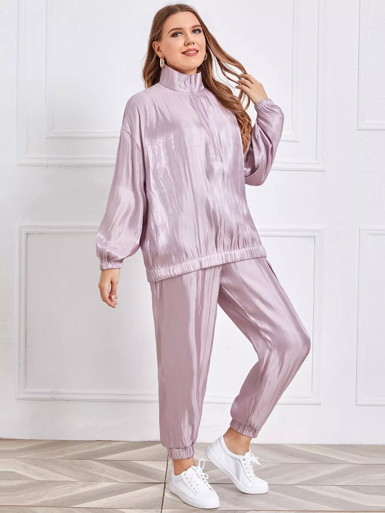 نحيف - مقاس كبير طقم جاكيت وسروال من الساتان بسحاب نصف فتحة