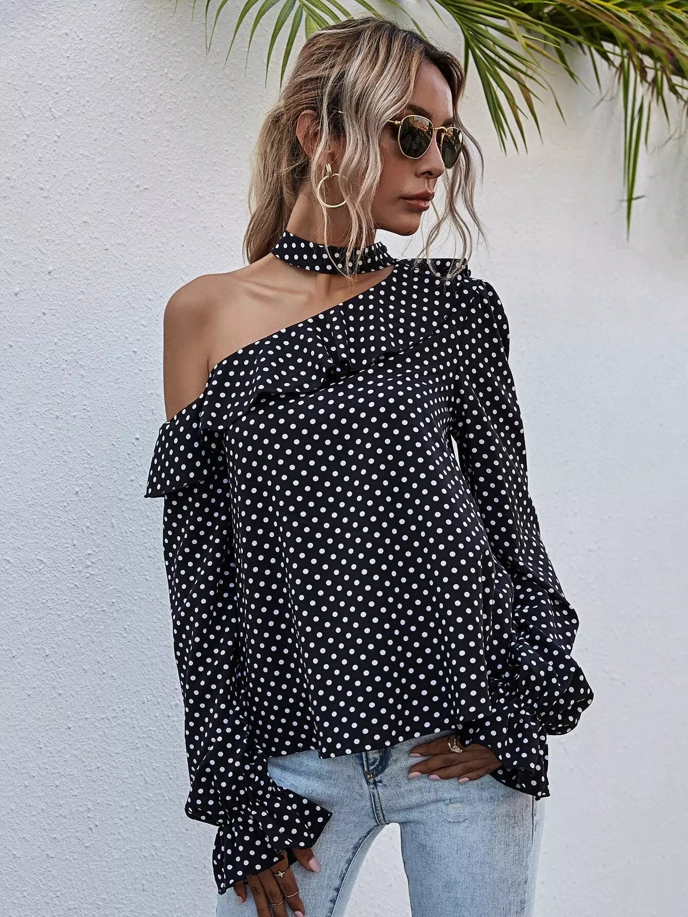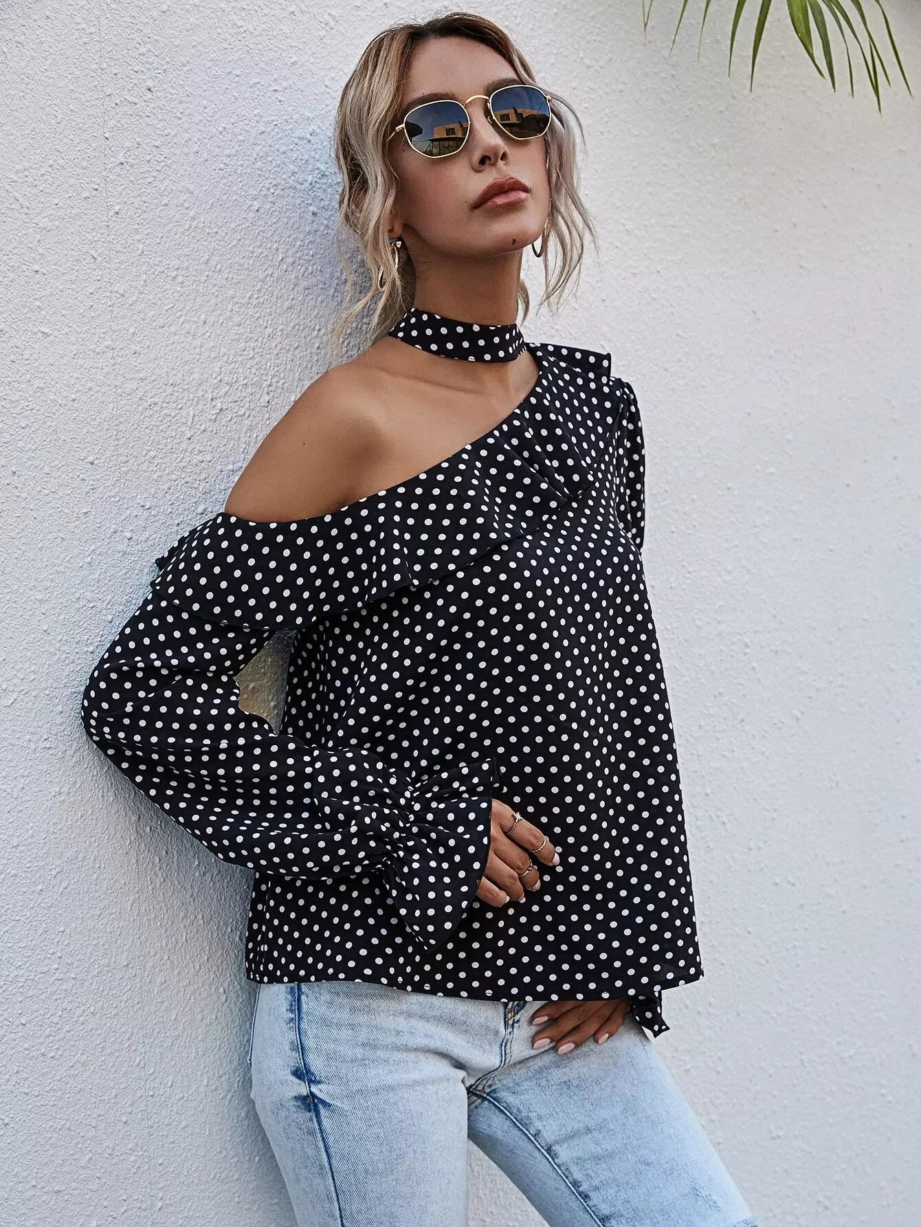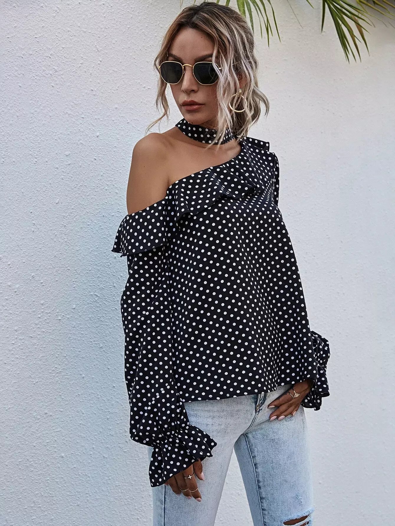 بلوزة منقطة برقبة غير متناظرة ذات حواف كشكش