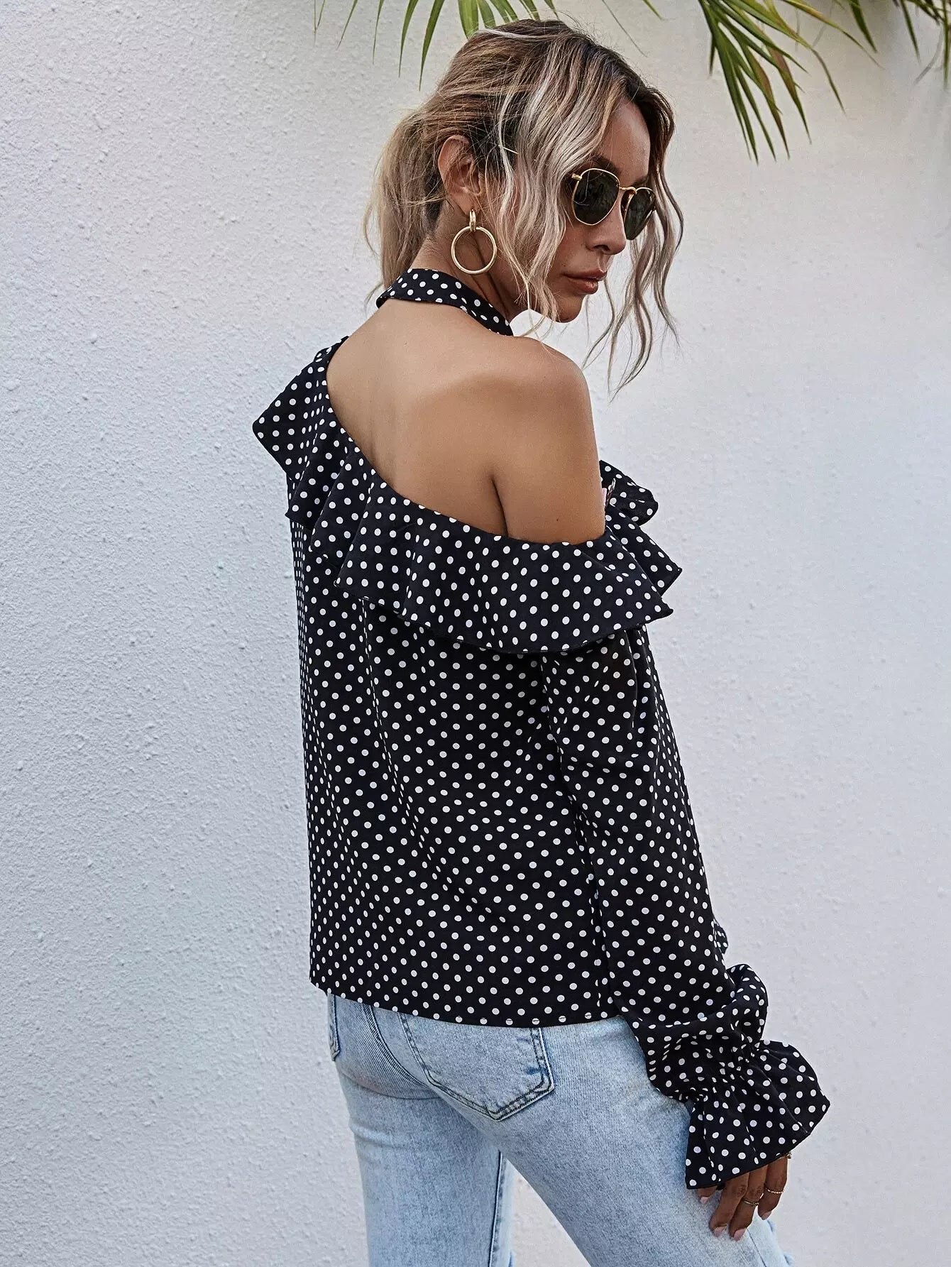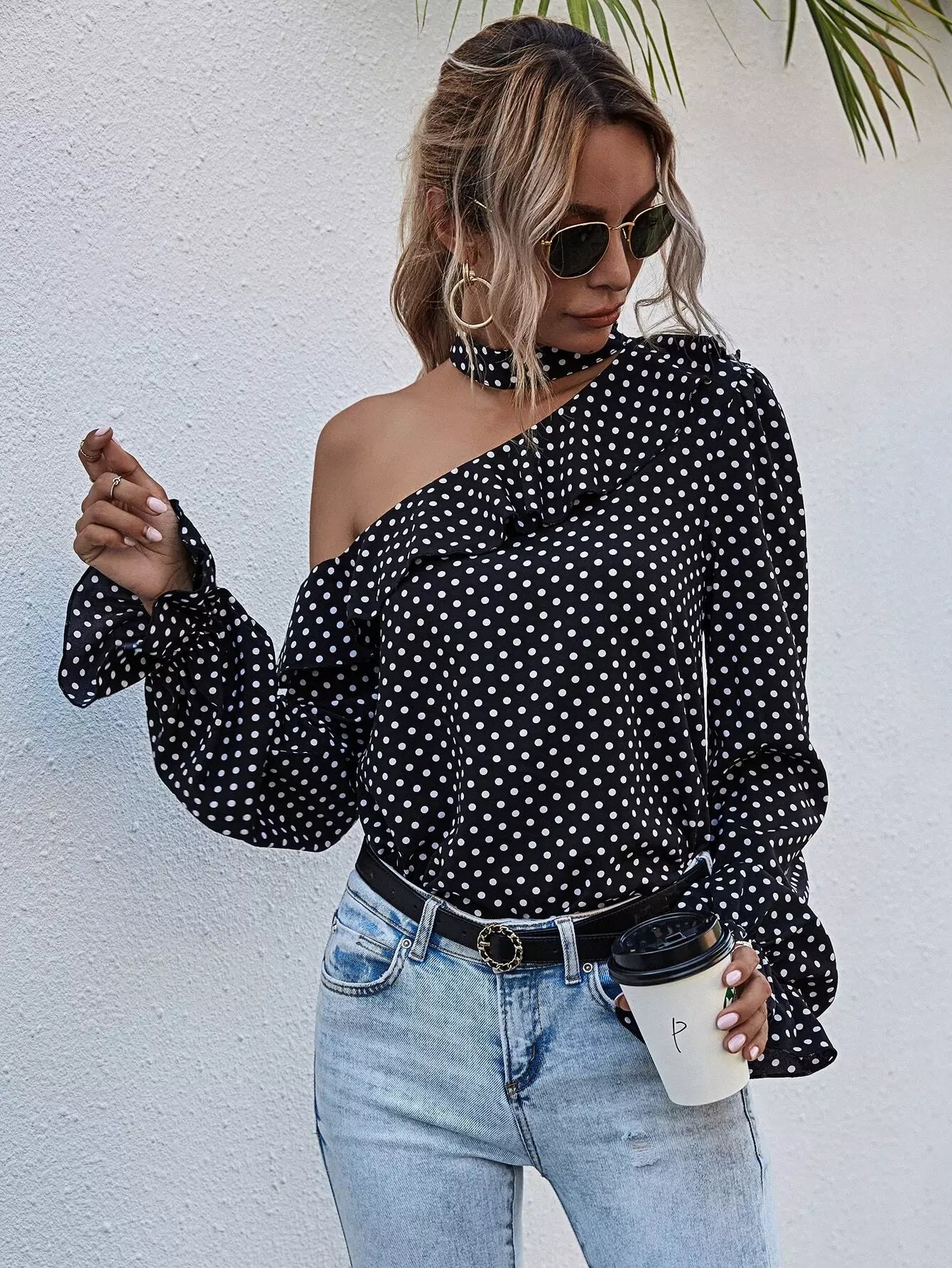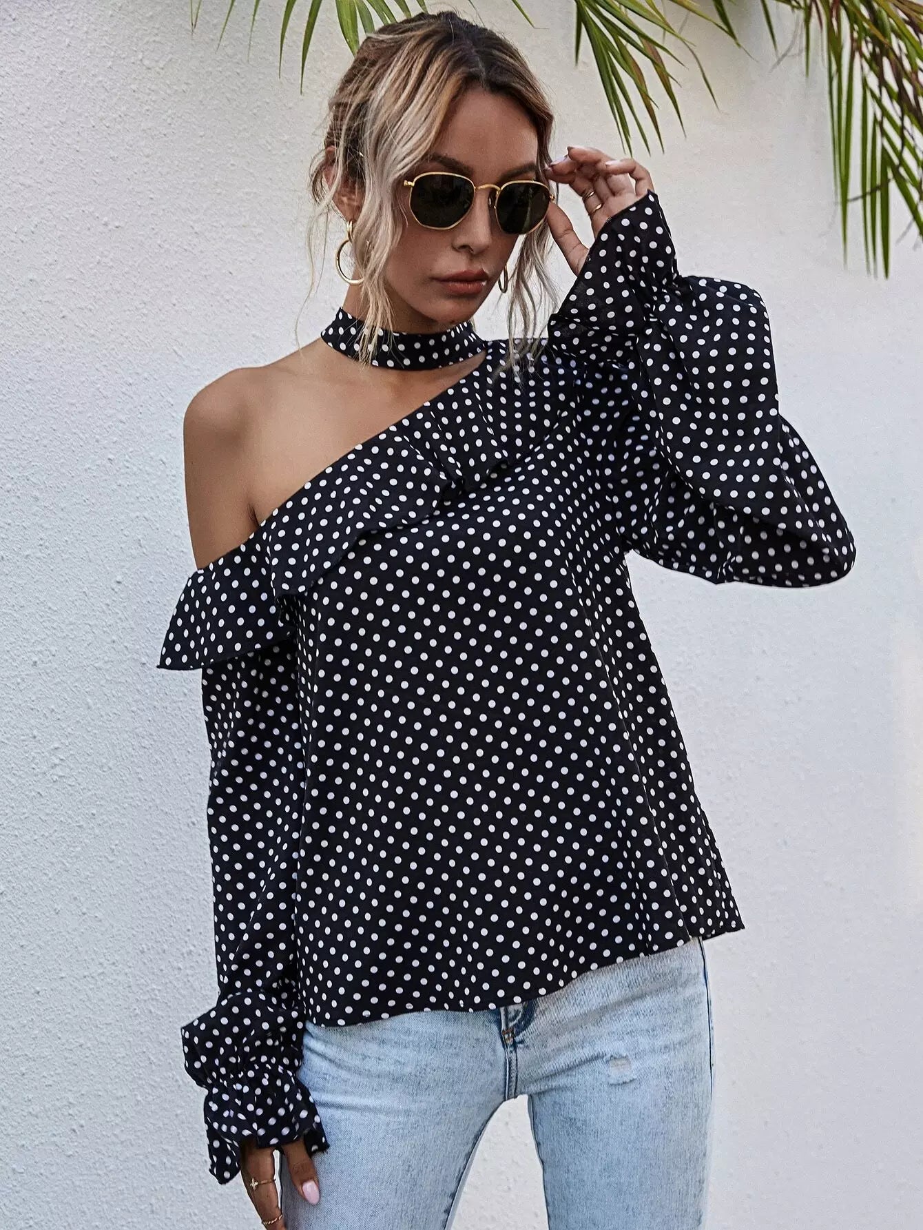بلوزة منقطة برقبة غير متناظرة ذات حواف كشكش