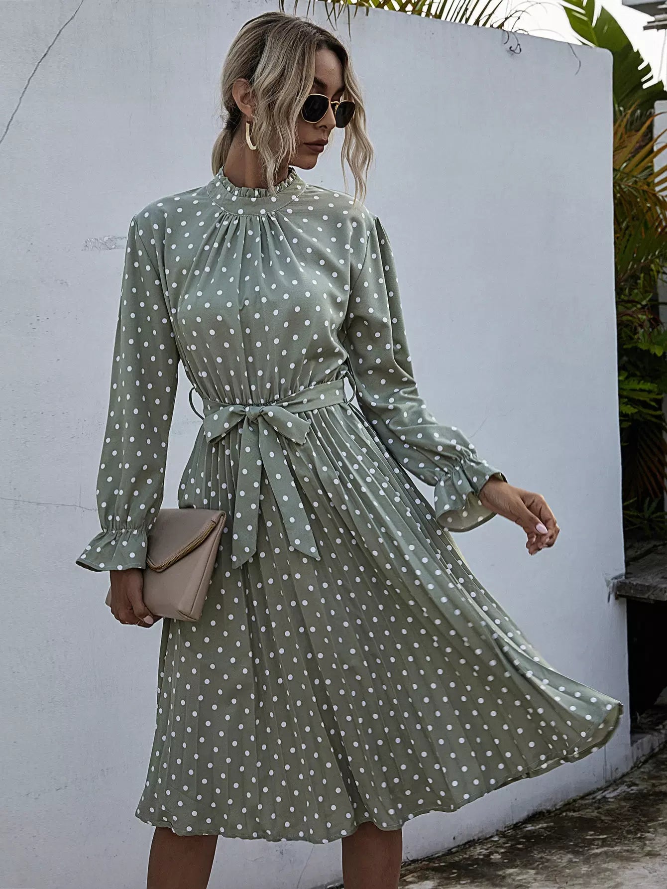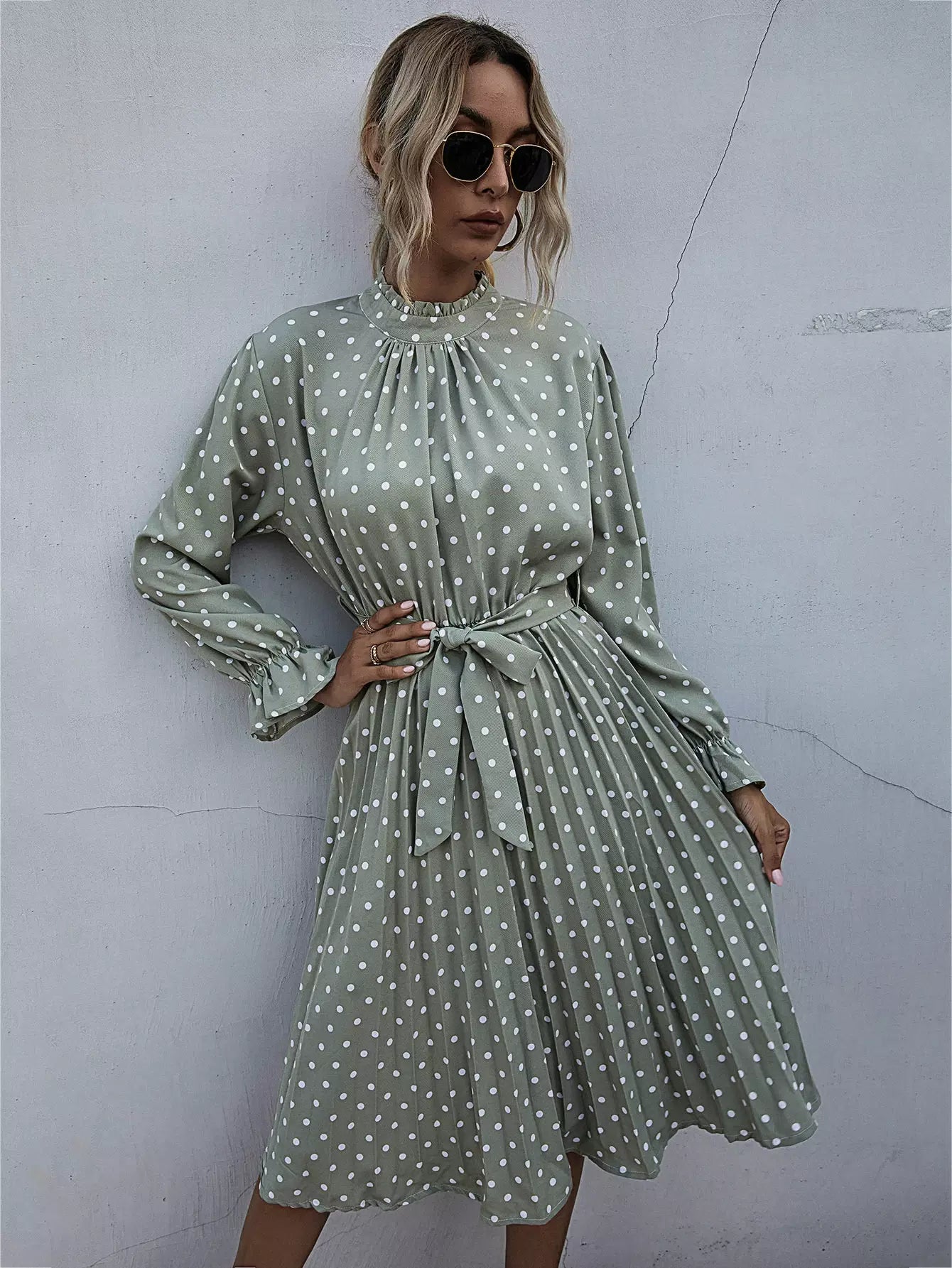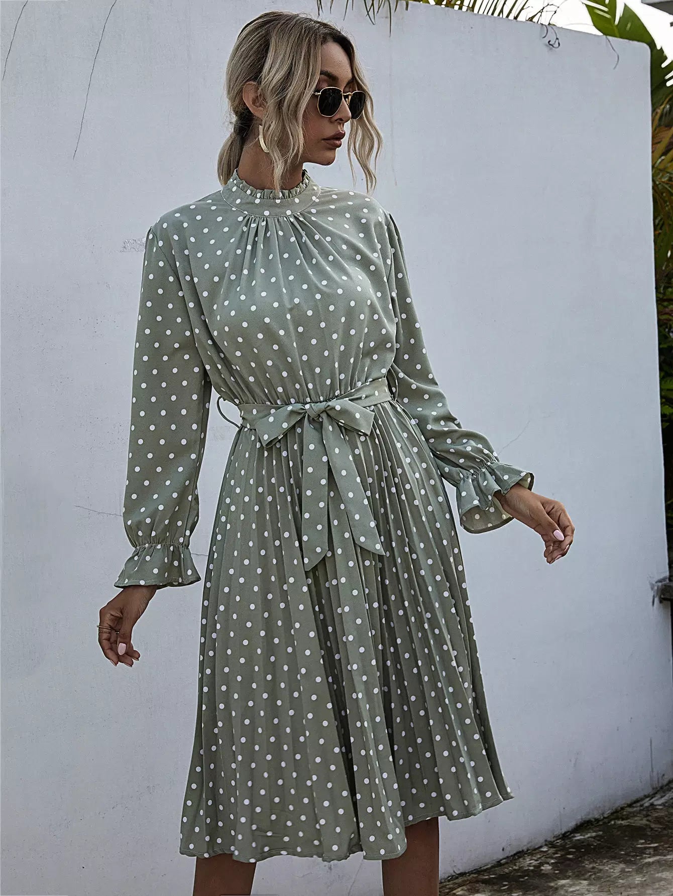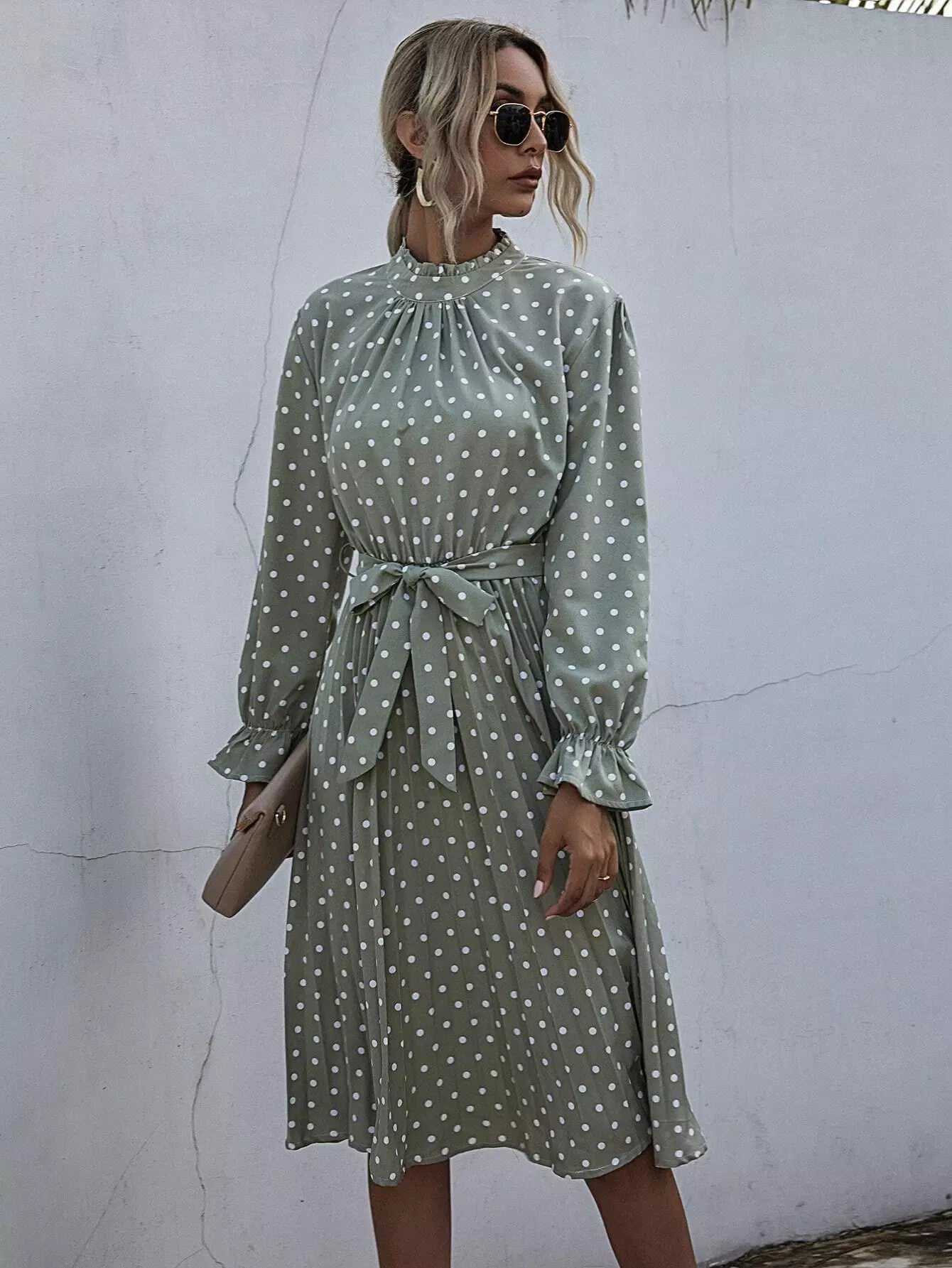 للنساء - فستان منقّط بياقة مكشكشة وحزام