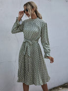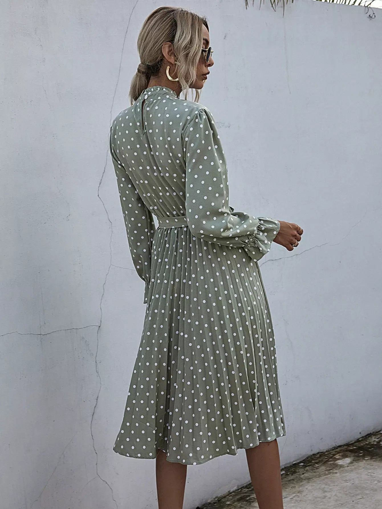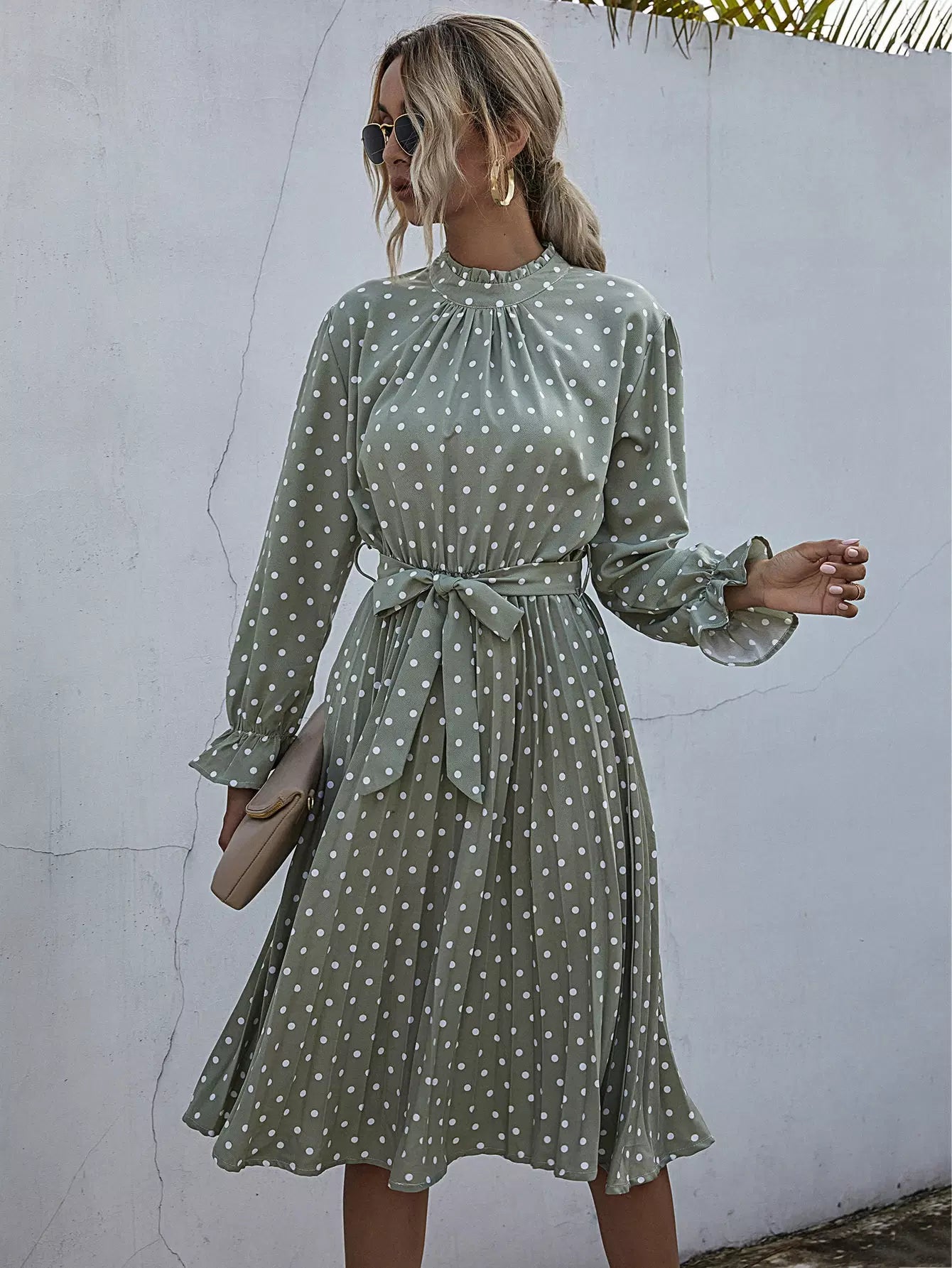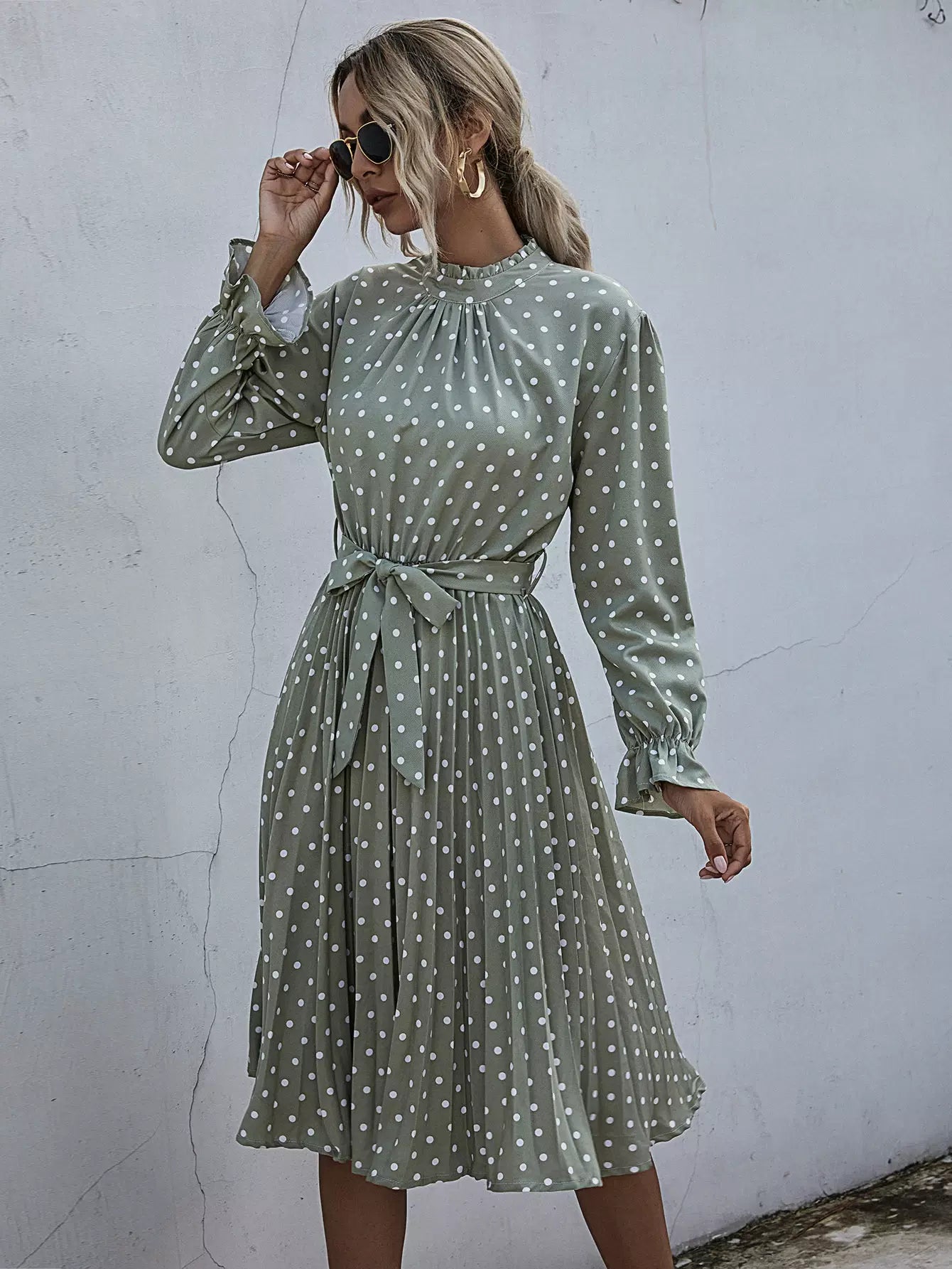 للنساء - فستان منقّط بياقة مكشكشة وحزام