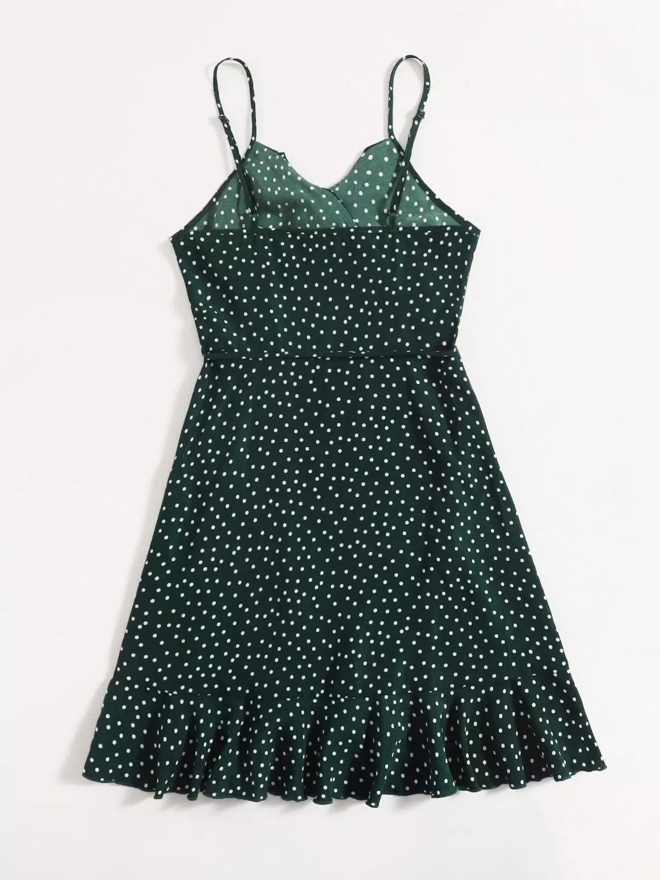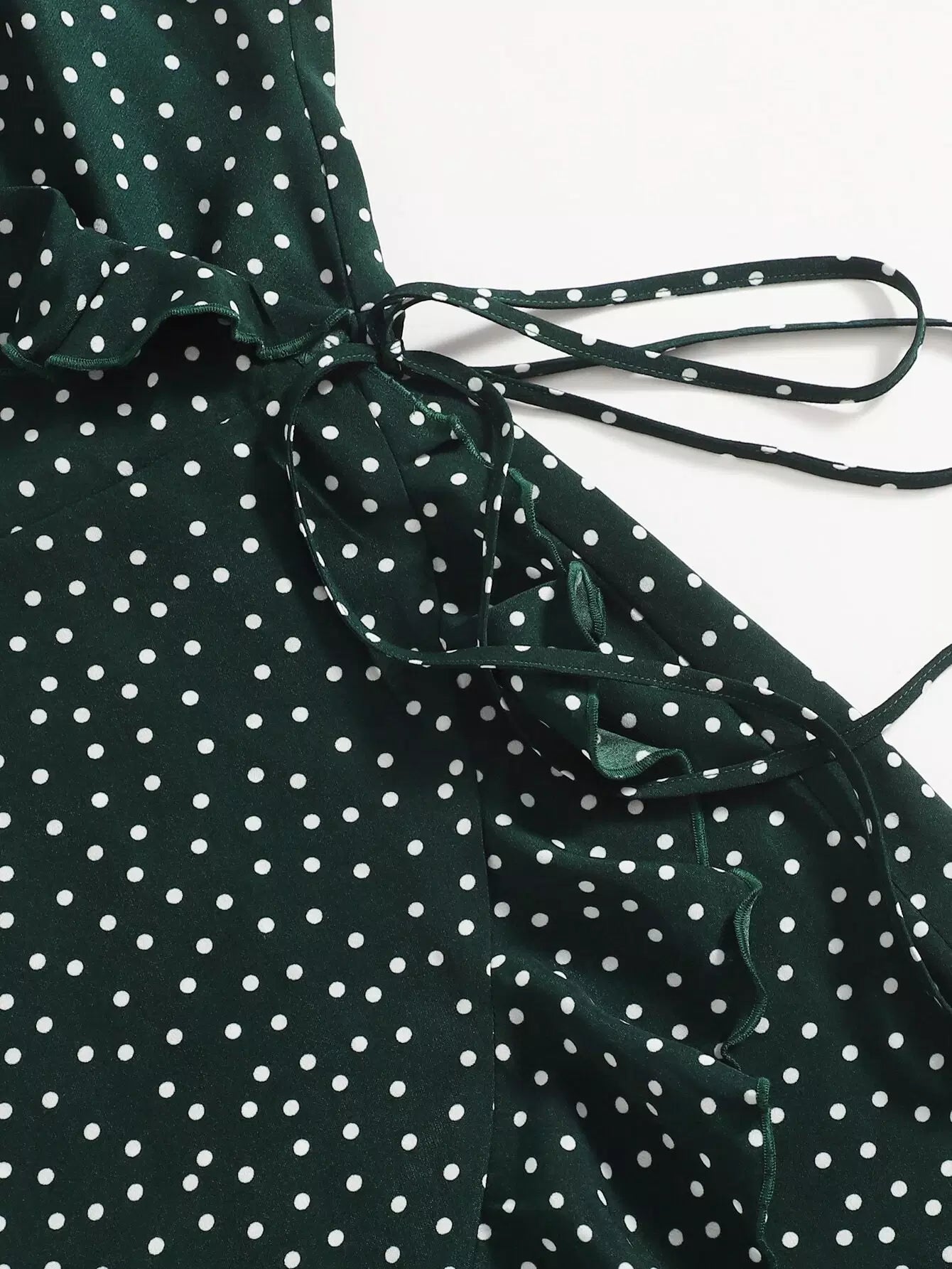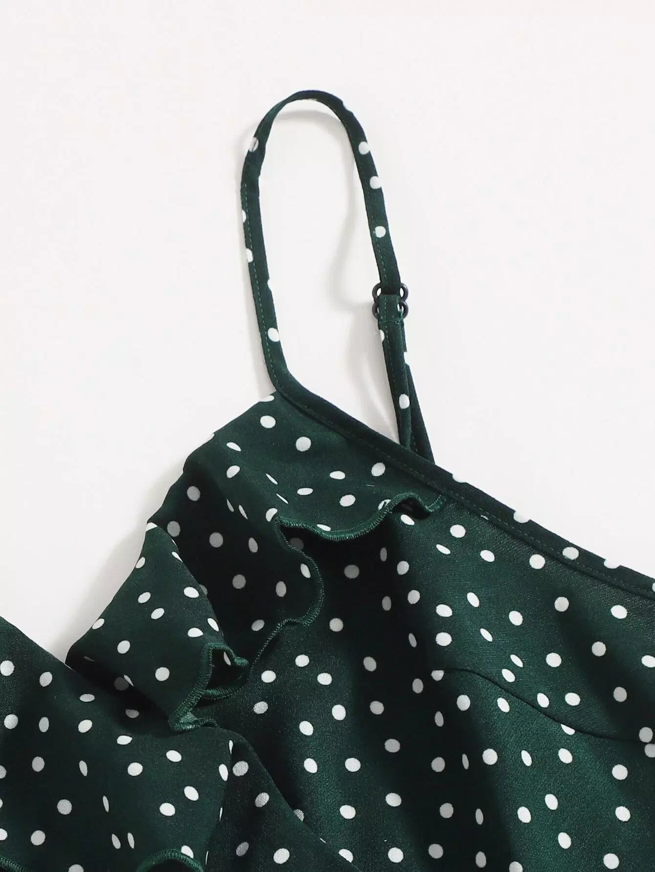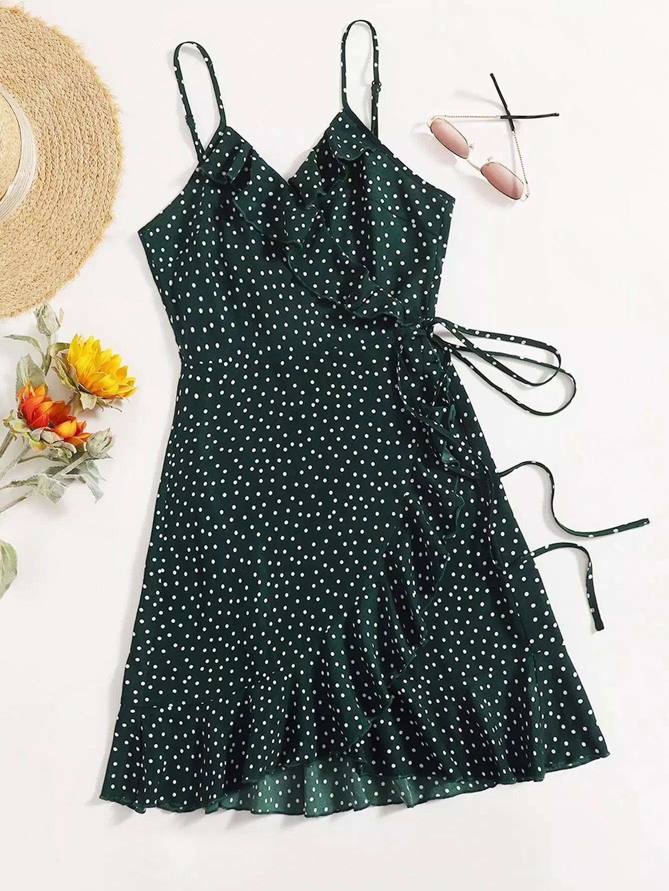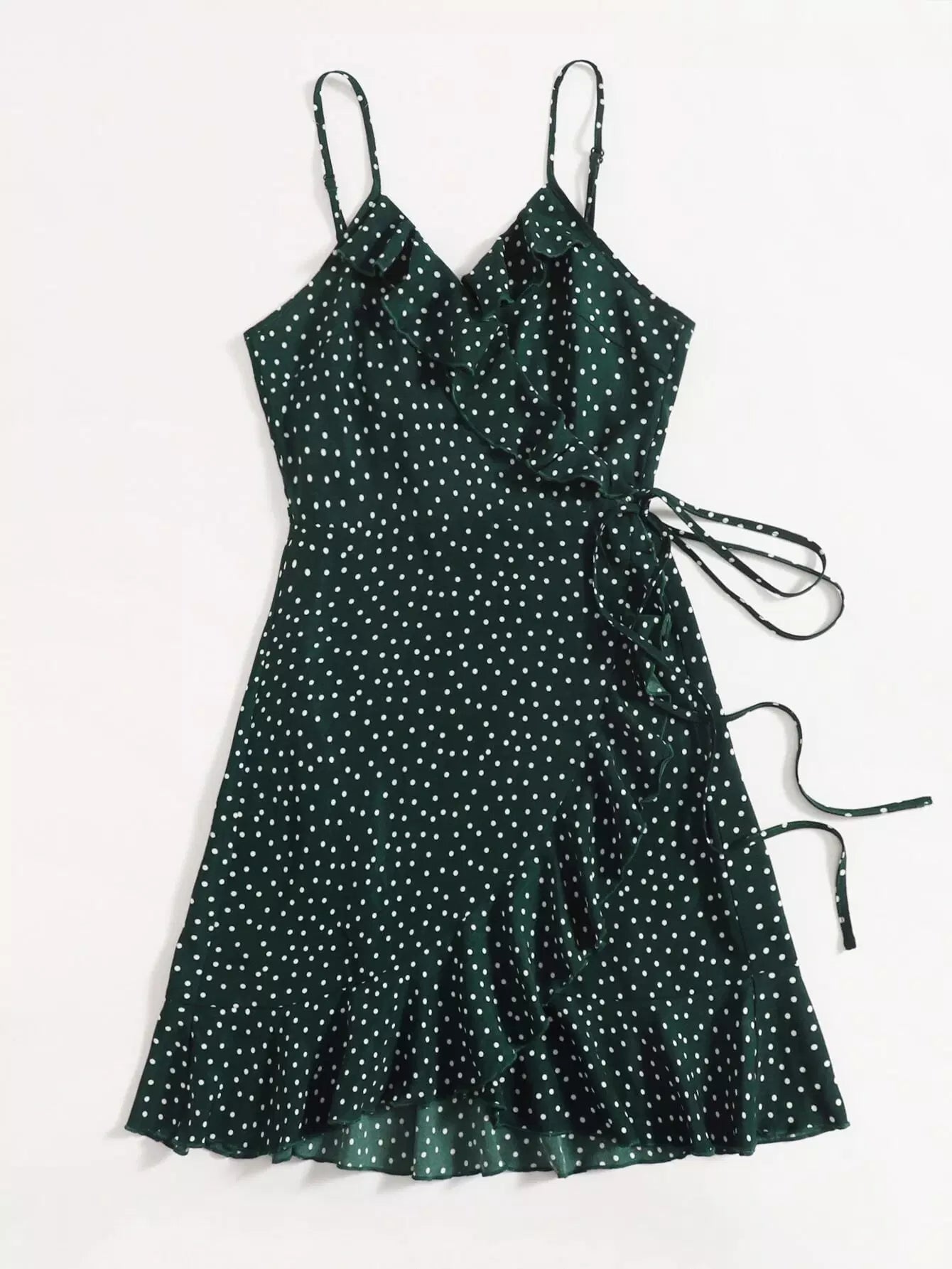 فستان كامي منقّط بعقدة جانبية مزين بكشكش ملفوف بحواف منقطة