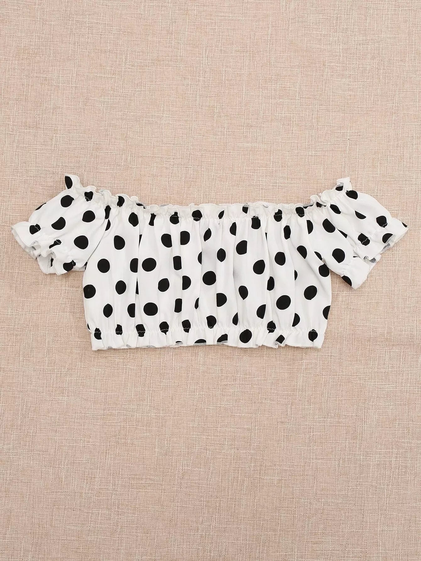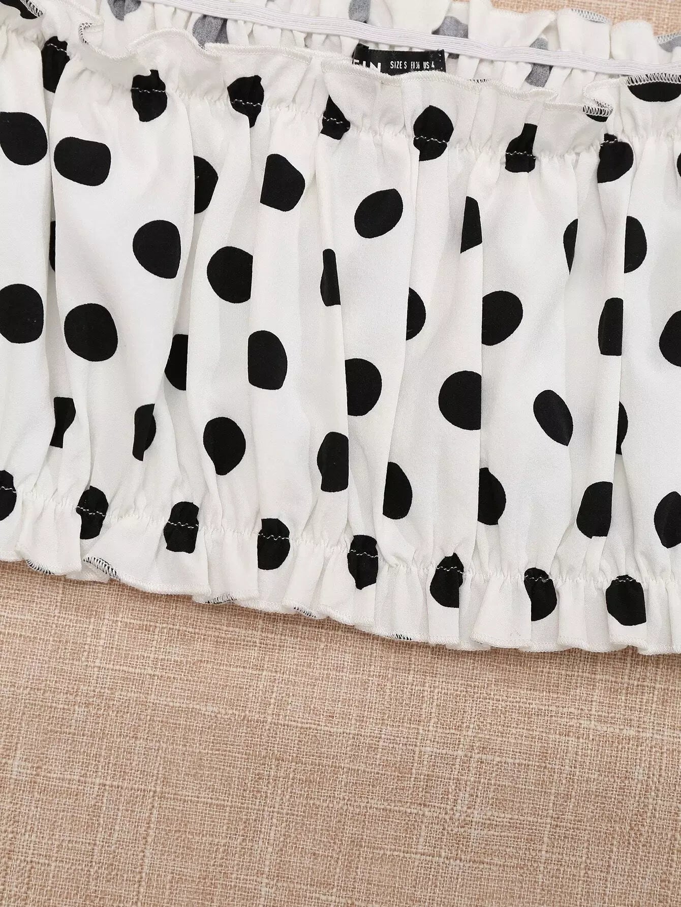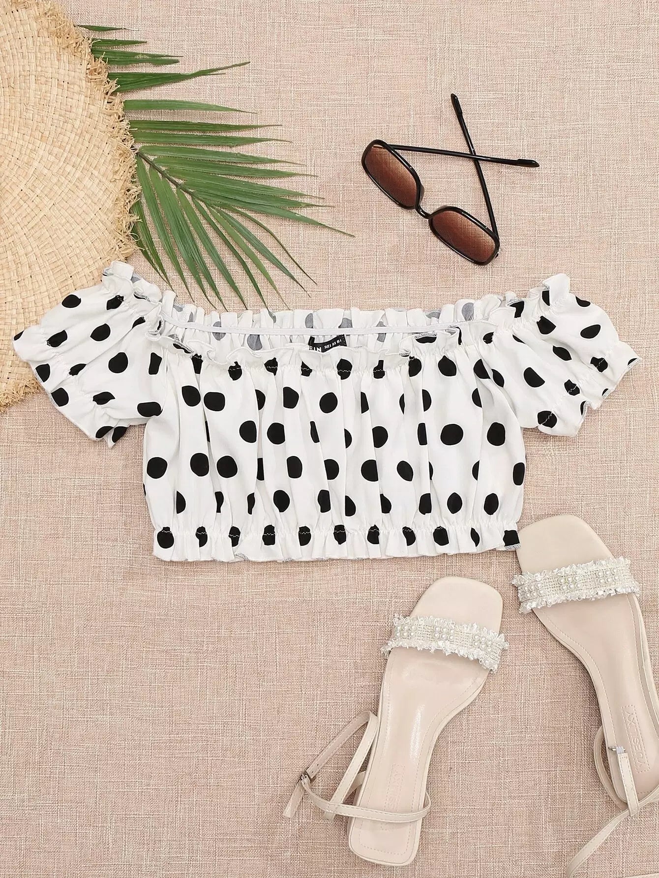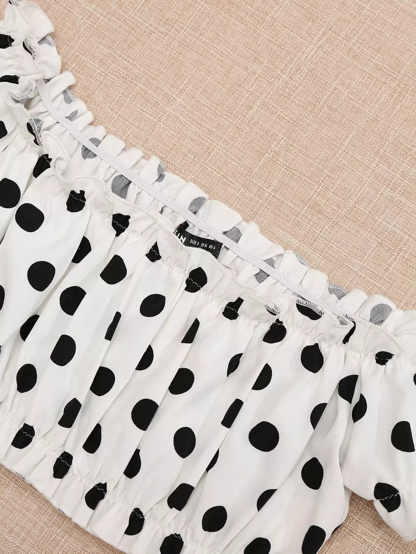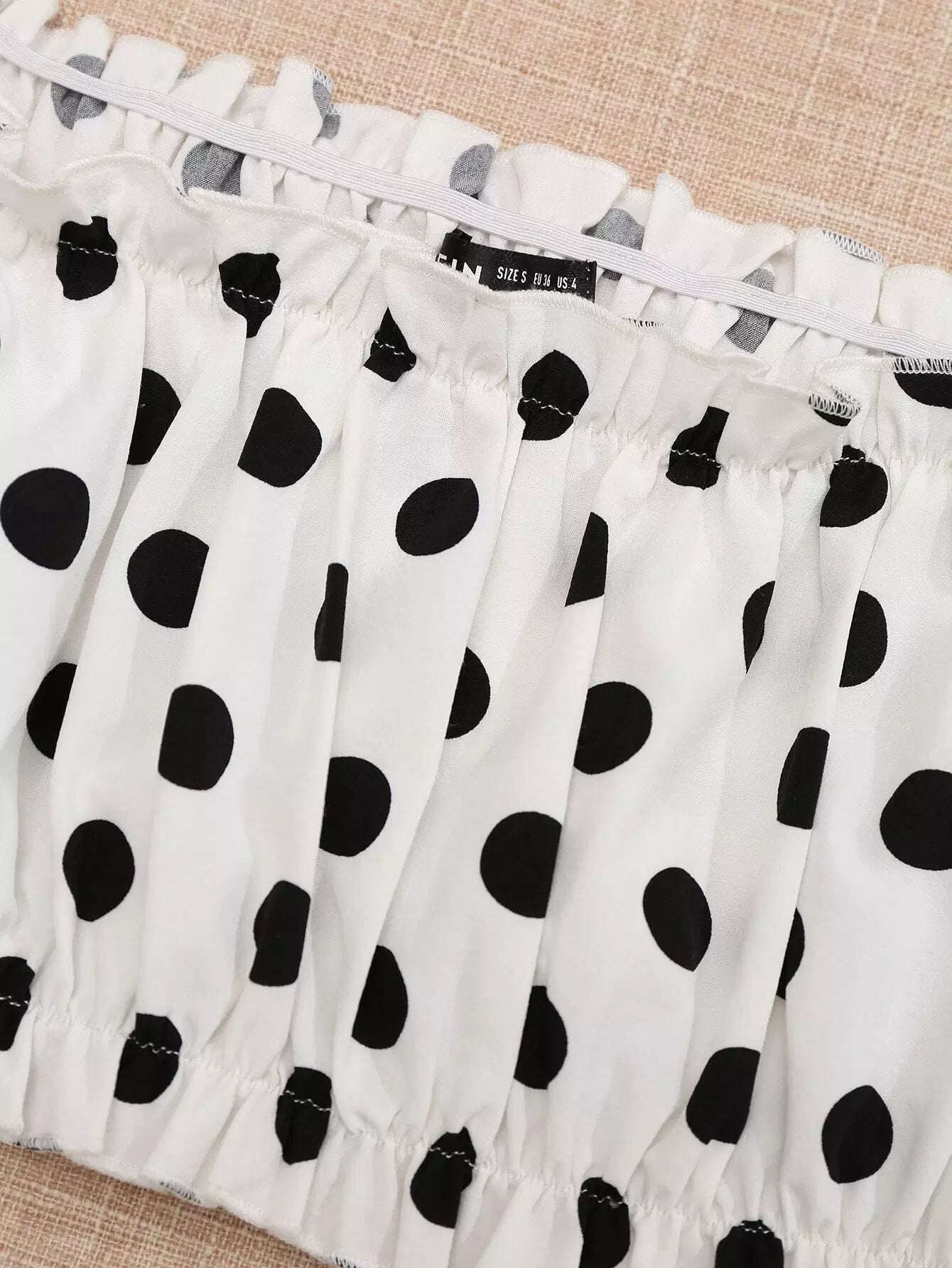 بلوزة باردو منقّطة مكشكشة ذات حواف مكشكشة