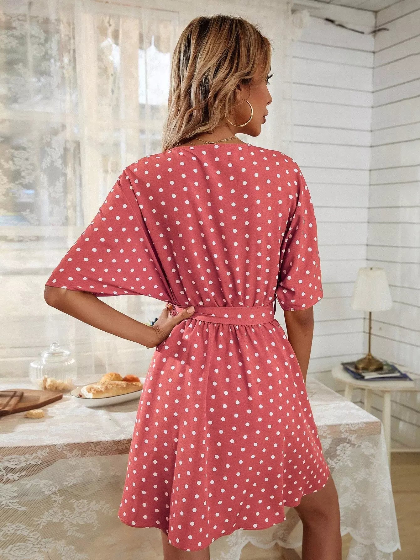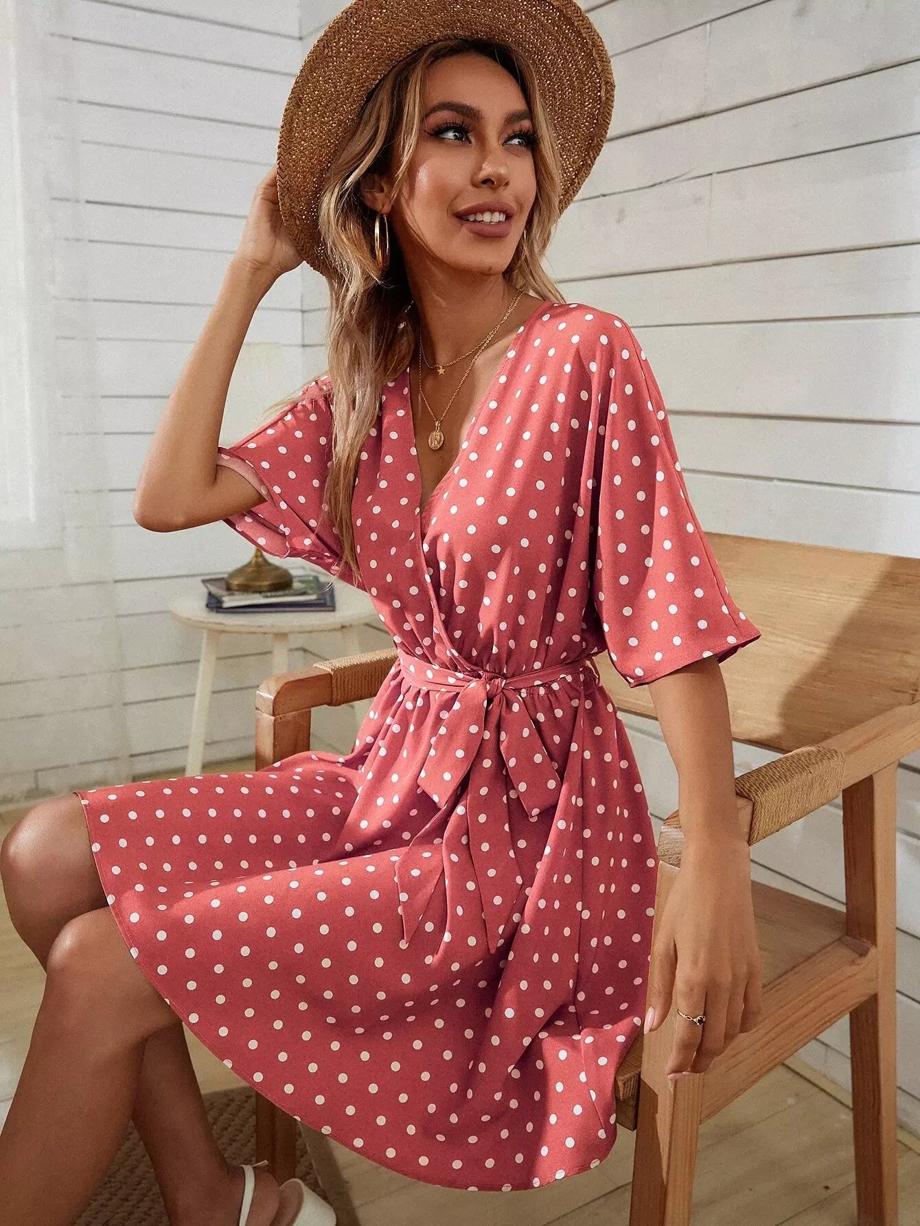 فستان منقّط برقبة واسعة بدون حزام