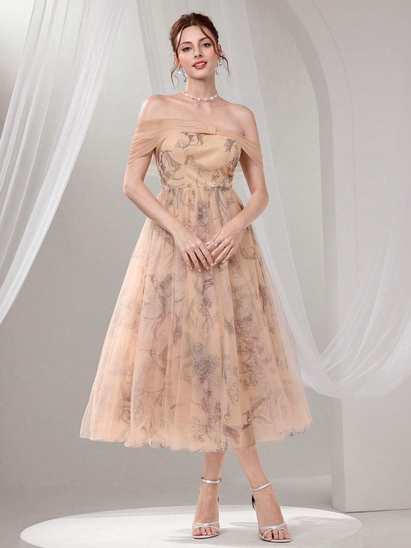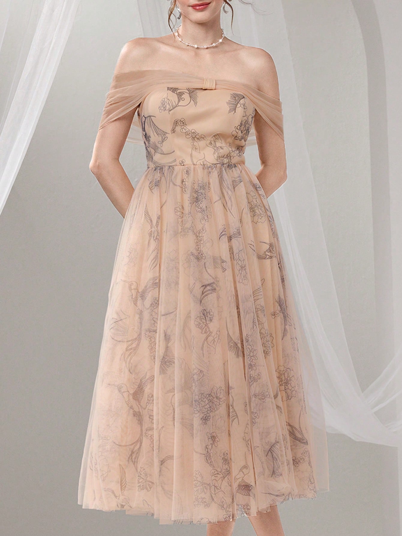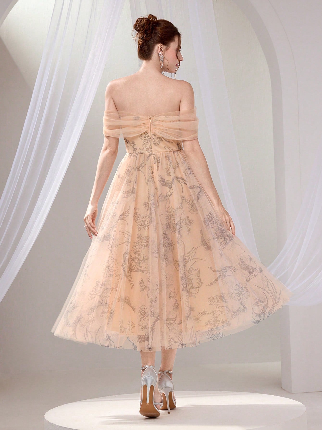 Poshira Women's Floral Print Off Shoulder Mesh Patchwork Elegant Ball Gown (Heavily Embroidered),Graduation