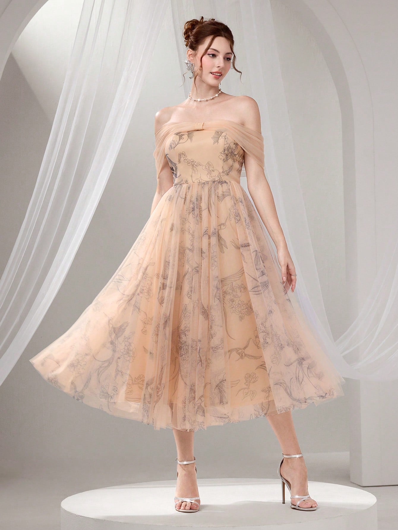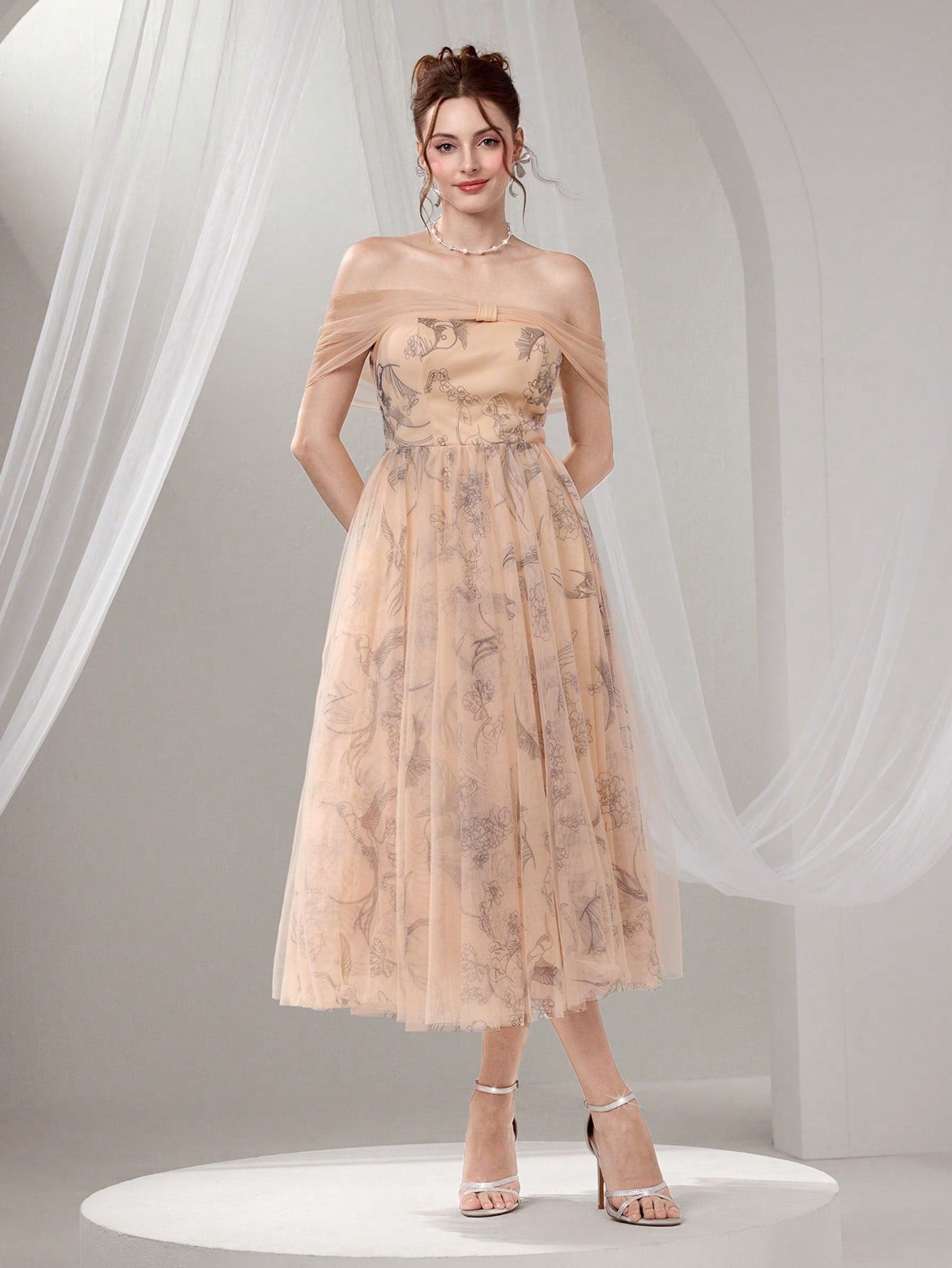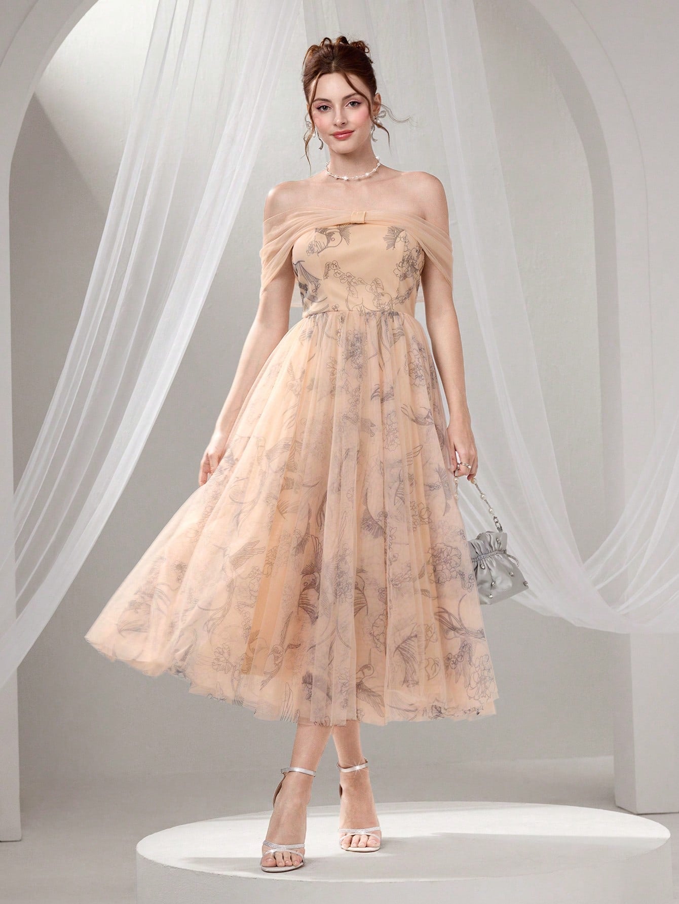 Poshira Women's Floral Print Off Shoulder Mesh Patchwork Elegant Ball Gown (Heavily Embroidered),Graduation