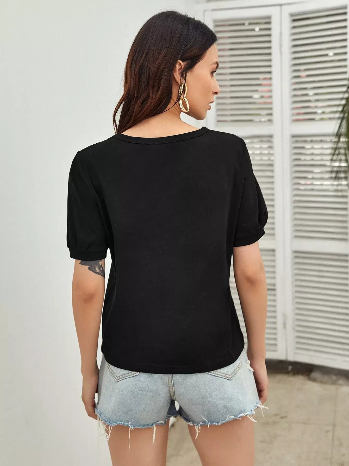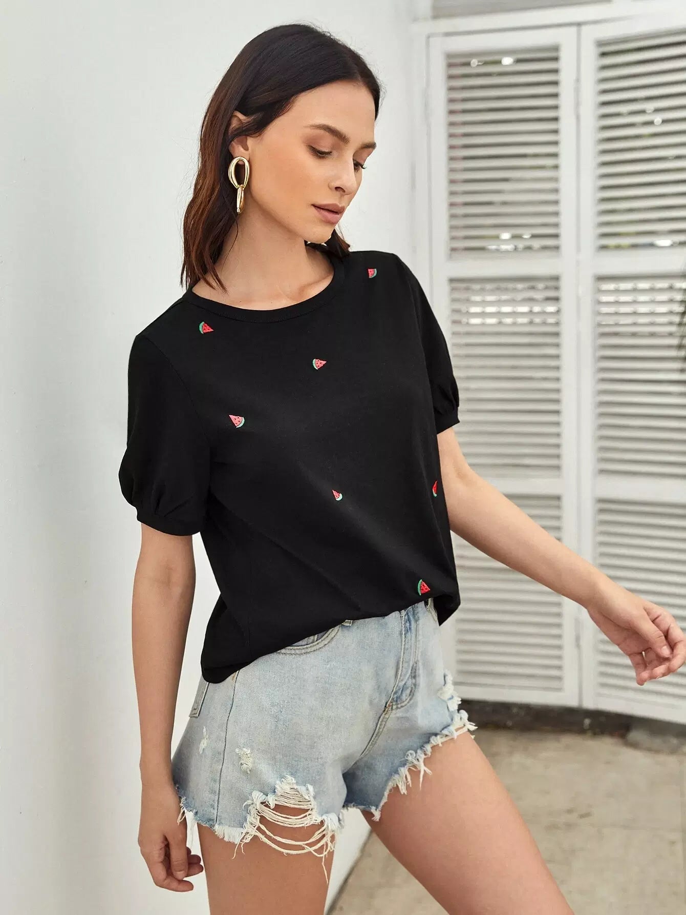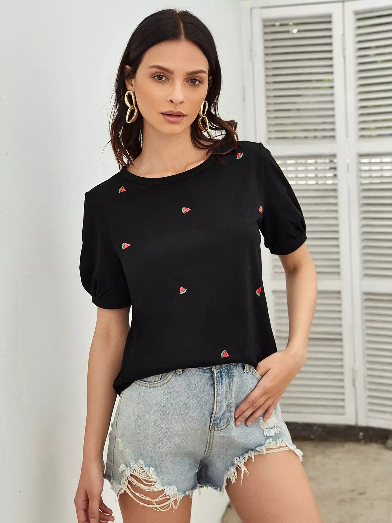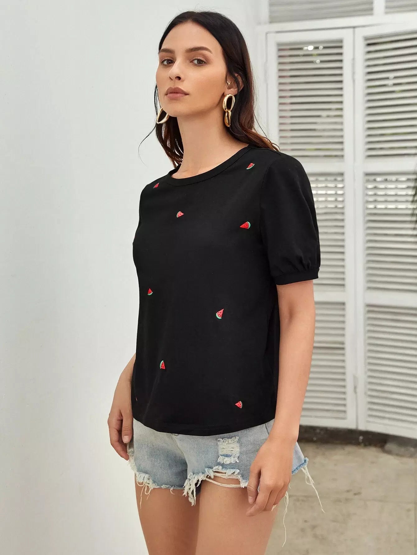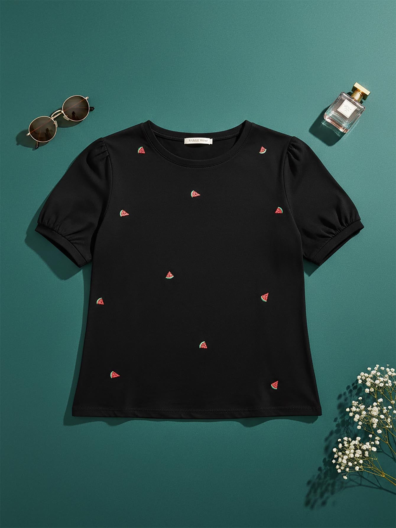 تي شيرت بأكمام منفوخة وتطريز بطيخة