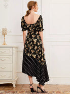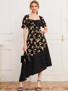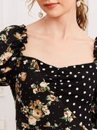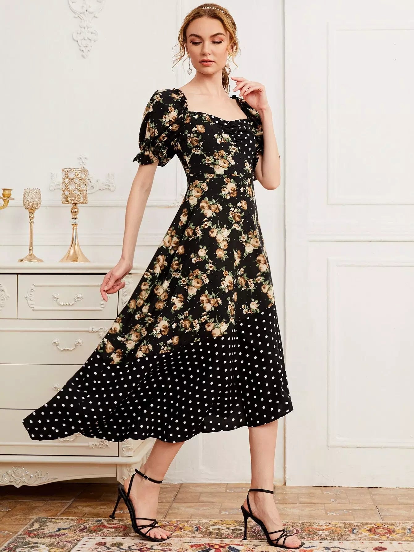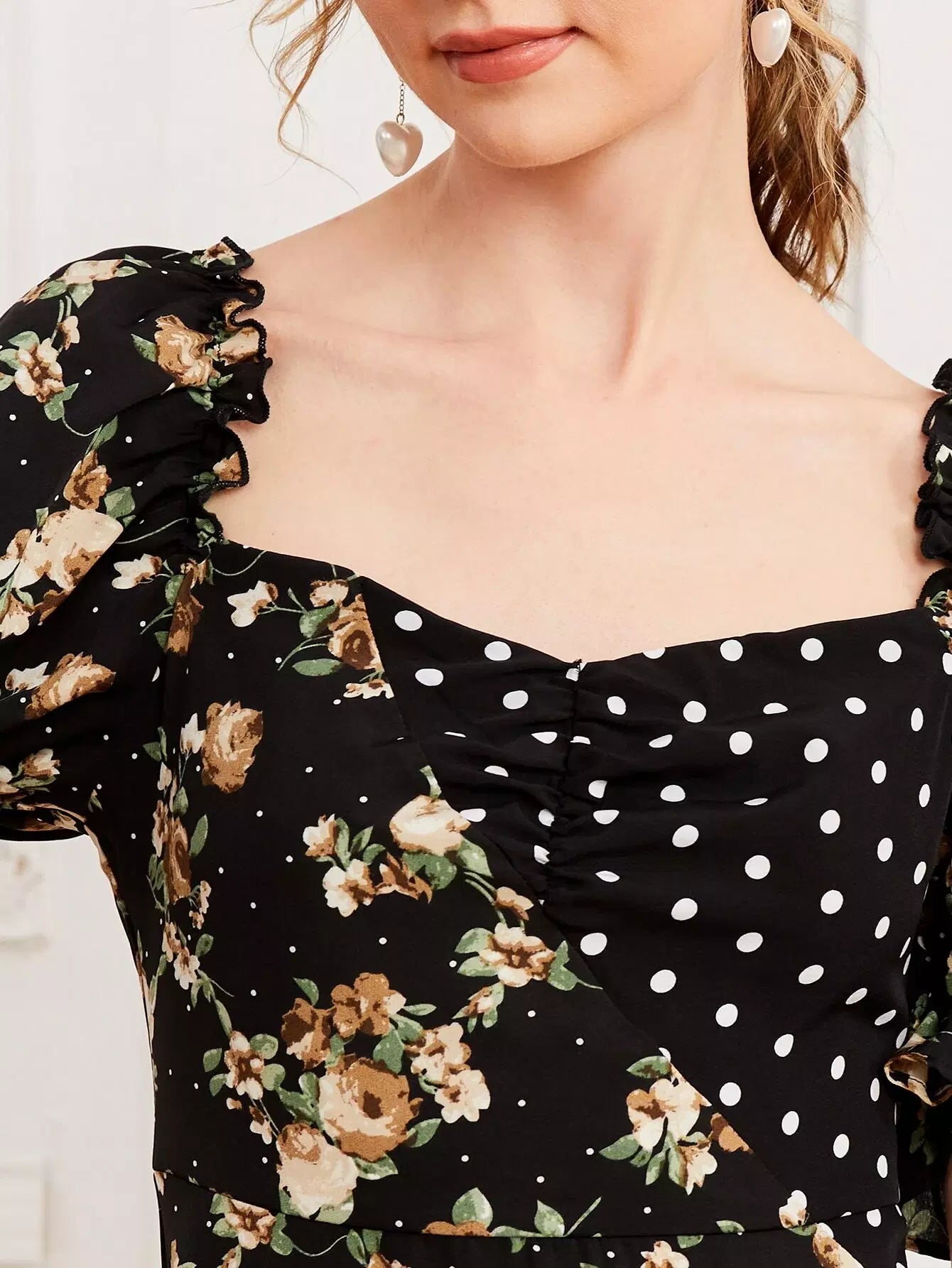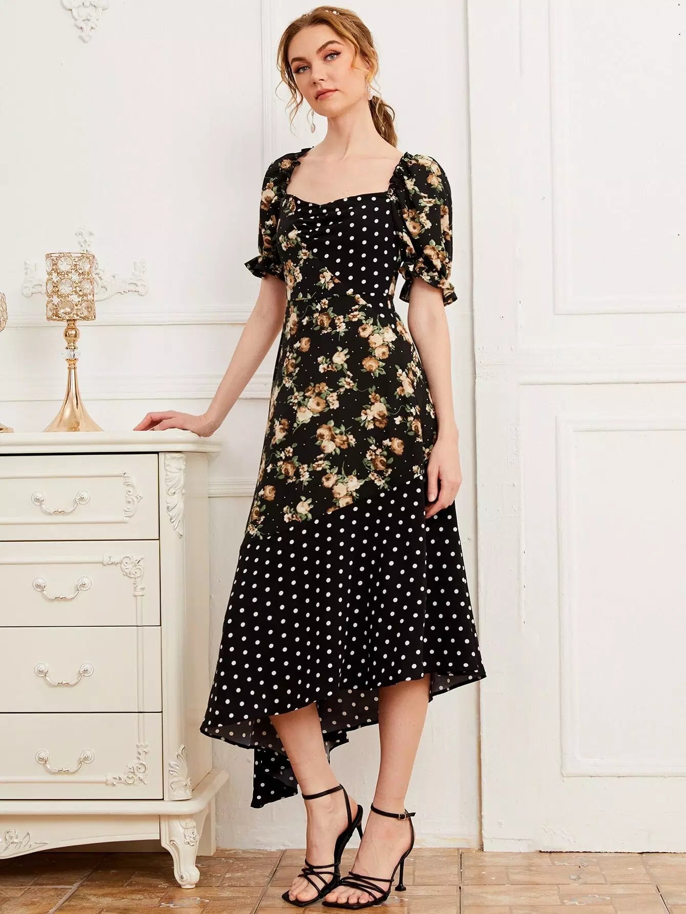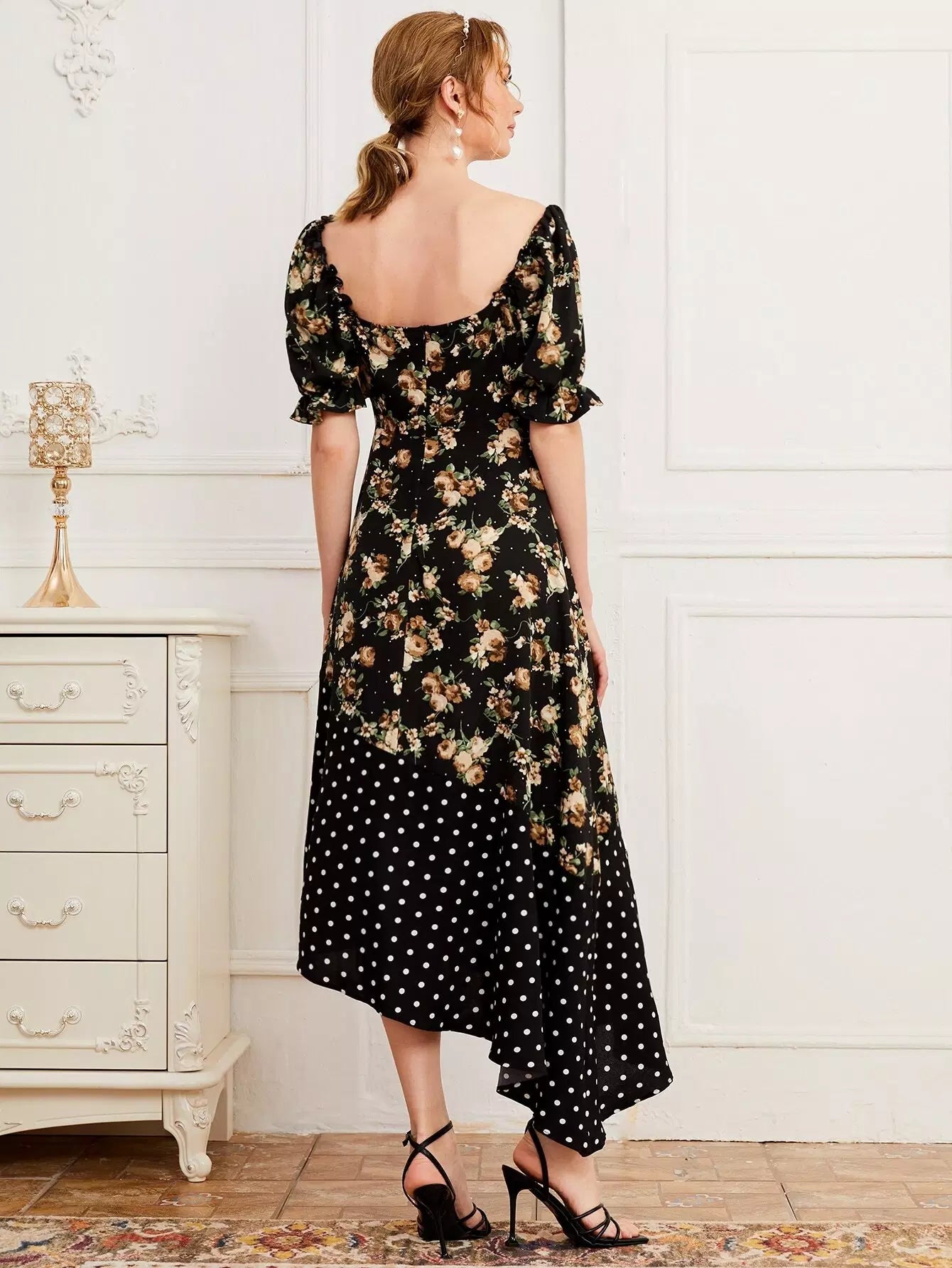 فستان بأكمام منفوخة وفتحة رقبة على شكل قلب وطبعات زهور ونقاط وحاشية غير متماثلة