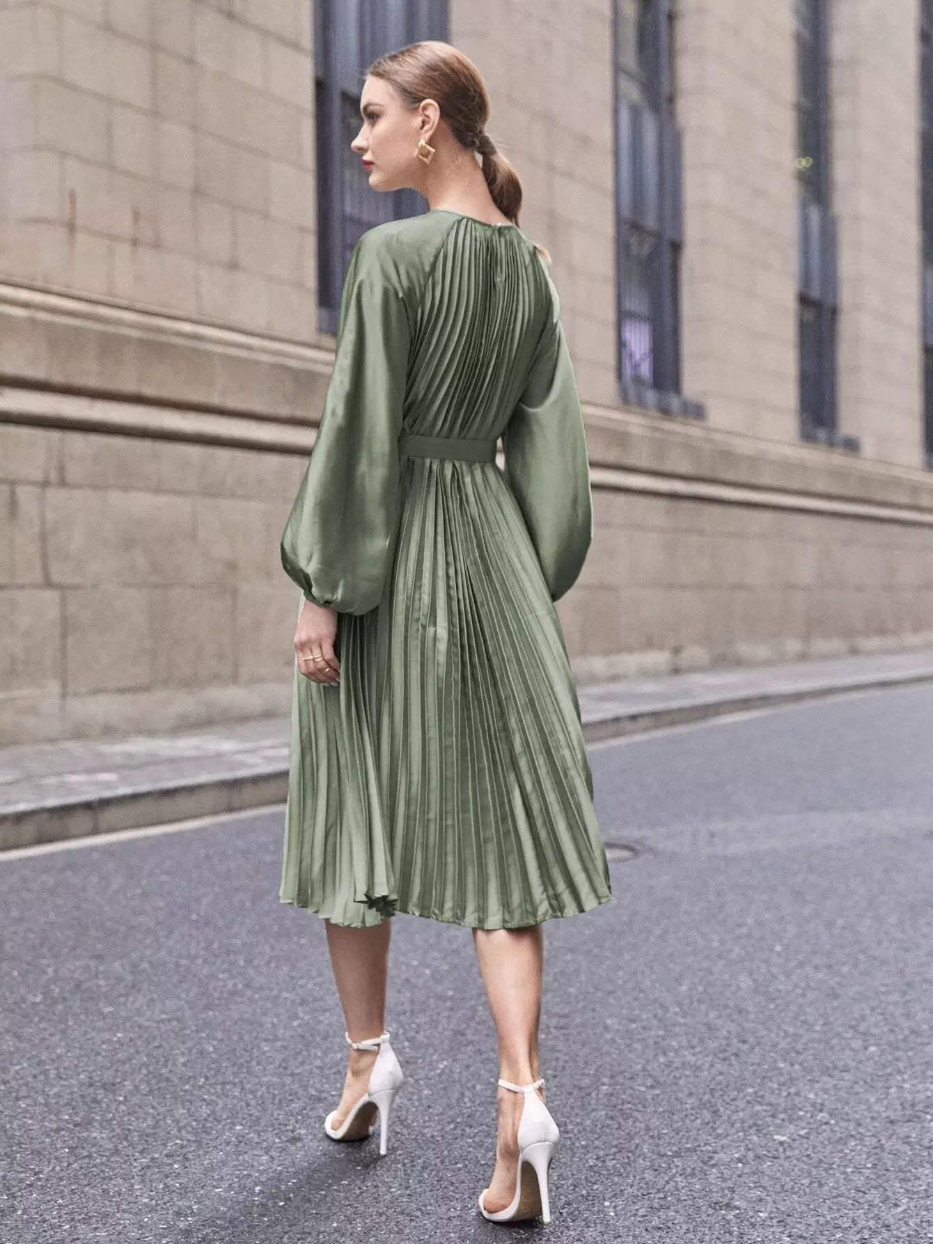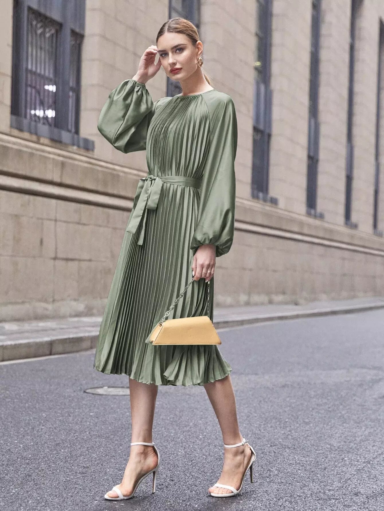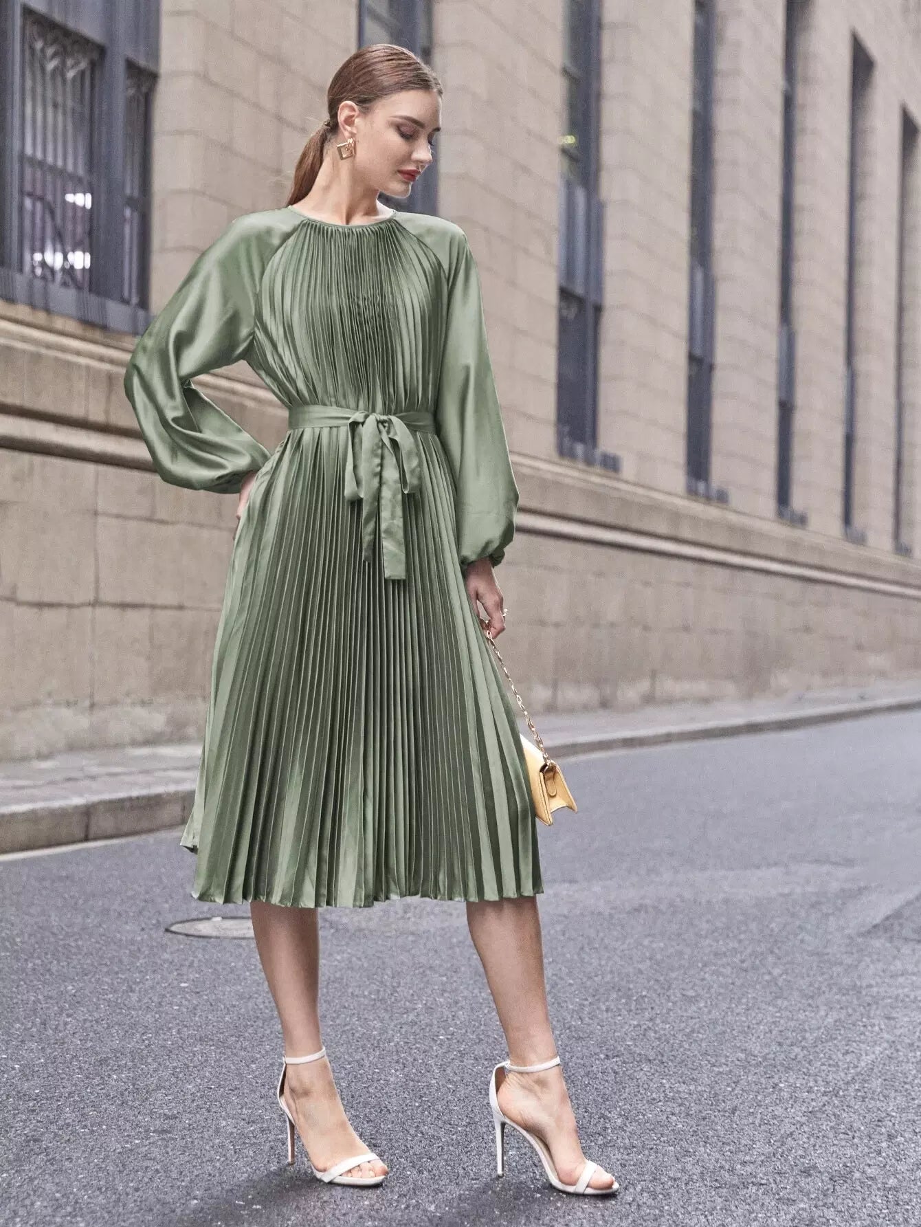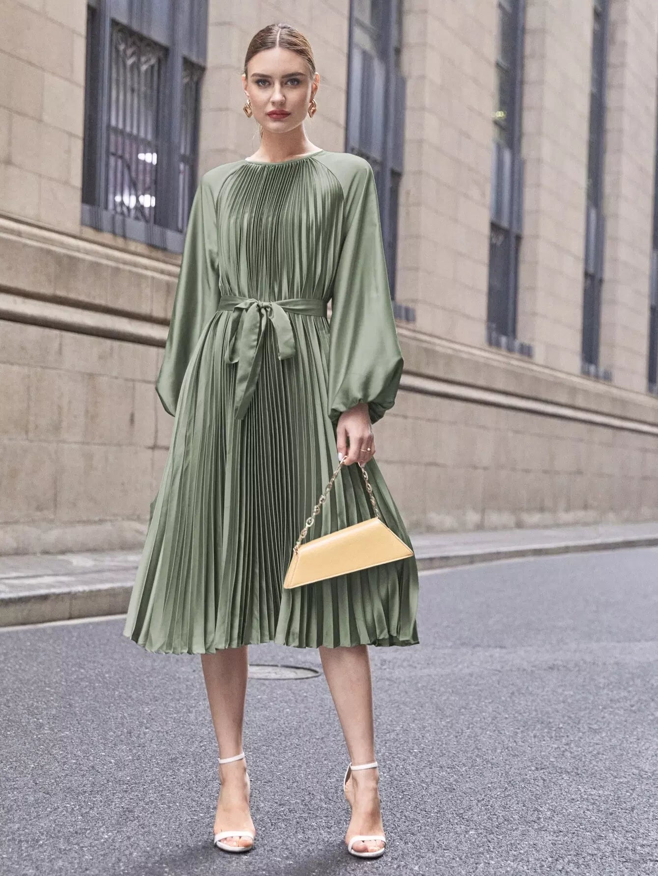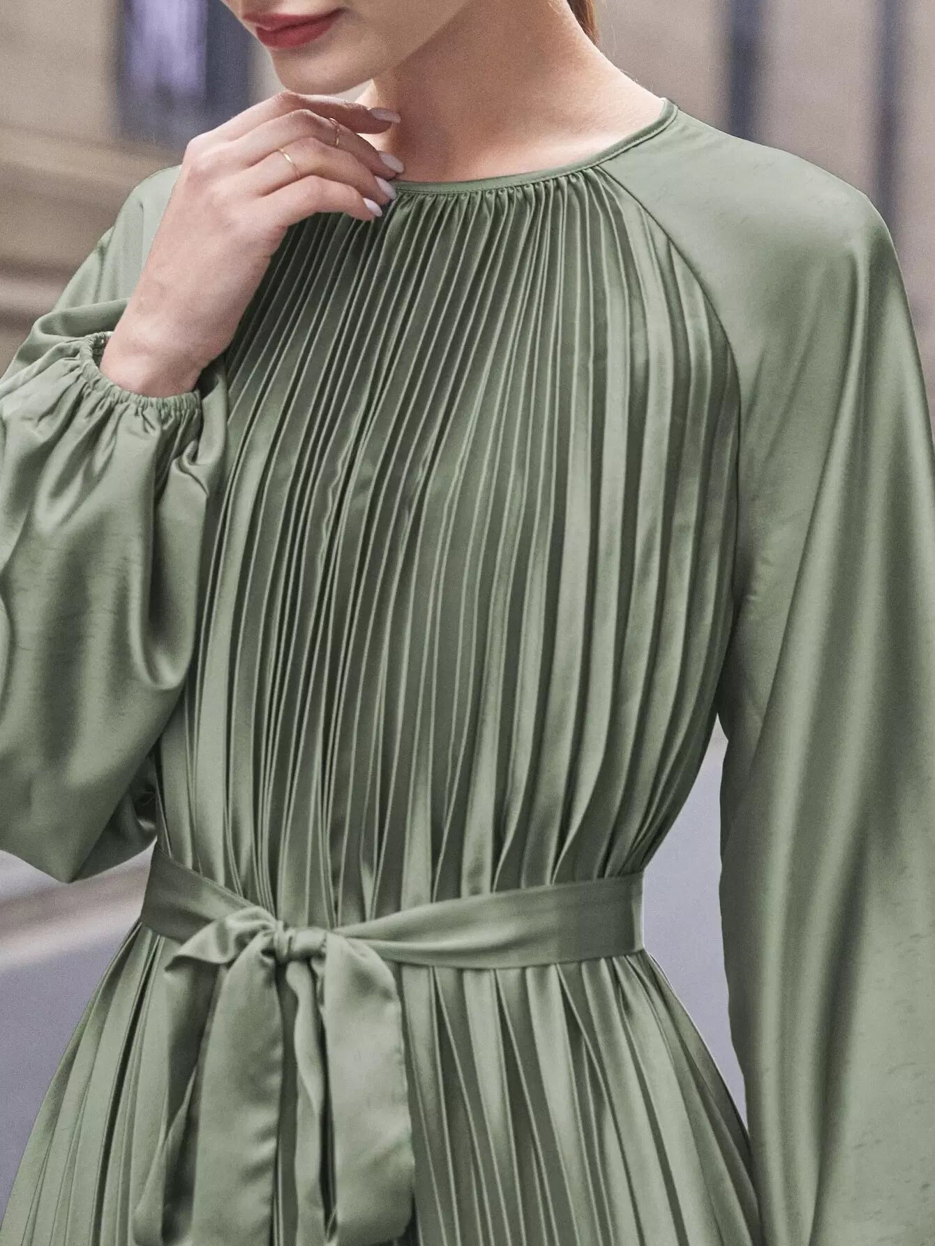 فستان راجلان بأكمام واسعة وثنيات من الساتان بدون حزام