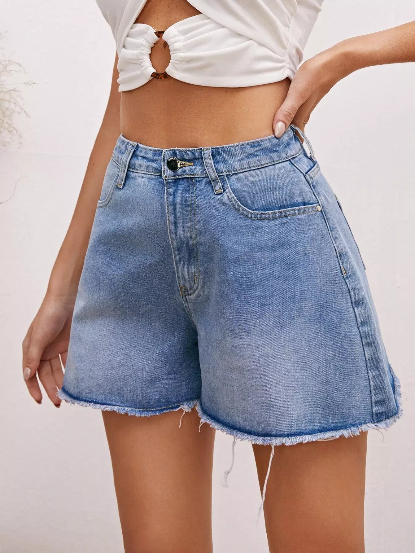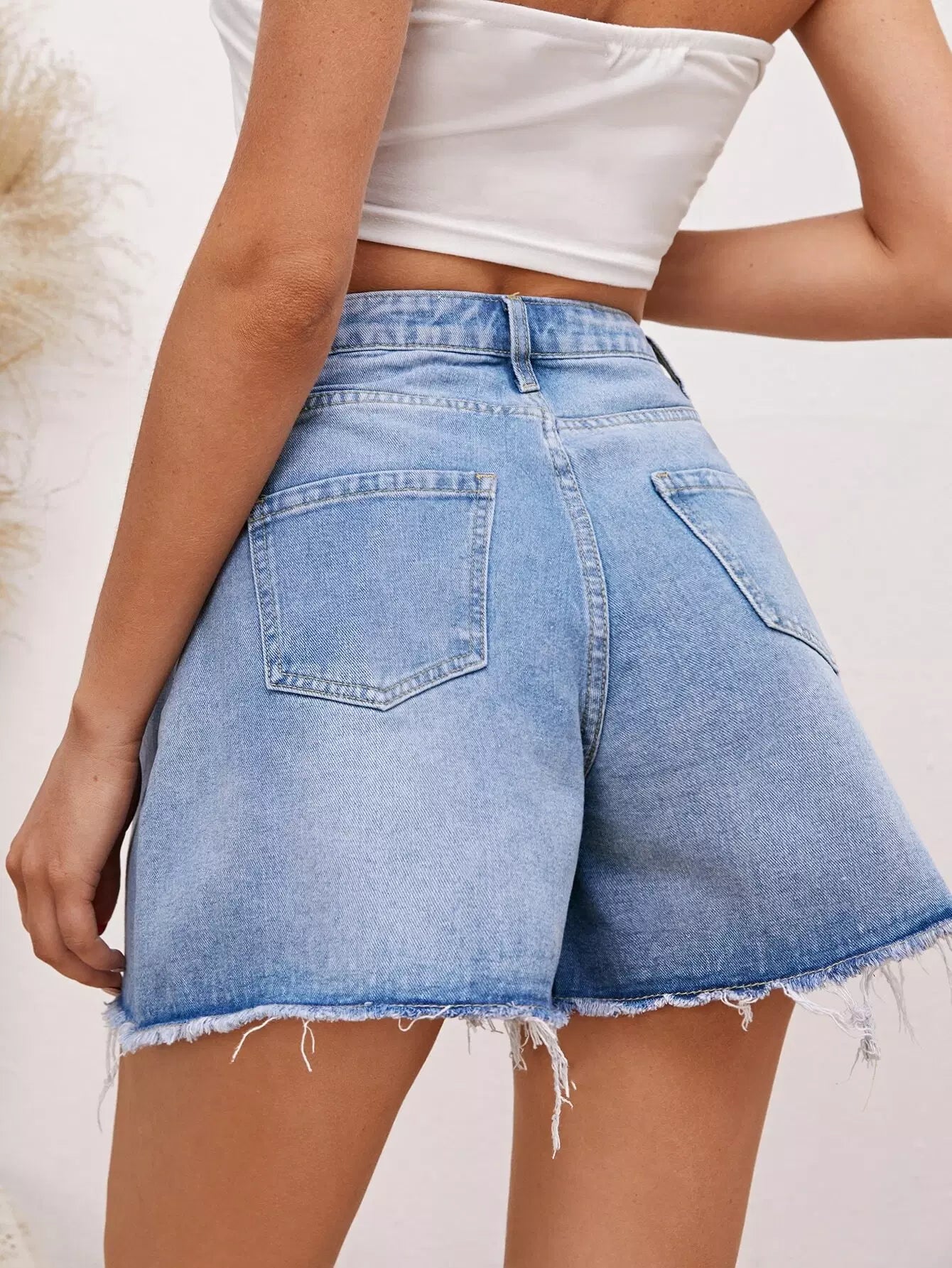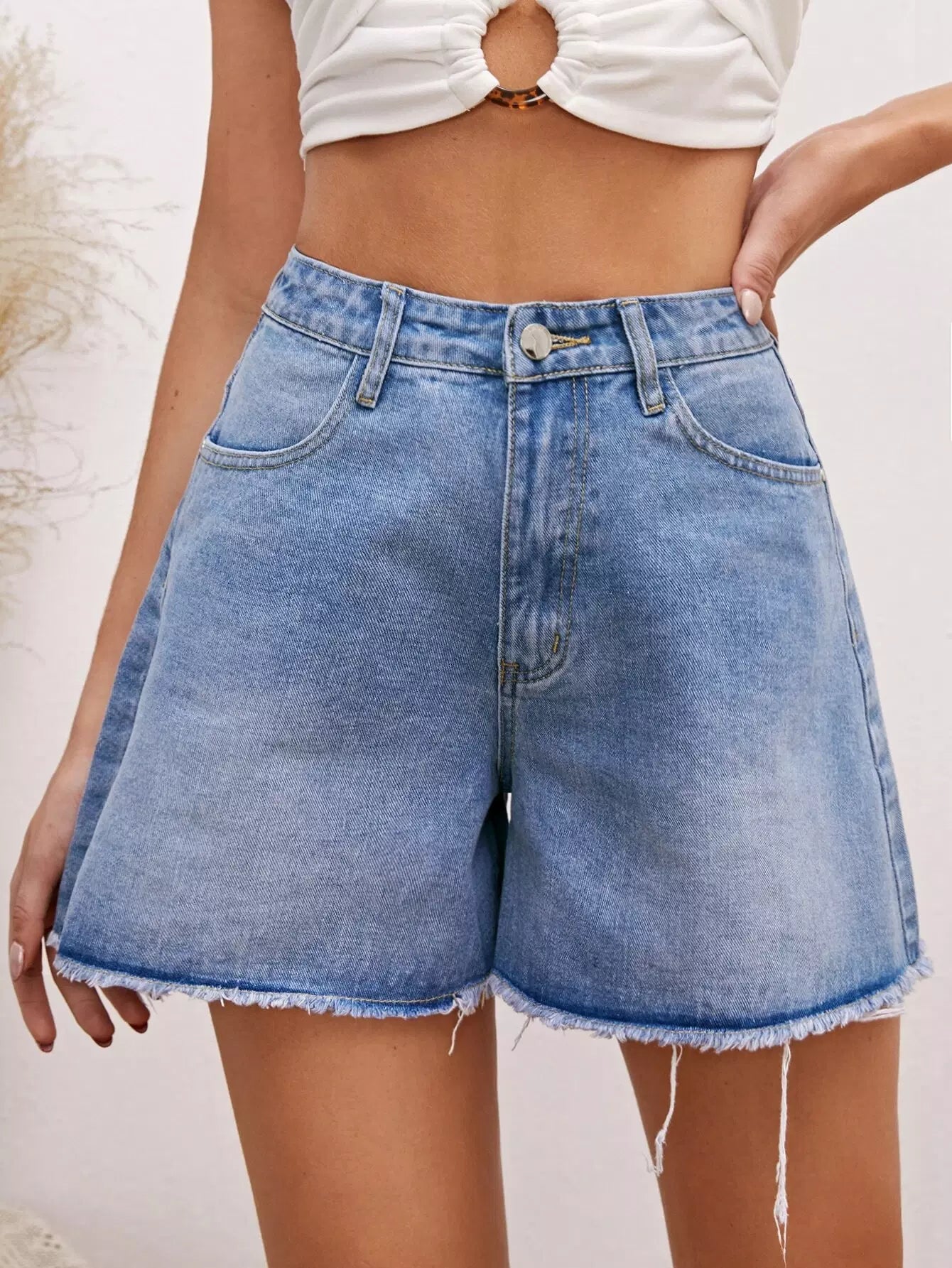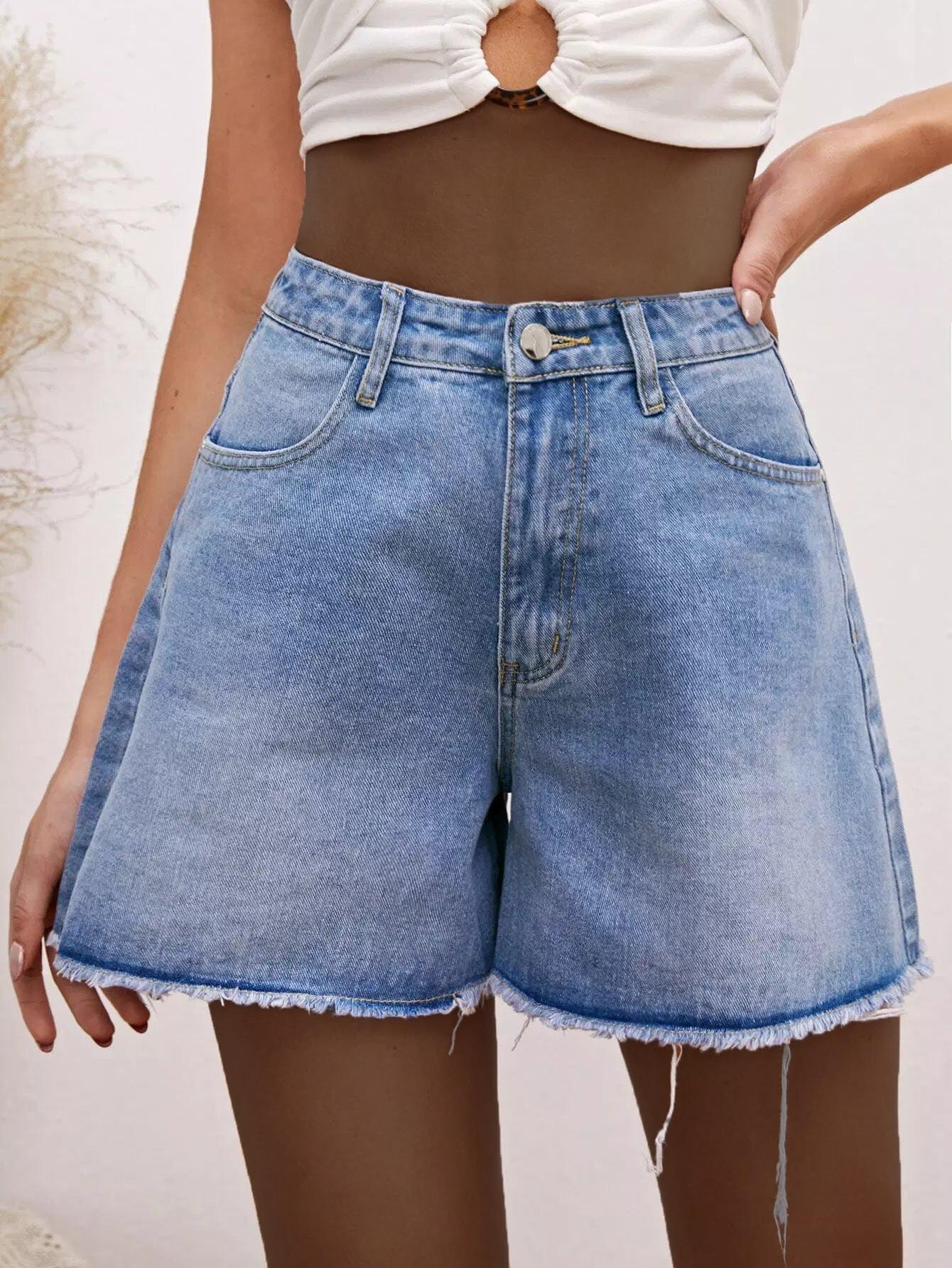 شورت دنيم بحاشية خام واسع الساقين
