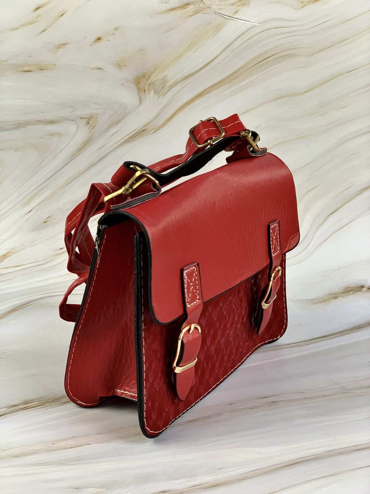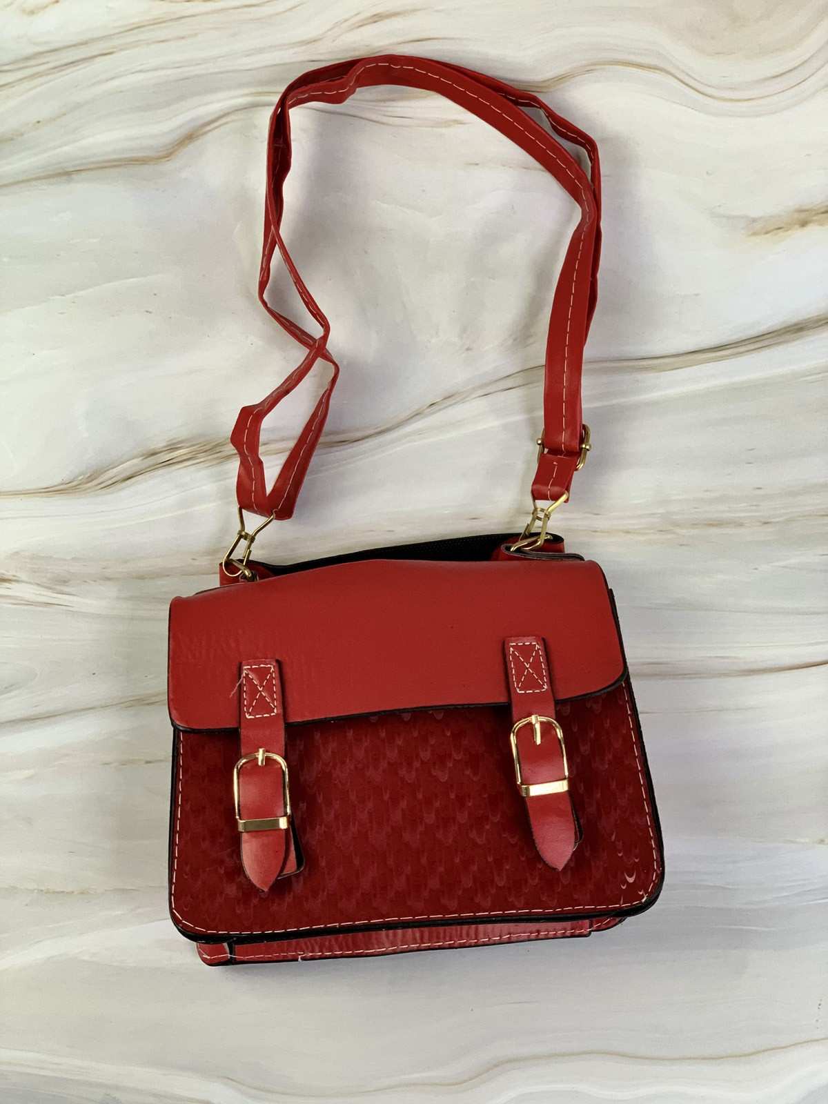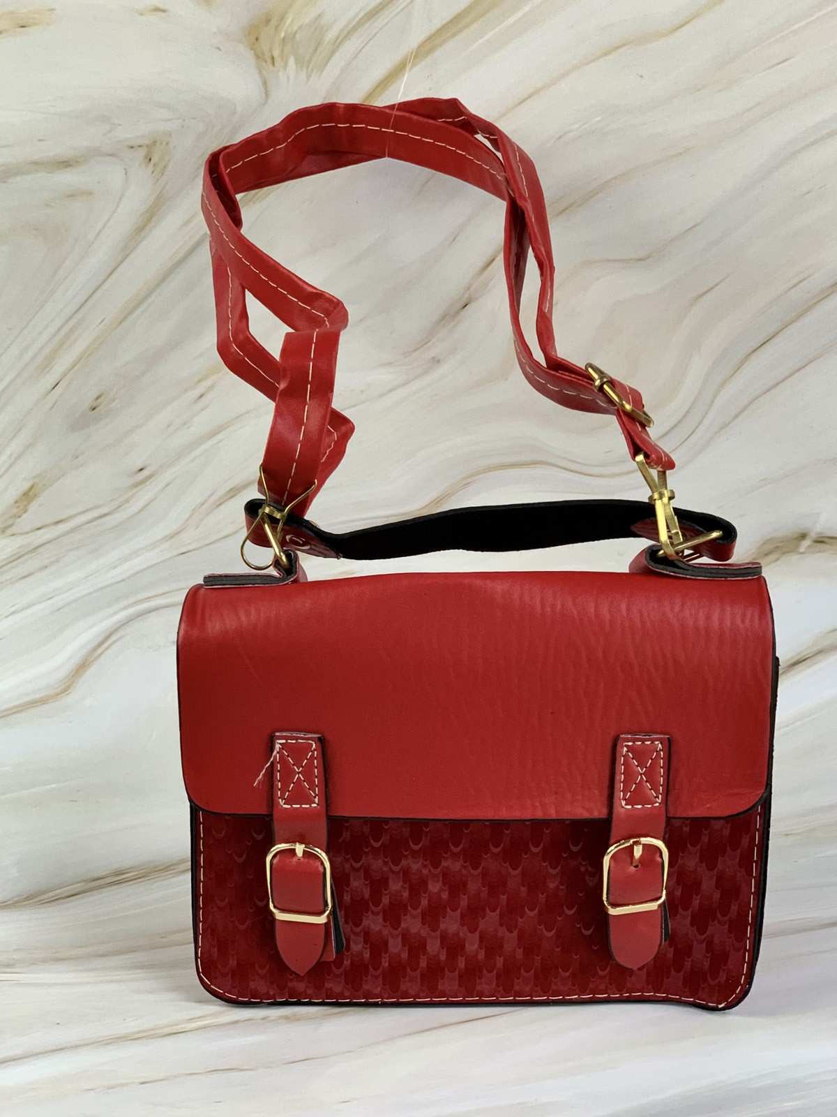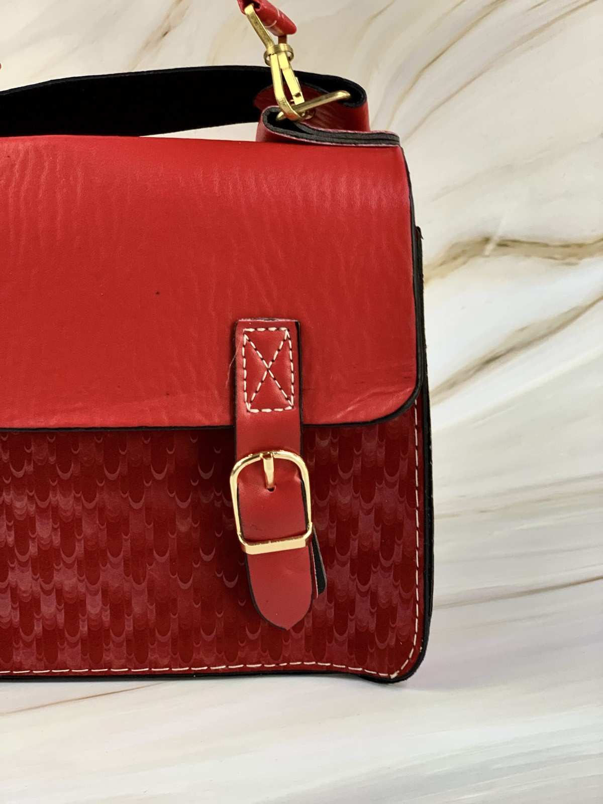 حقيبة حمراء مع حلقة معدنية مزخرفة