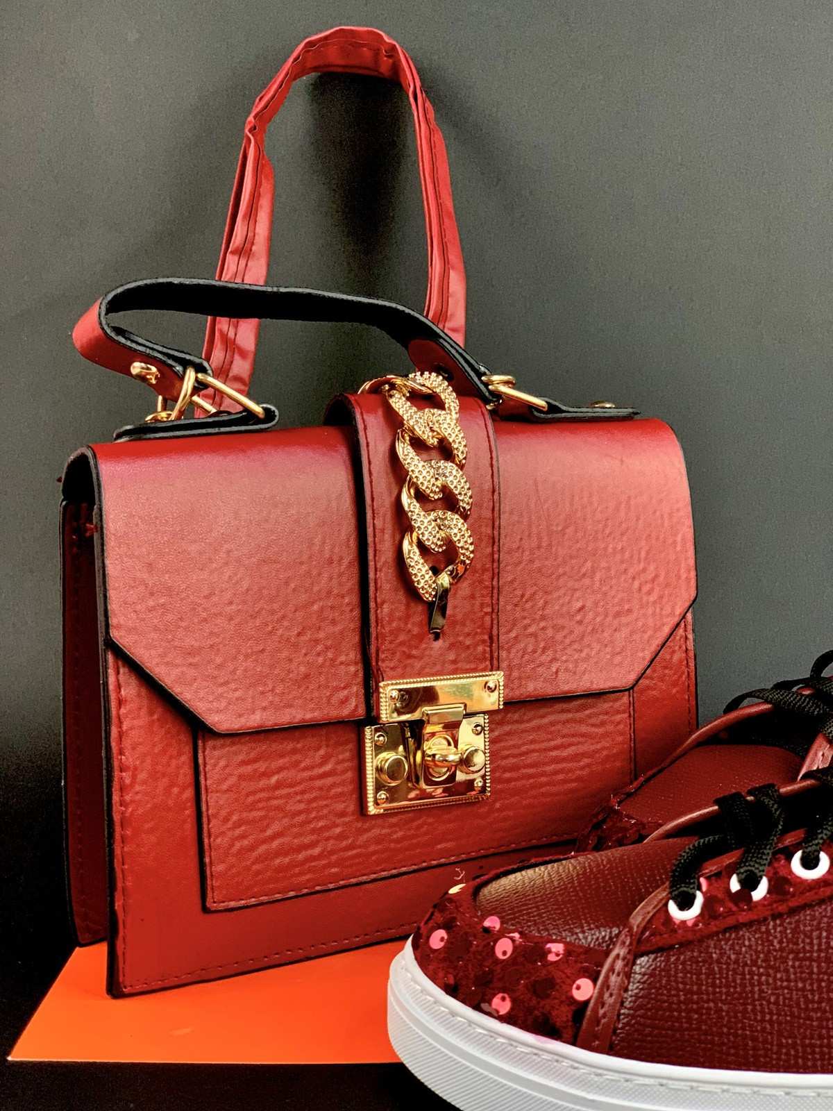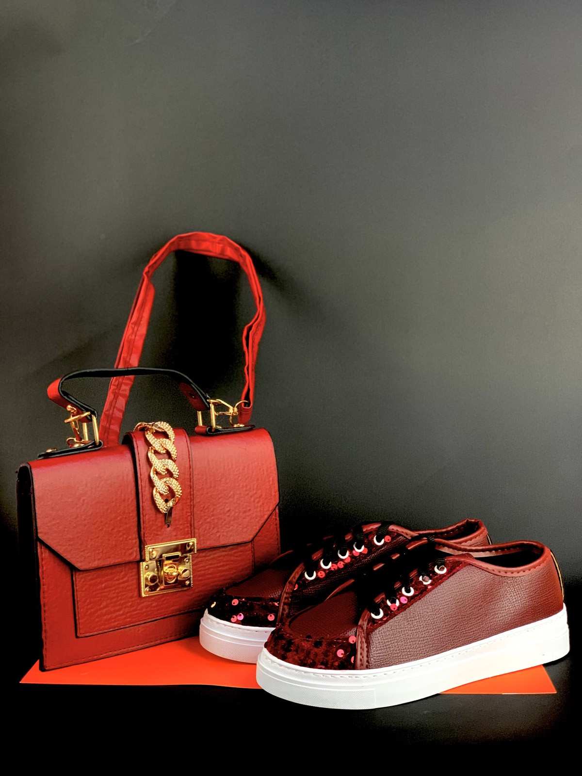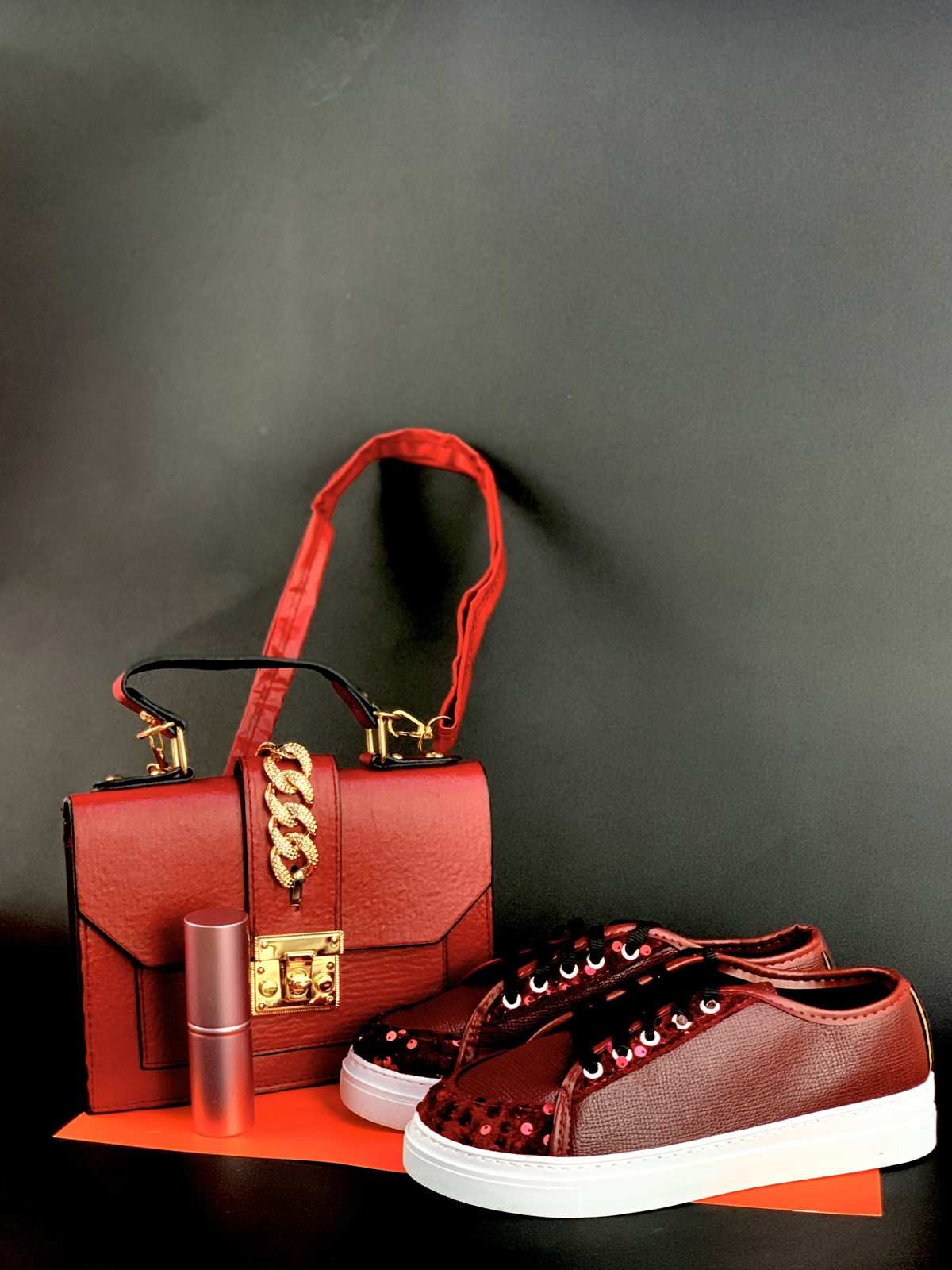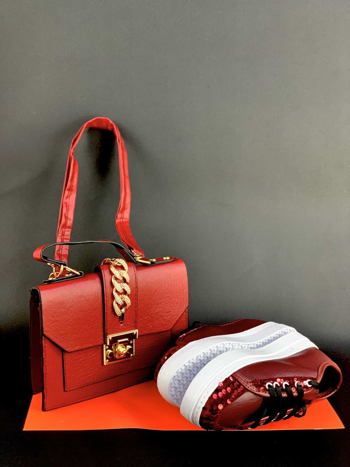 للنساء - حقيبة حمراء مع حذاء رياضي لامع