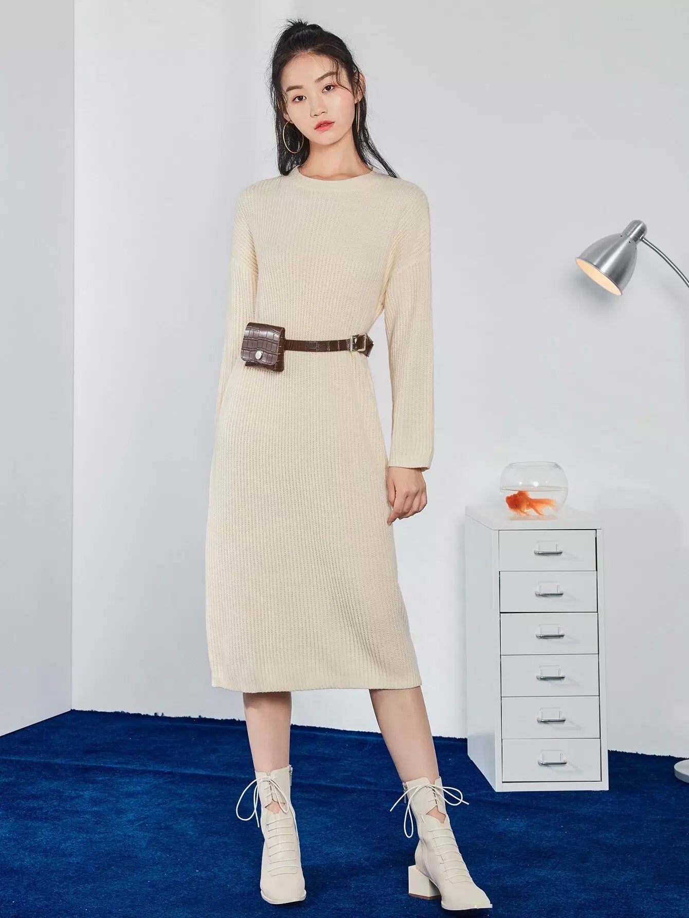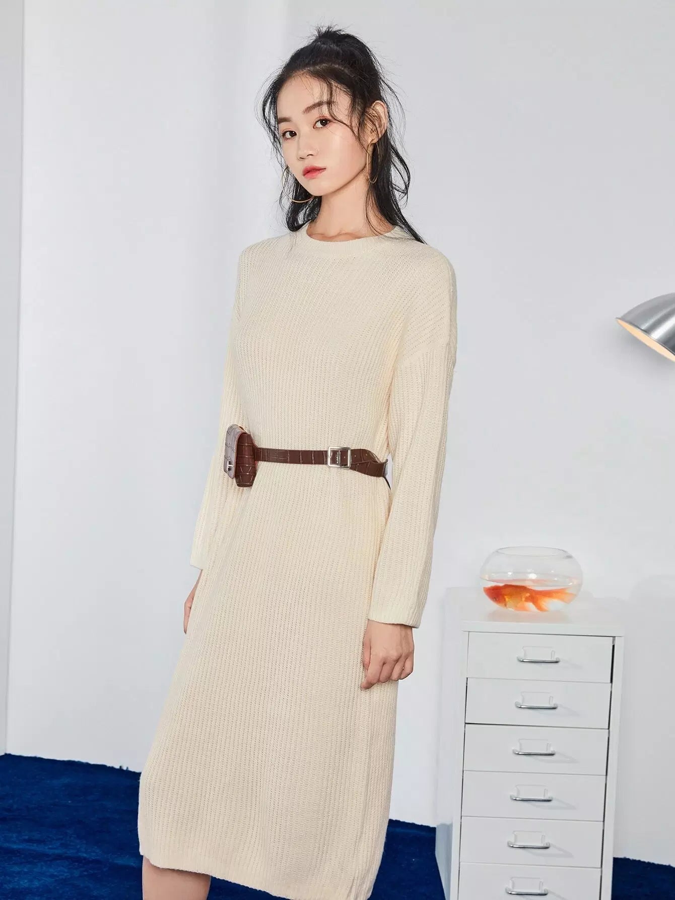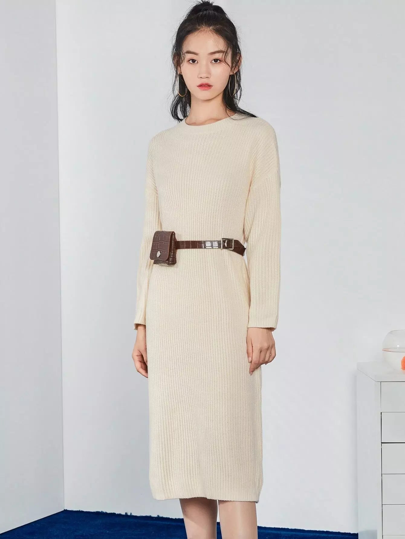 فستان منسدل الكتف محبوك مضلع منسدل الكتف بدون حقيبة خصر