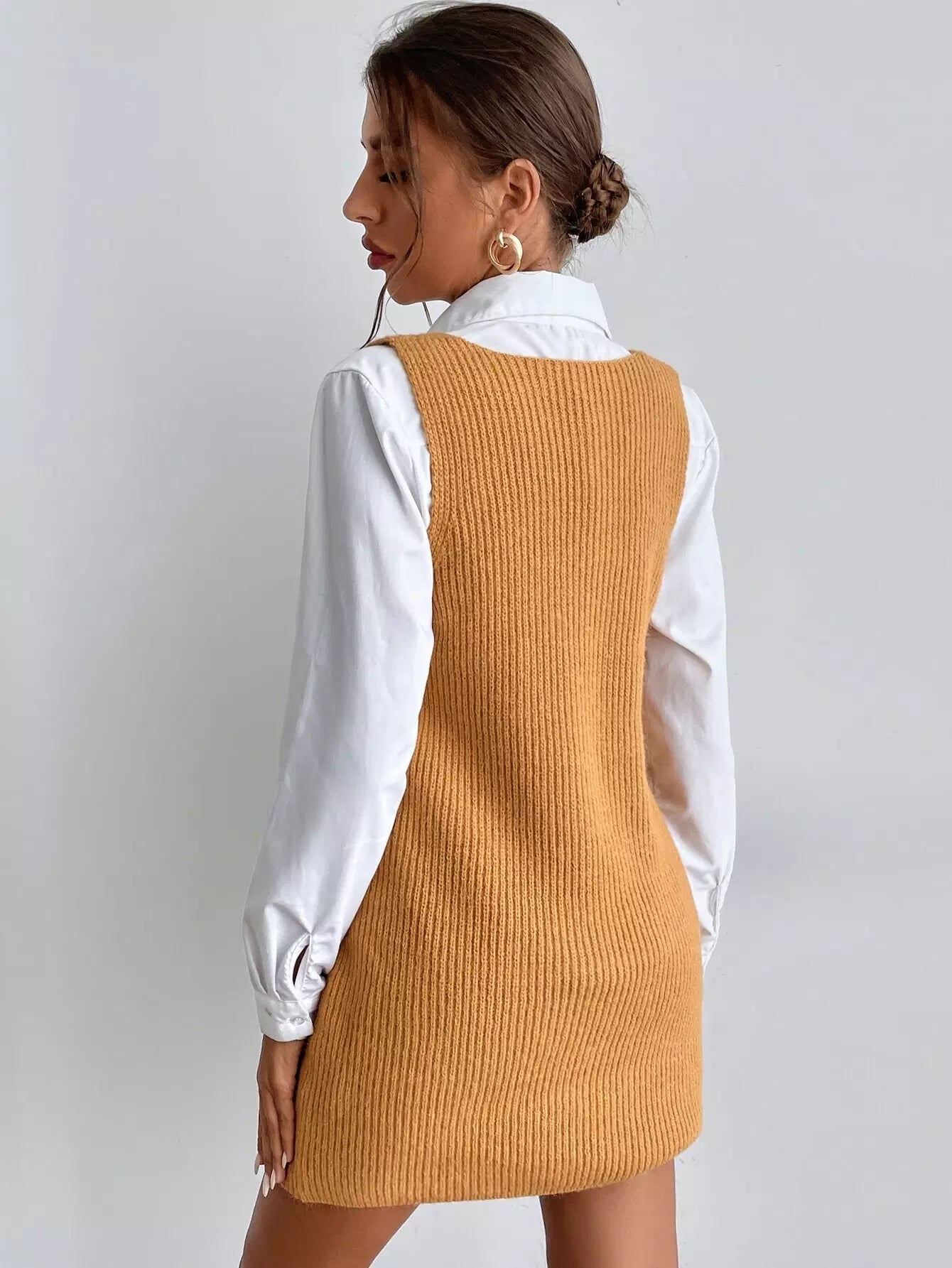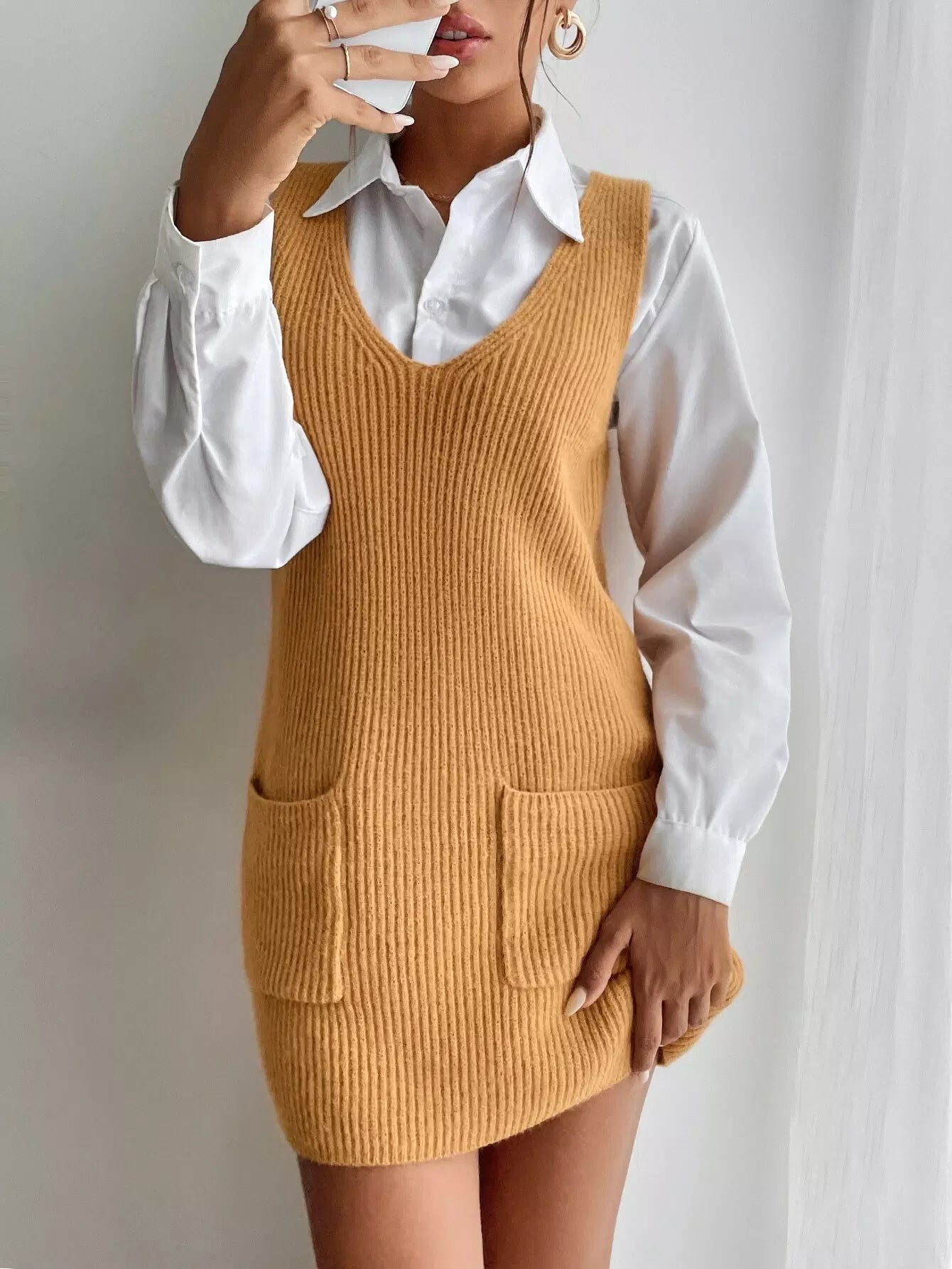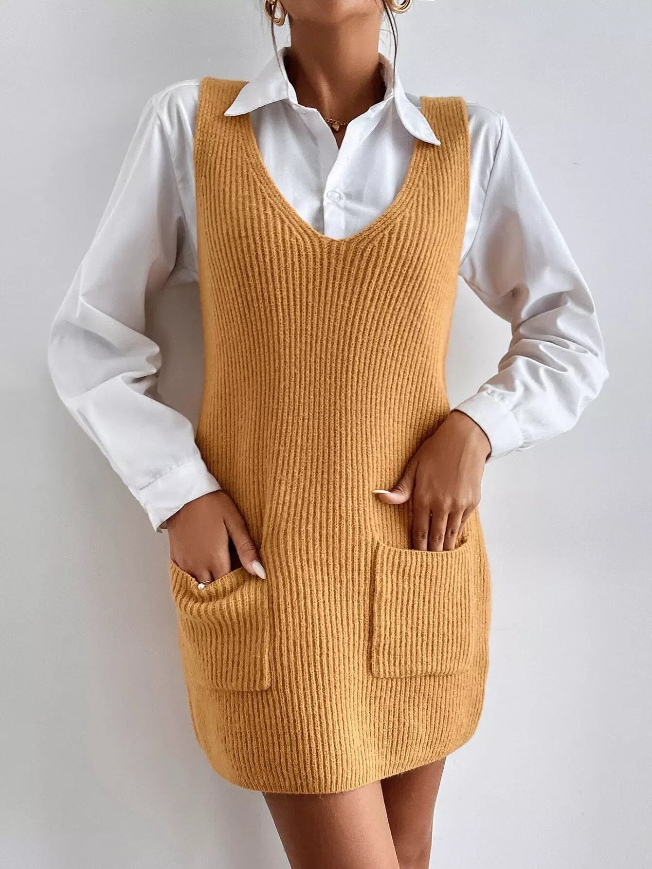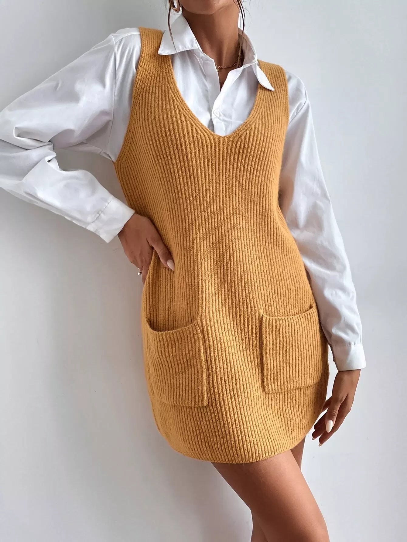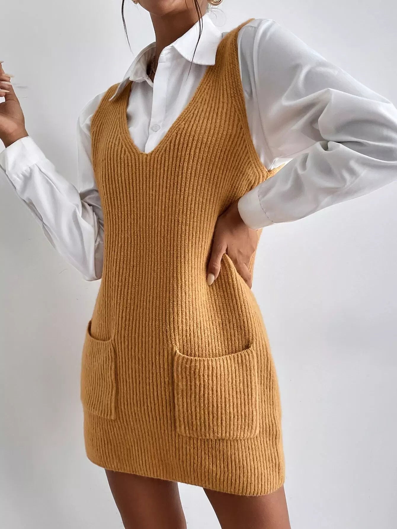 فستان كنزة مضلعة محبوكة بجيوب مرقعة بدون بلوزة