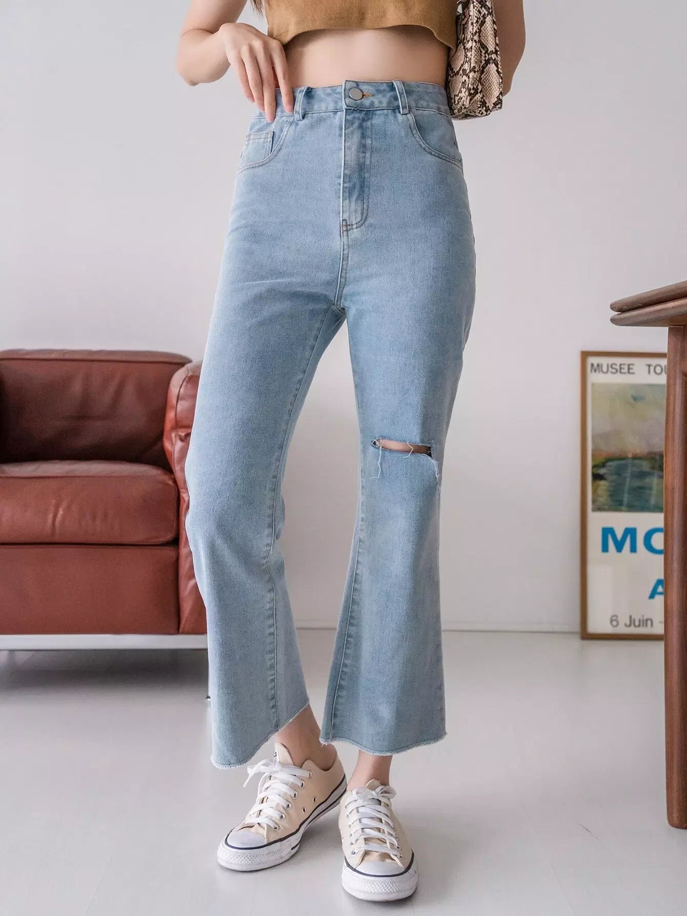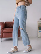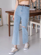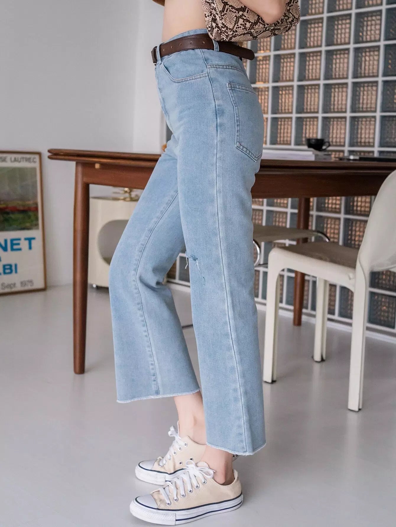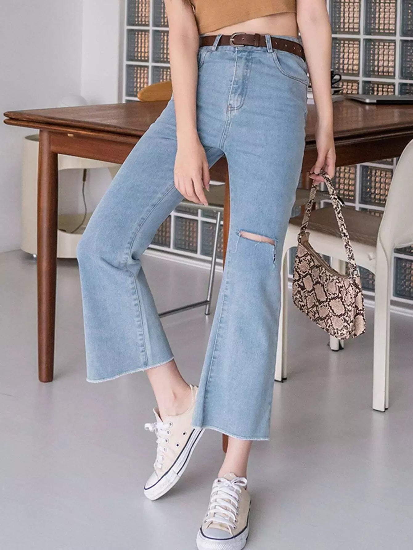 بنطلون جينز بحواف ممزق بحواف ممزقة واسعة الساقين بدون حزام
