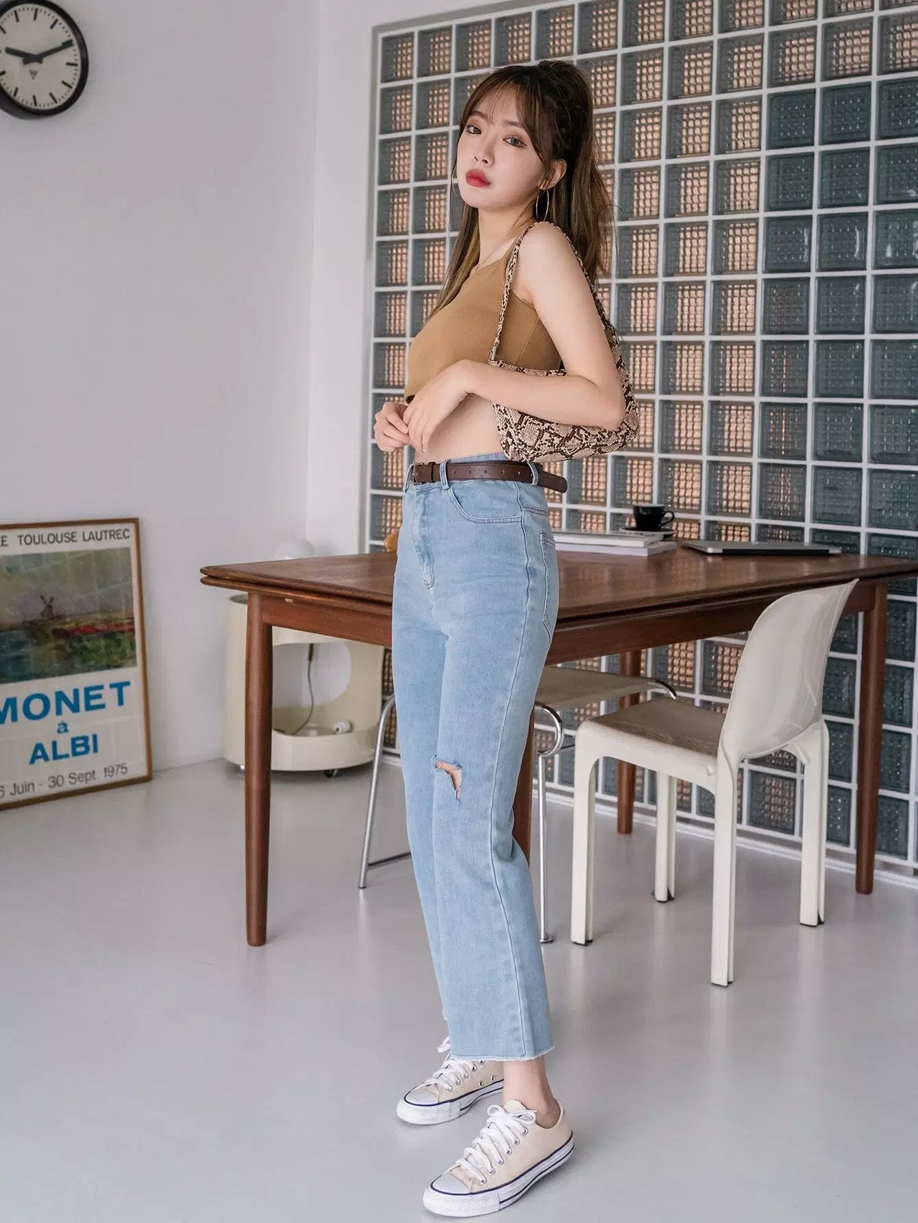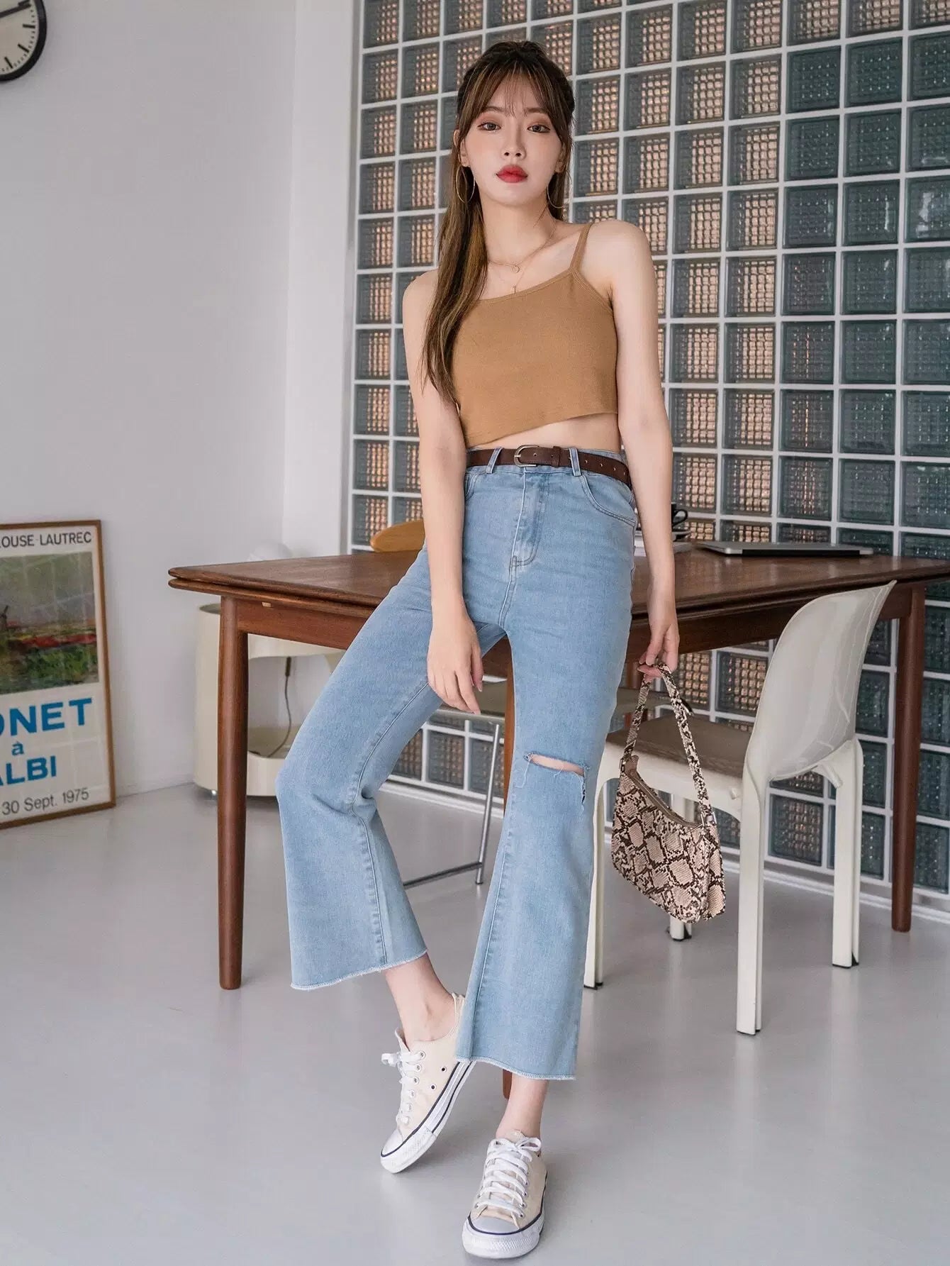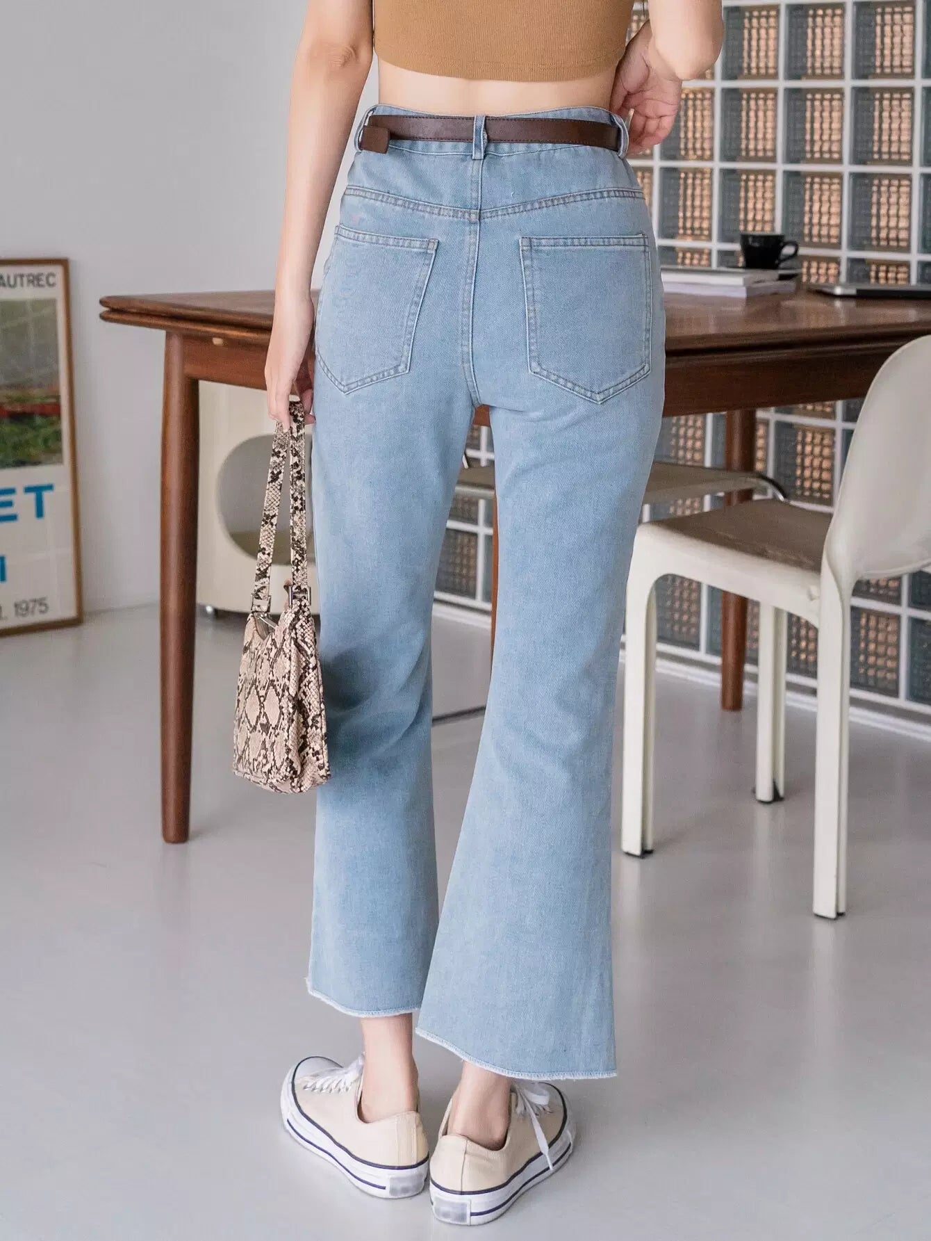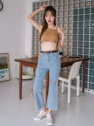 بنطلون جينز بحواف ممزق بحواف ممزقة واسعة الساقين بدون حزام