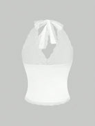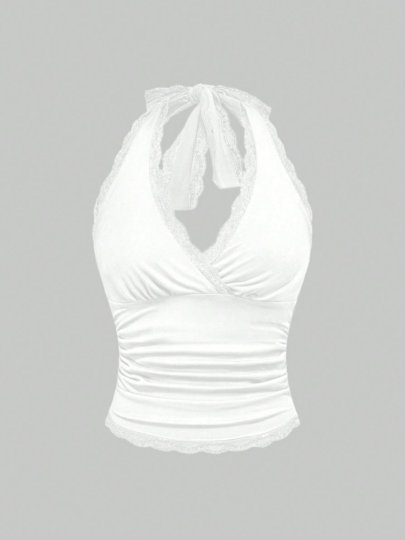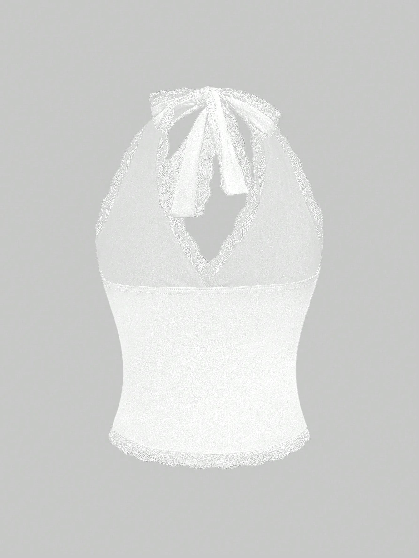 بلوزة روموي غرانج بانك Y2K دانتيل مرقعة مطوية ضيقة بياقة هالتر بدون أكمام