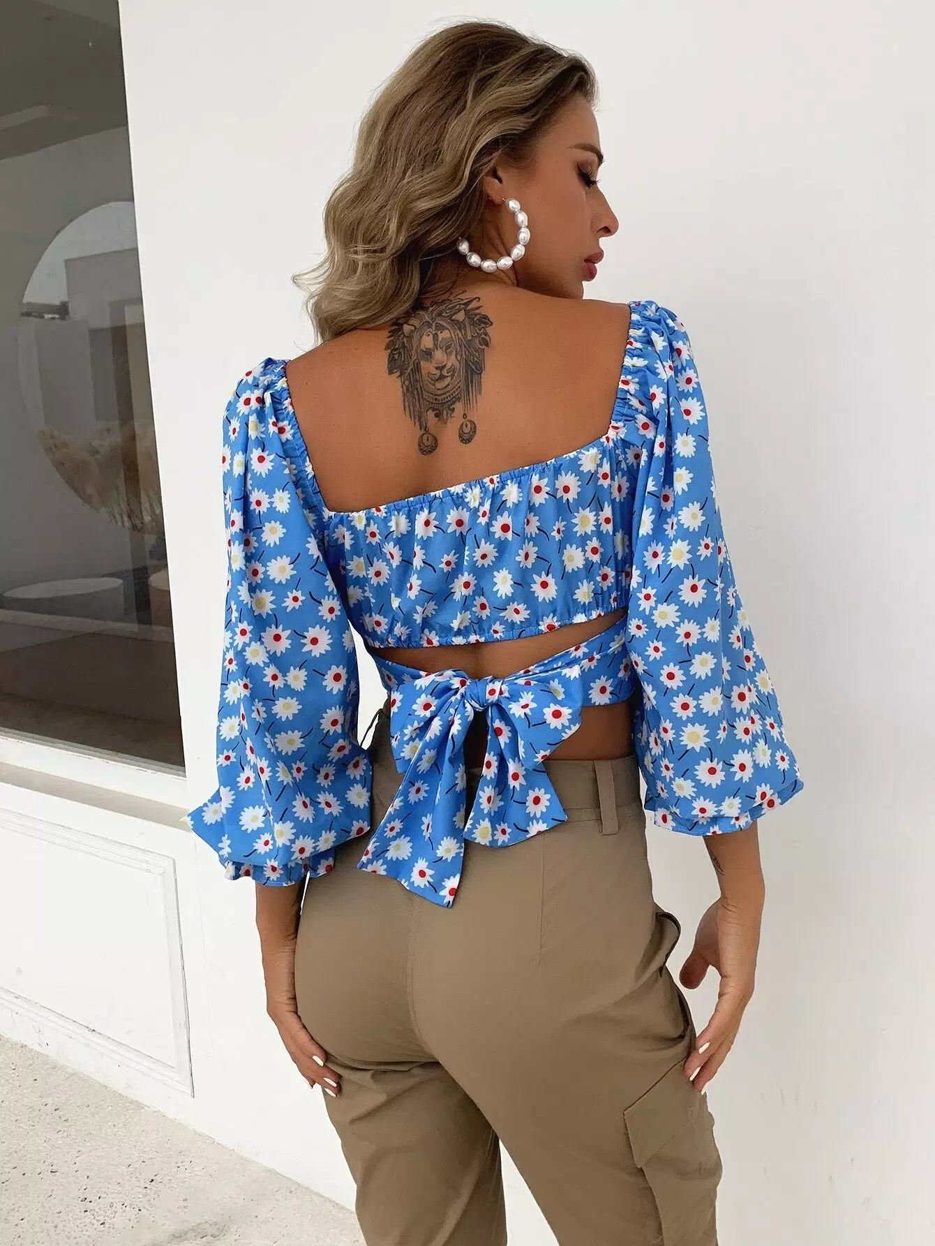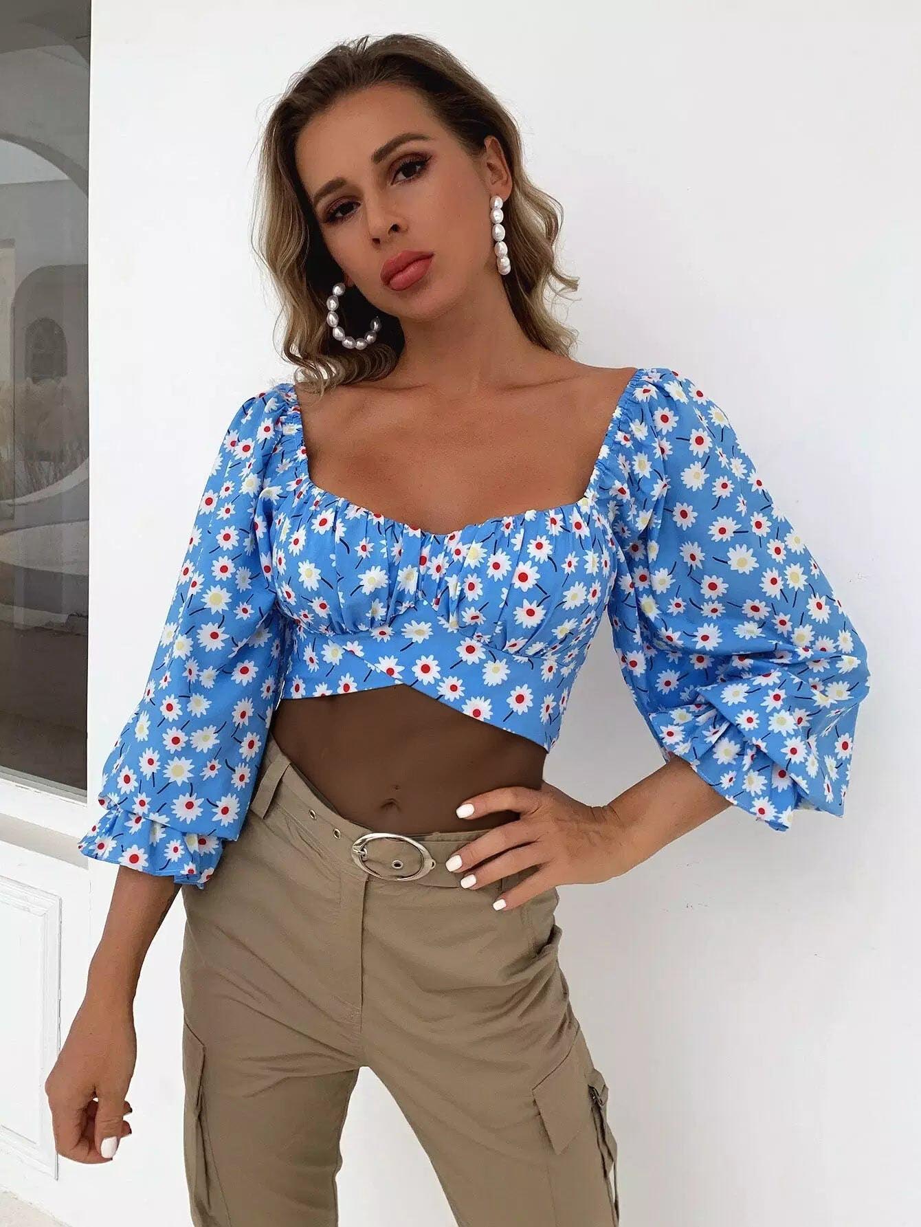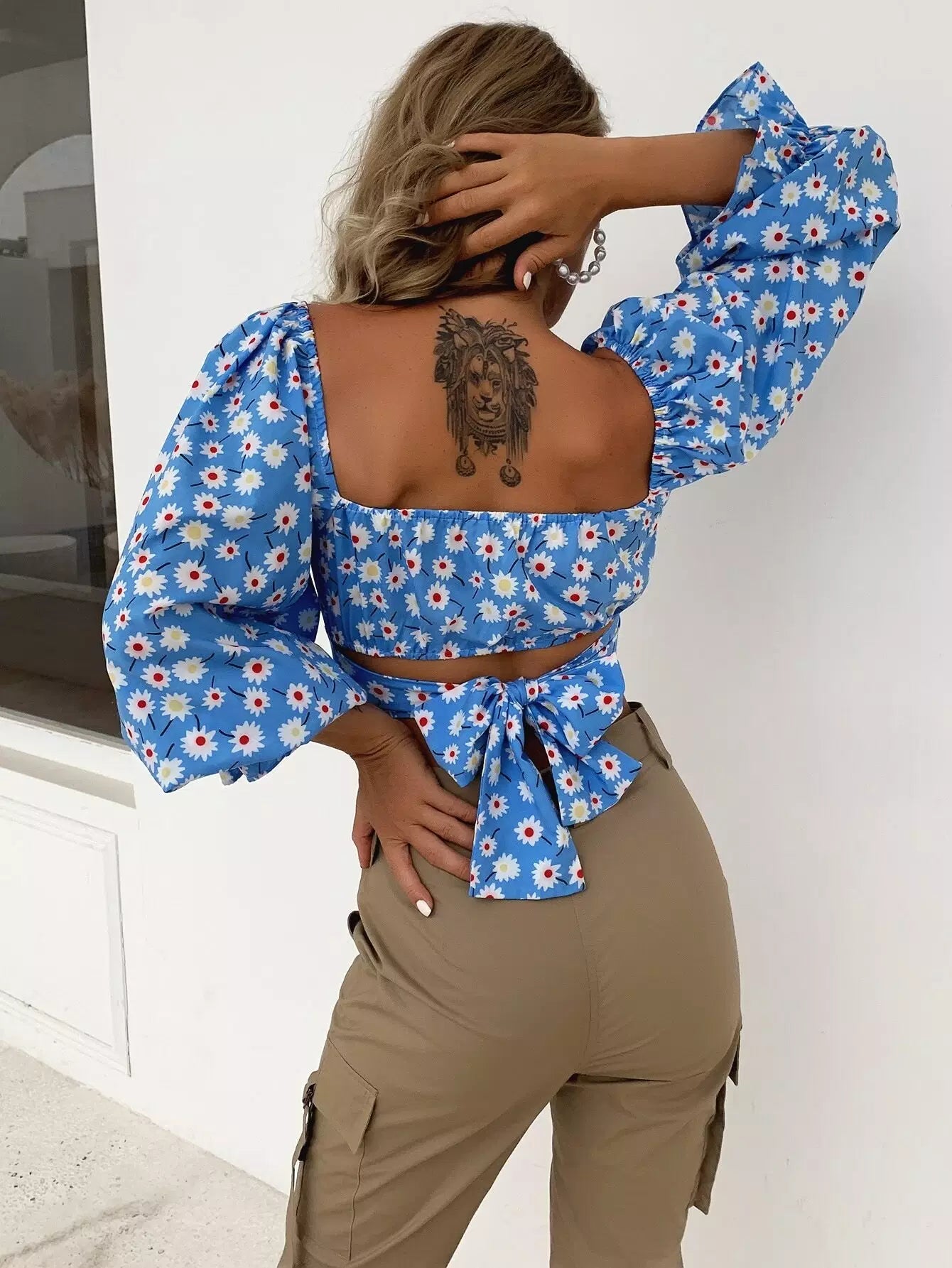 بلوزة قصيرة ذات أكمام زهرية بأكمام مكشكشة على الصدر وربطة عنق على الظهر