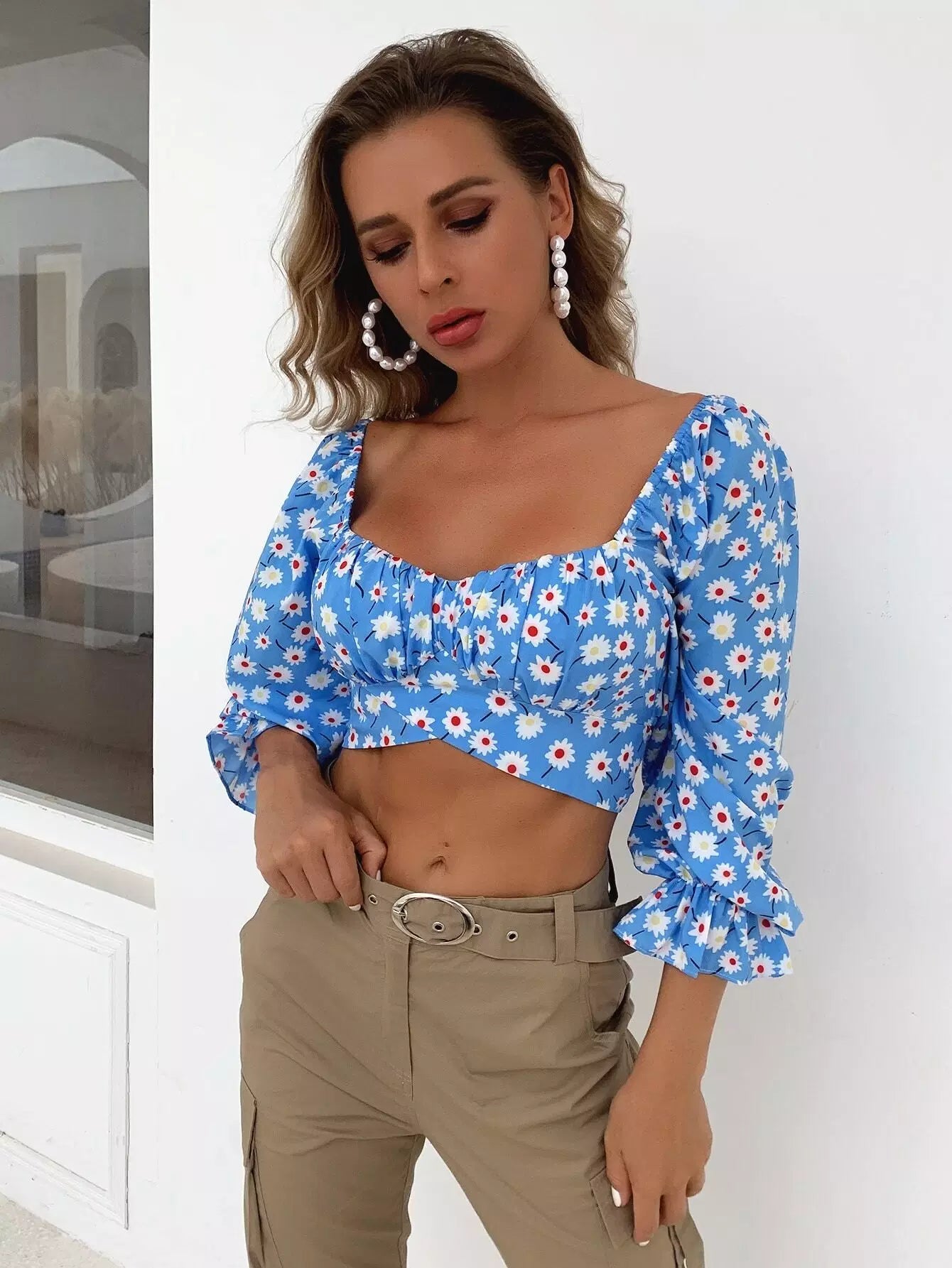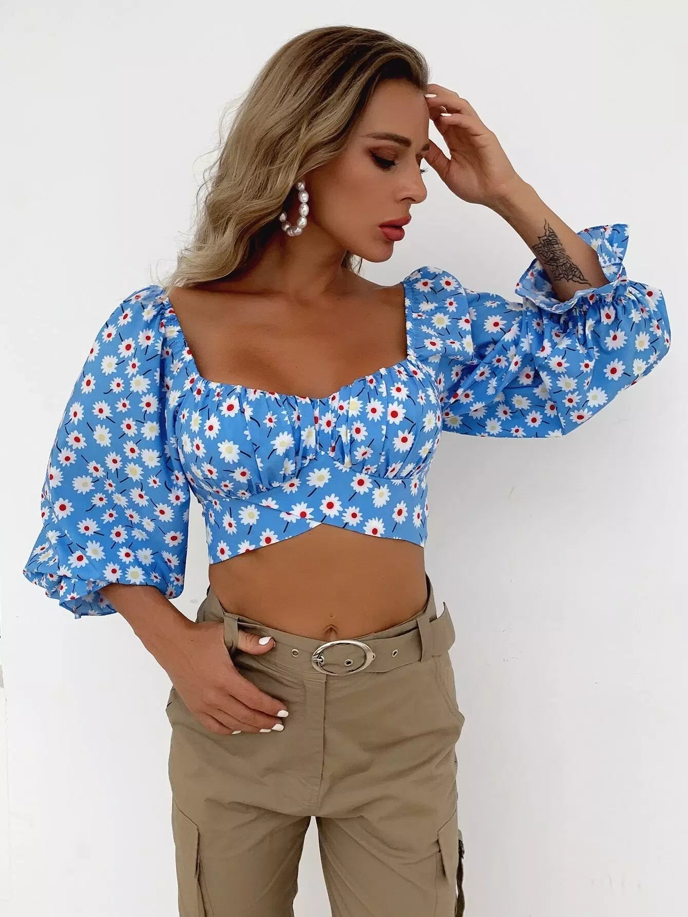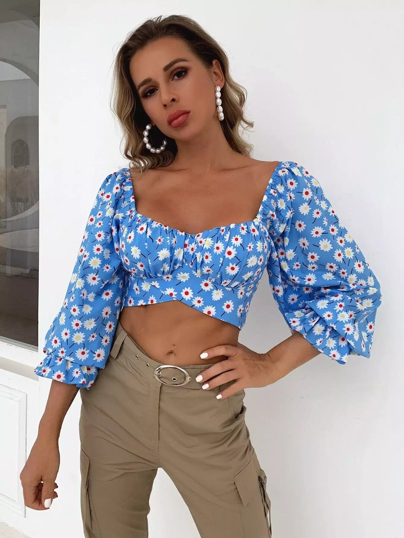 بلوزة قصيرة ذات أكمام زهرية بأكمام مكشكشة على الصدر وربطة عنق على الظهر