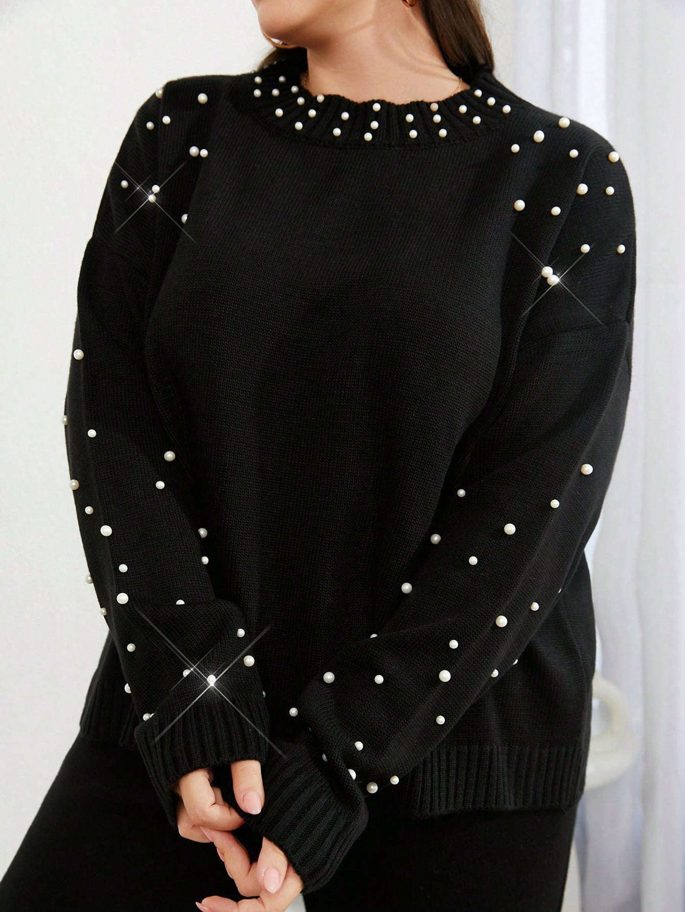 طقم من رو شيك بمقاسات كبيرة، يتكون من كنزة بياقة عالية وأكمام طويلة مزينة باللؤلؤ وبنطال صوفي.