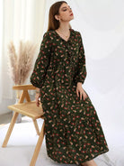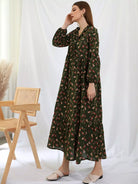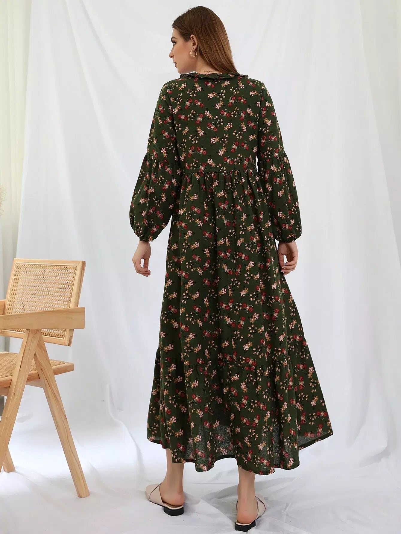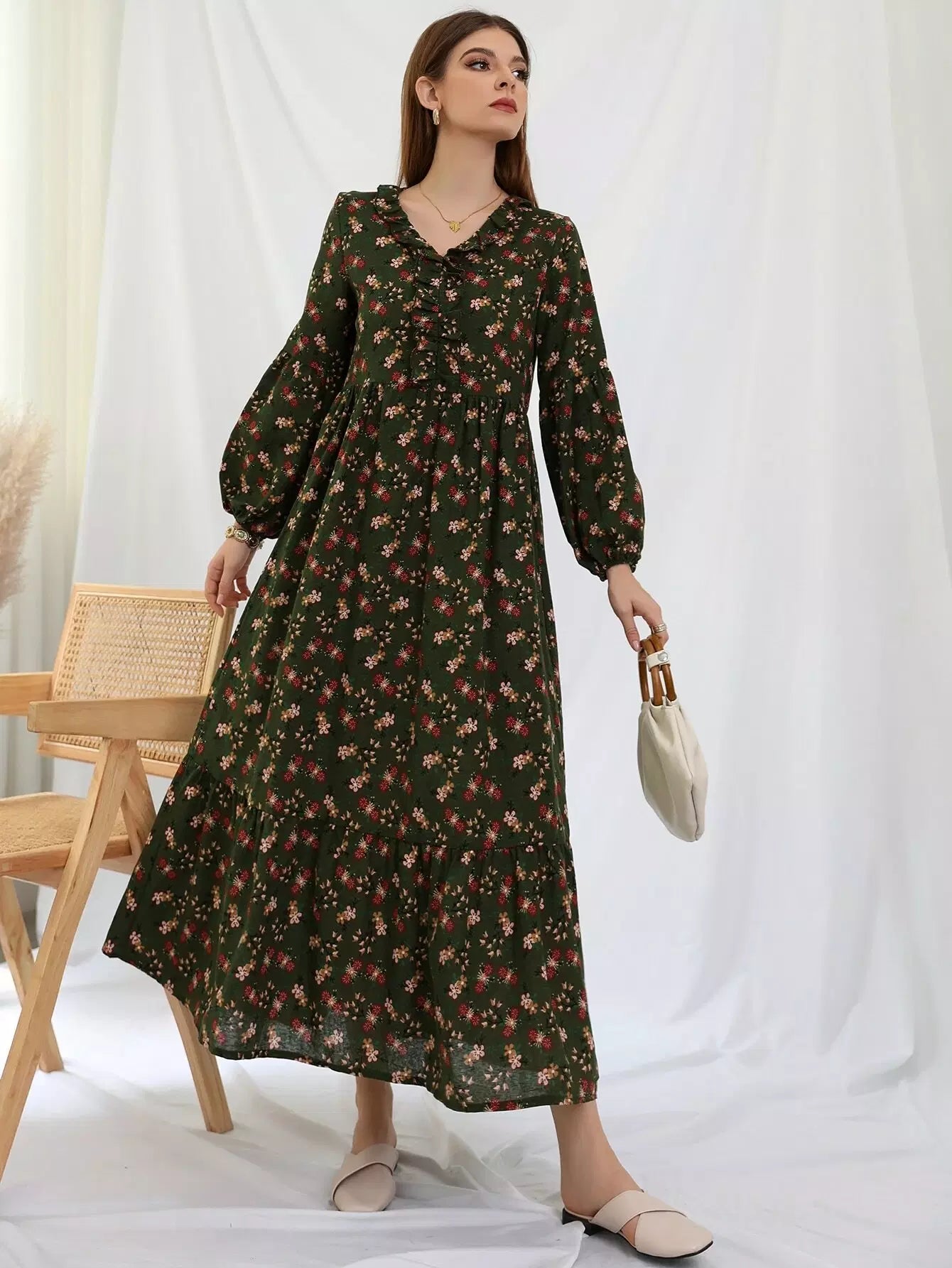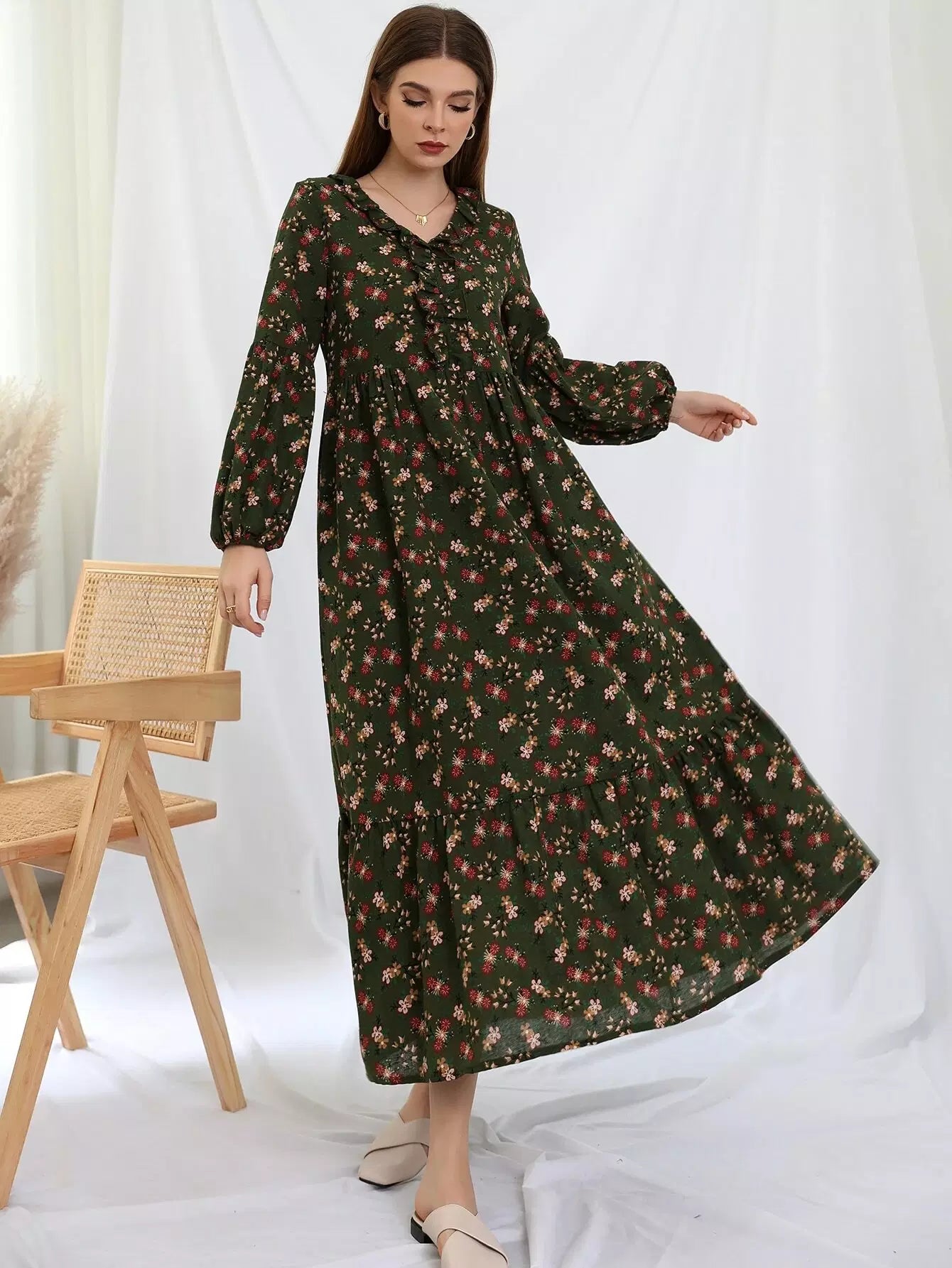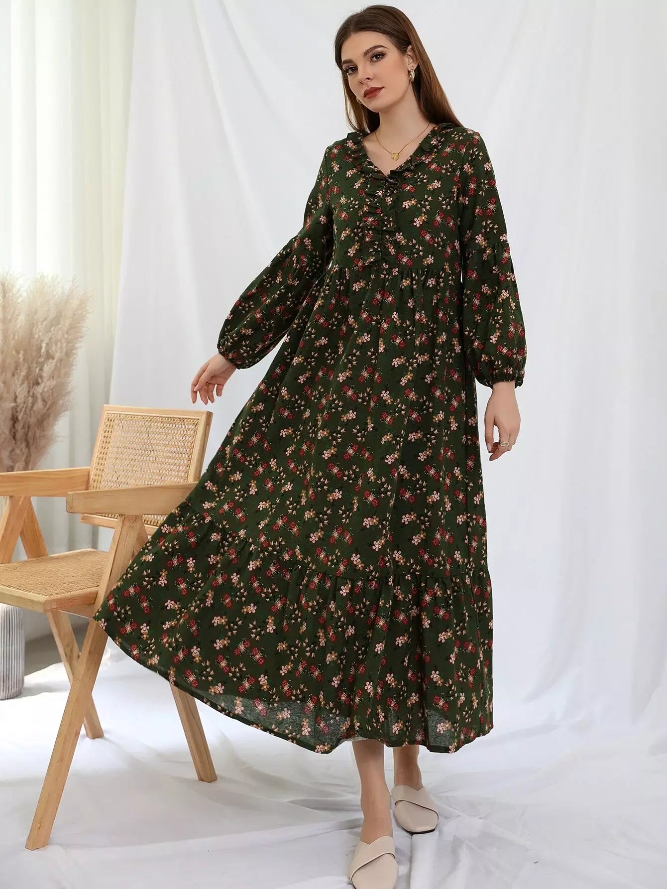 فستان بطبعة زهور صغيرة مع حواف مكشكشة