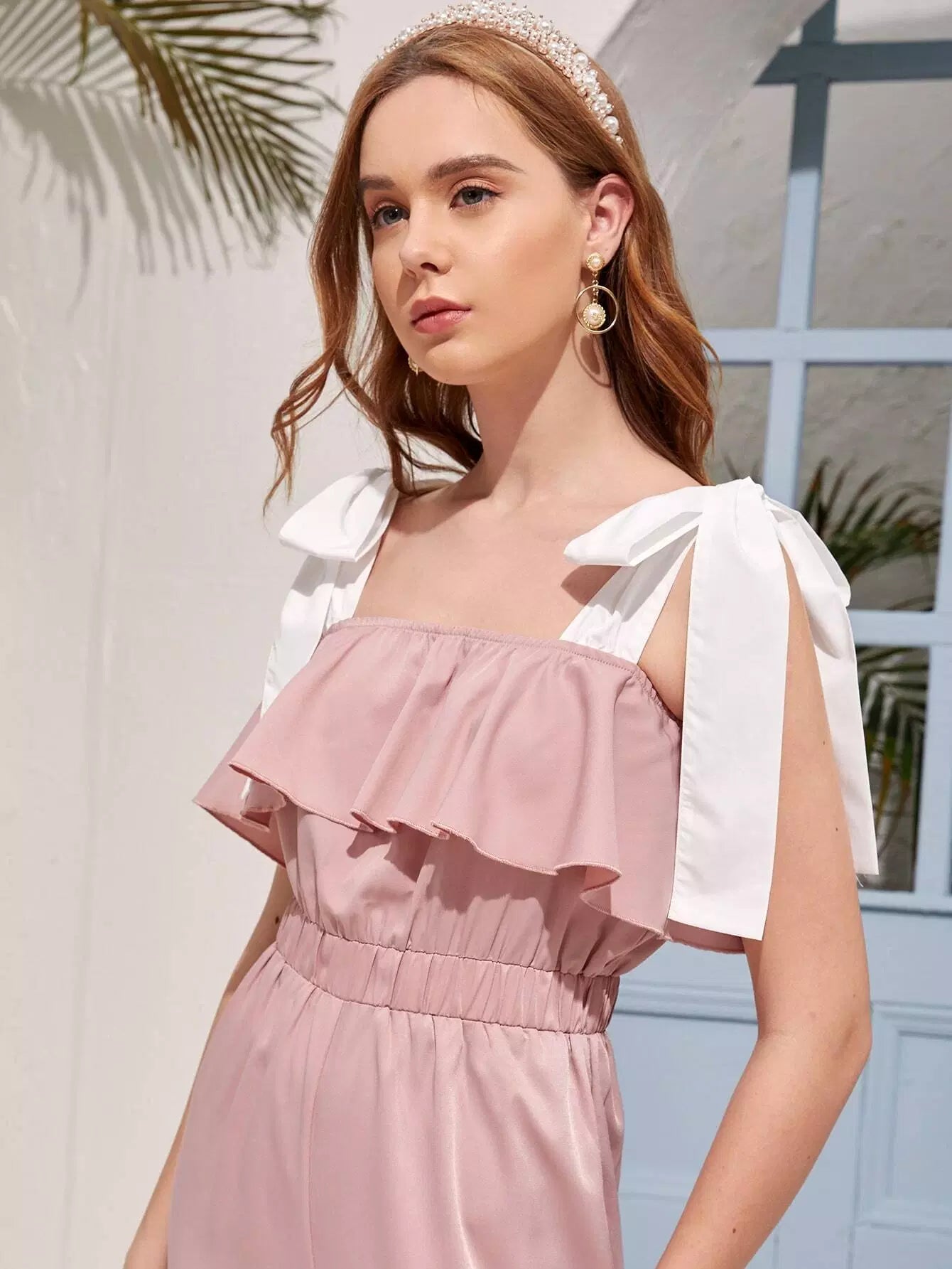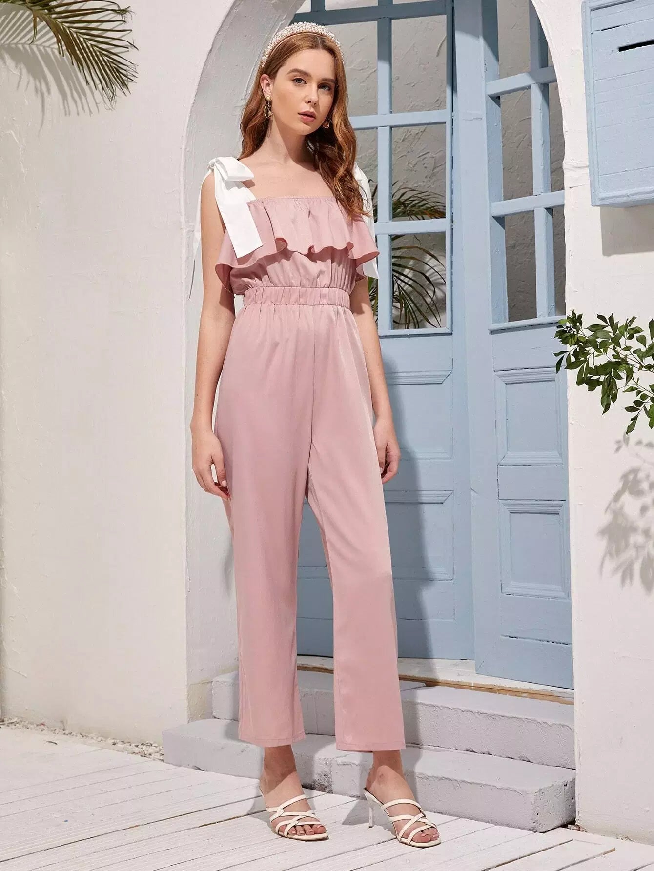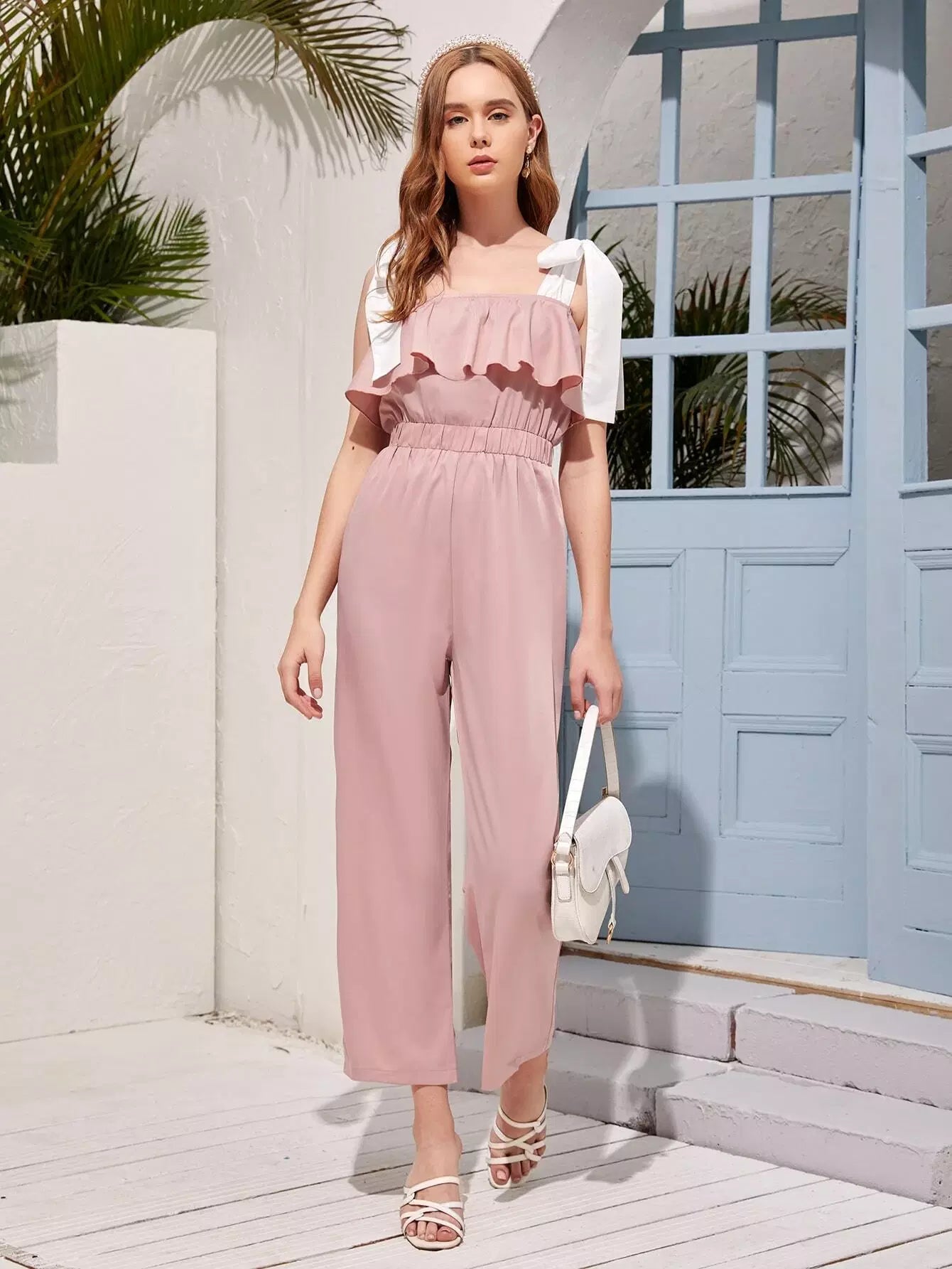 جمبسوت بحمالات مزينة بكشكشة وعقدة