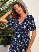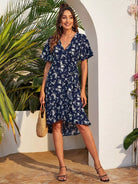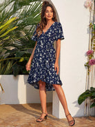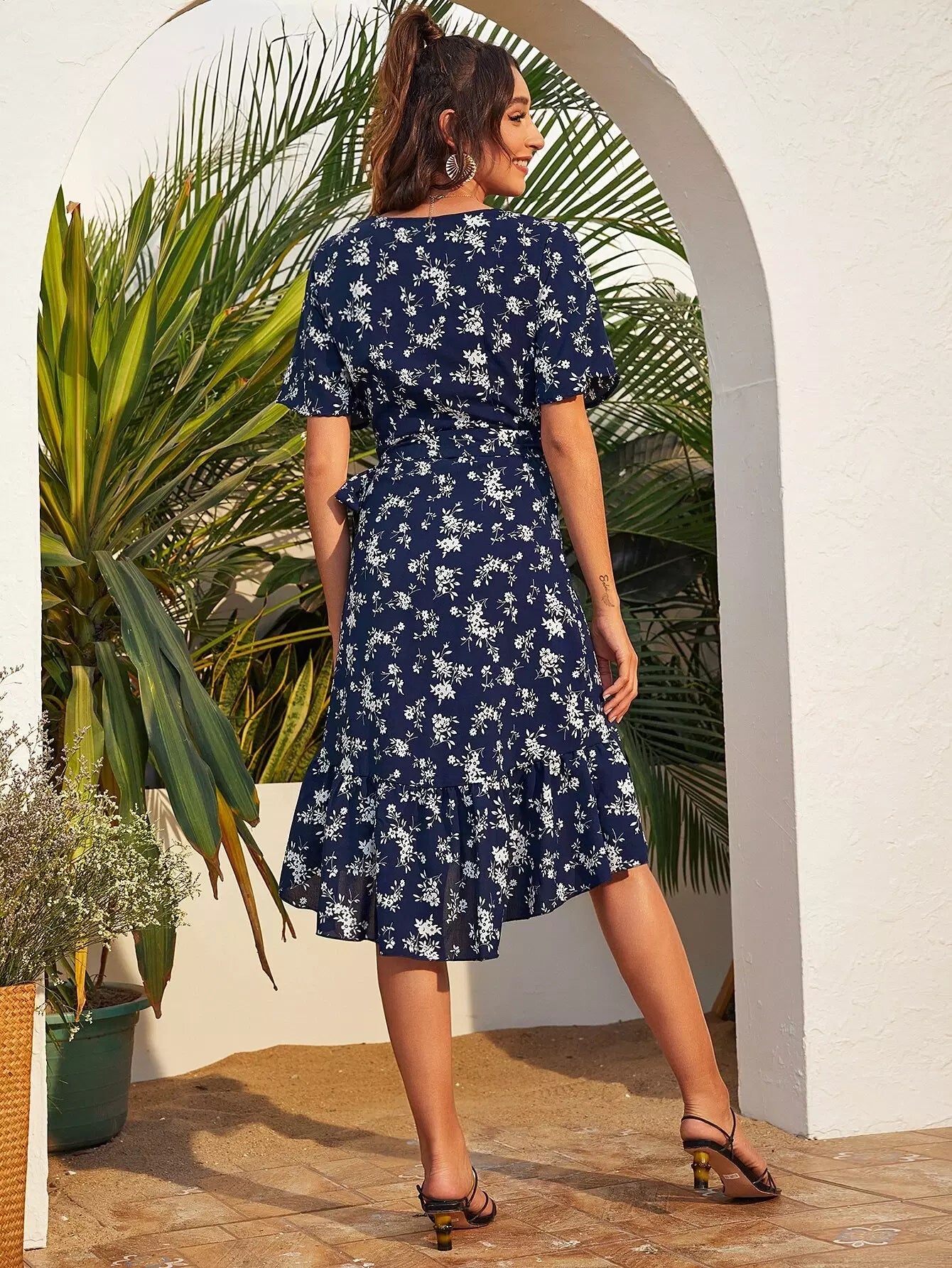 فستان بطبعة زهور ملفوف وبحواف مكشكشة بدون حزام