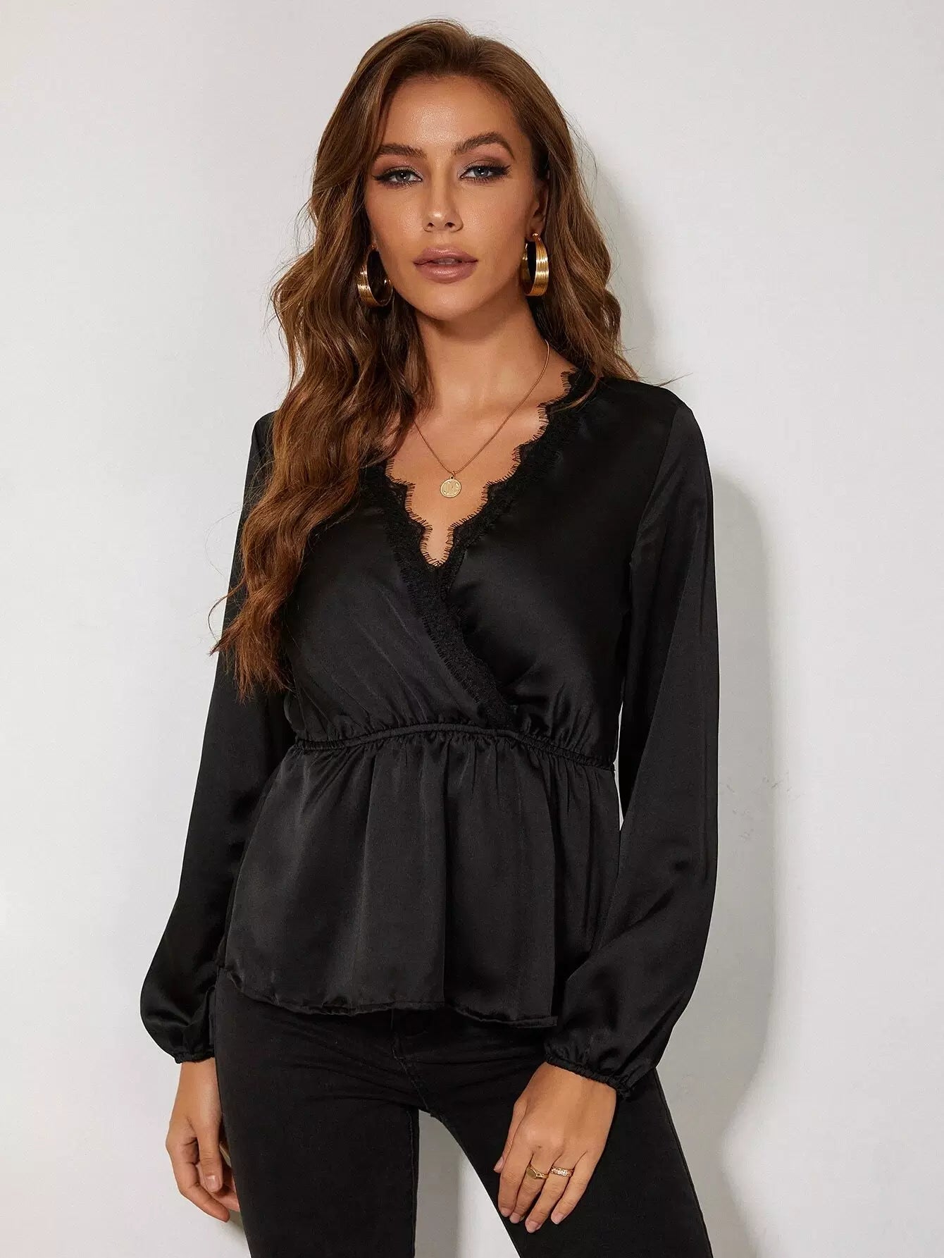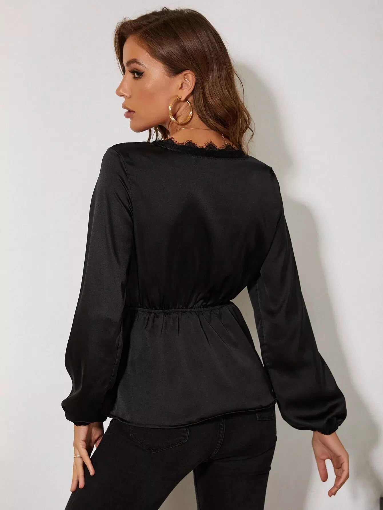 بلوزة بأكمام من الدانتيل الساتان بلون ساتان بلون مغاير من الدانتيل