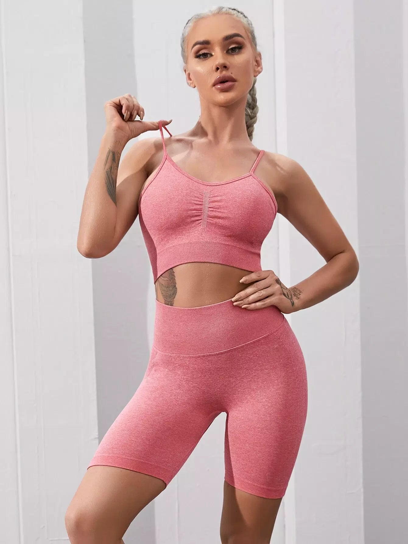 حمالة صدر رياضية مكشكشة من الأمام بدون خياطة وشورت رياضي قصير