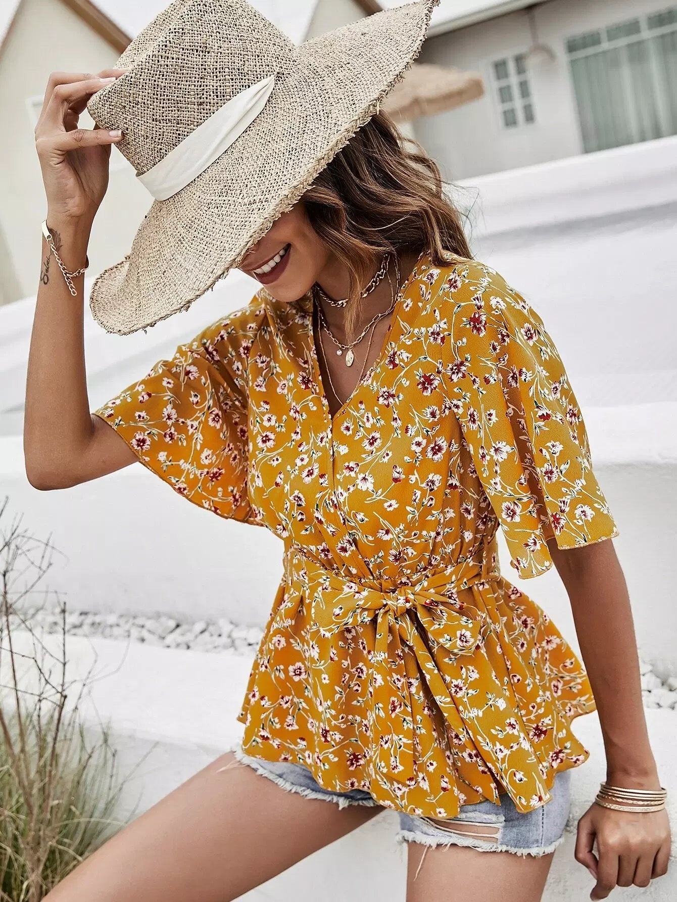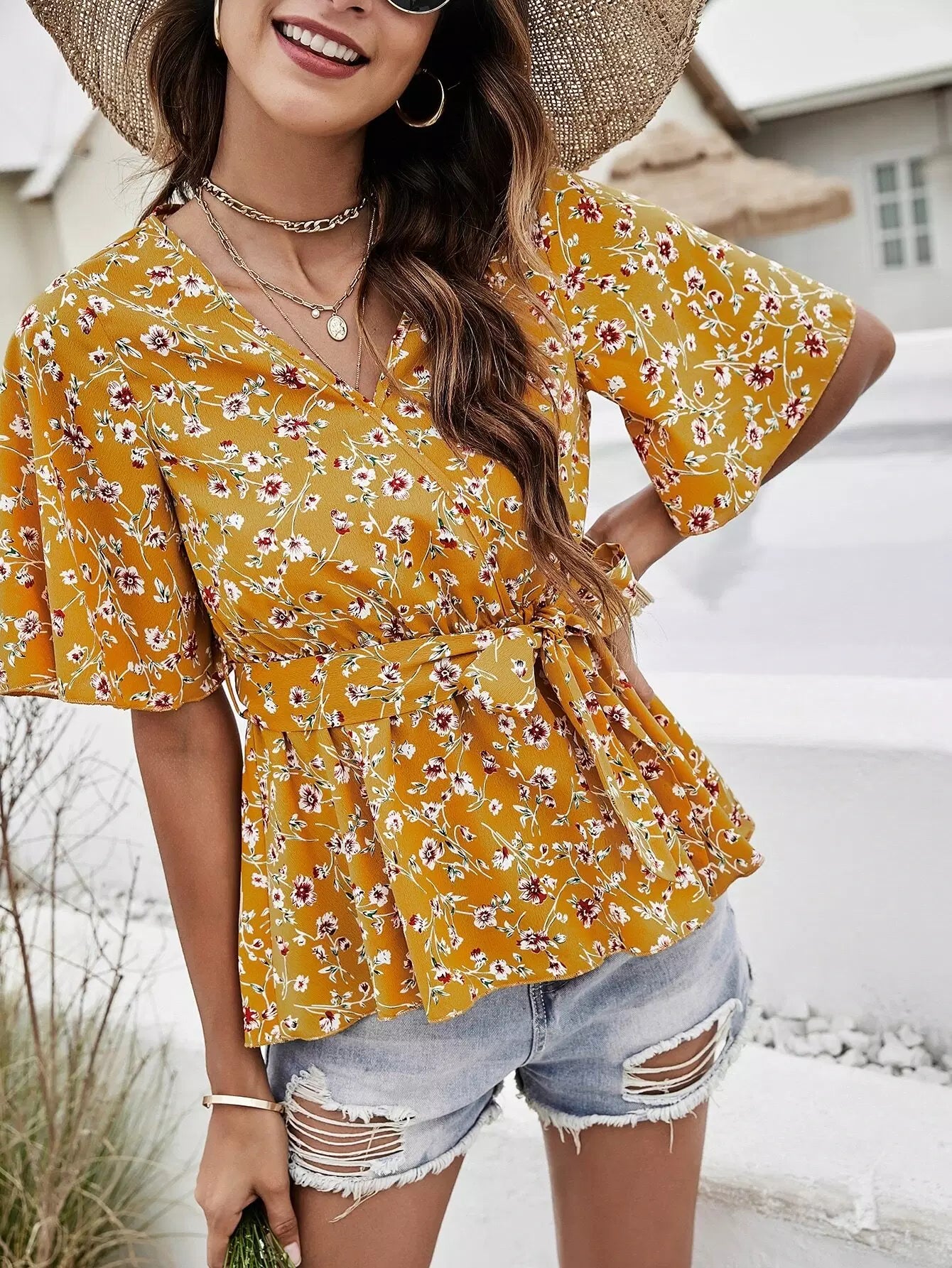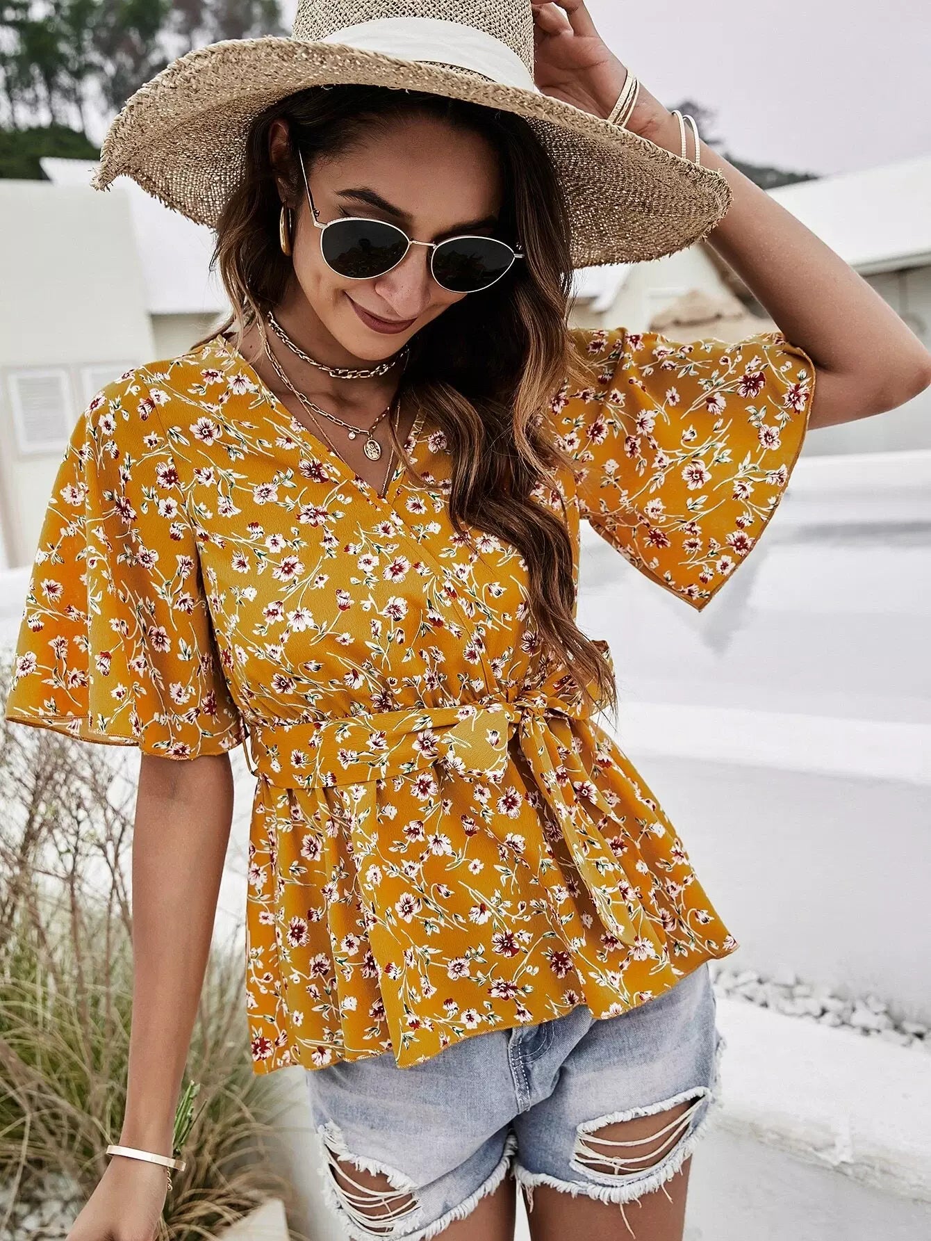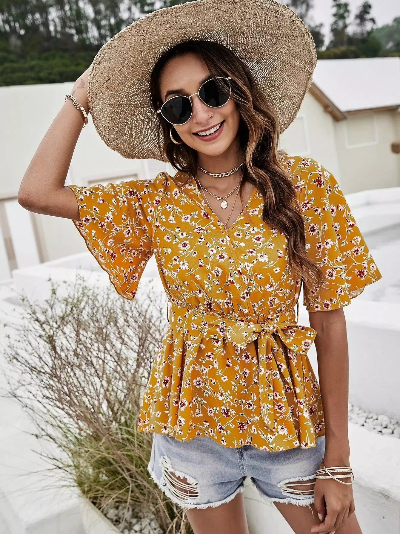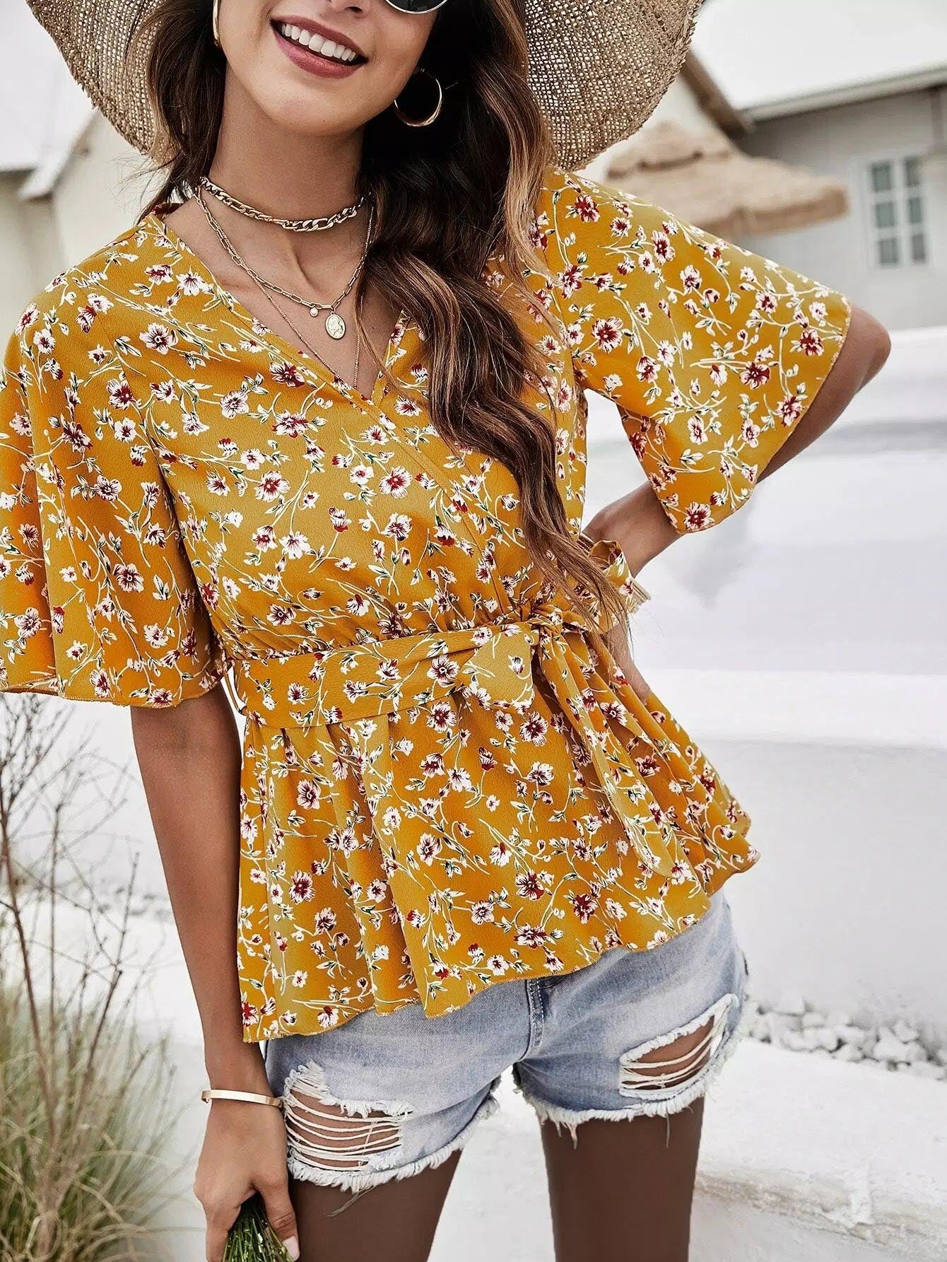 بلوزة زهرية ذاتية بدون حزام